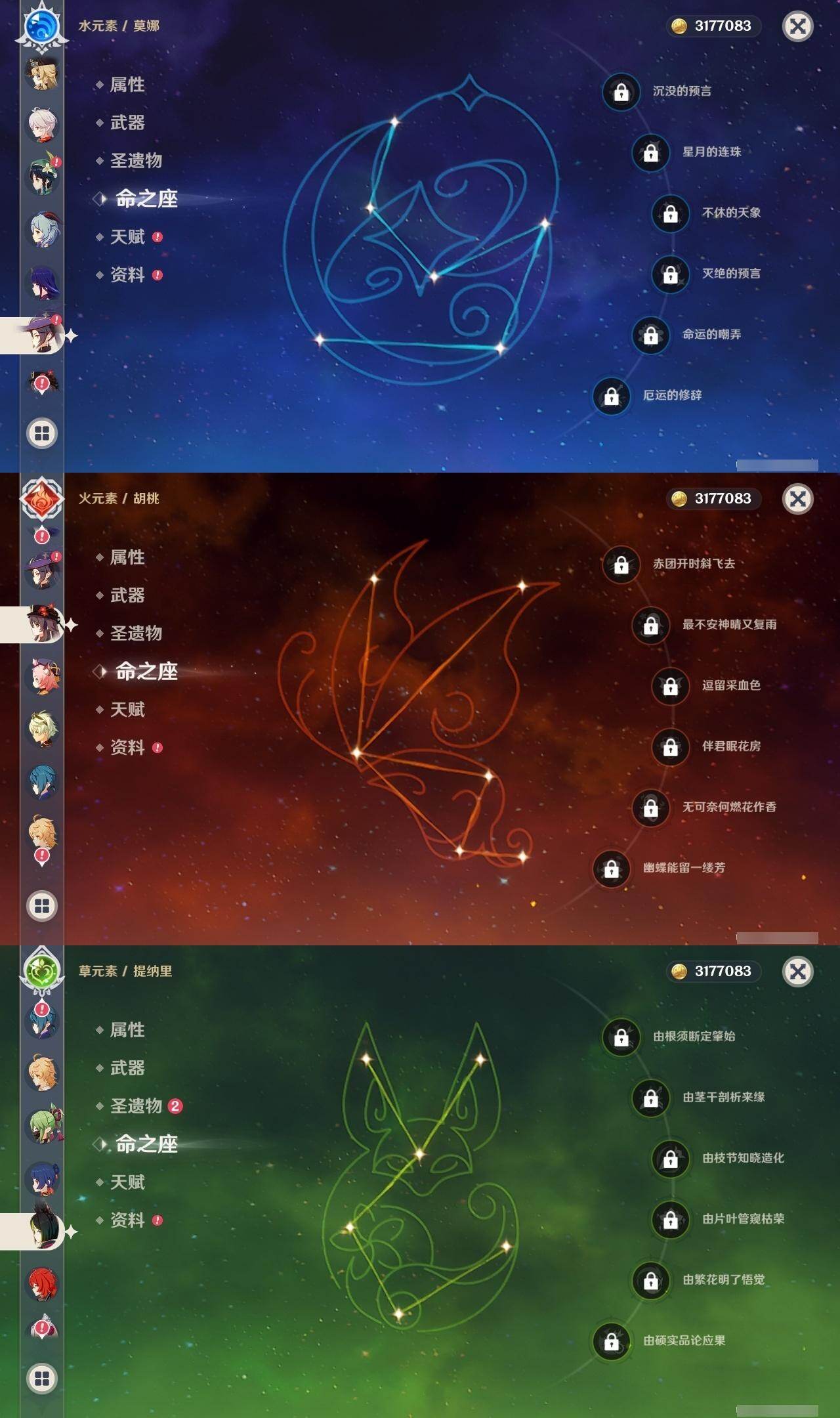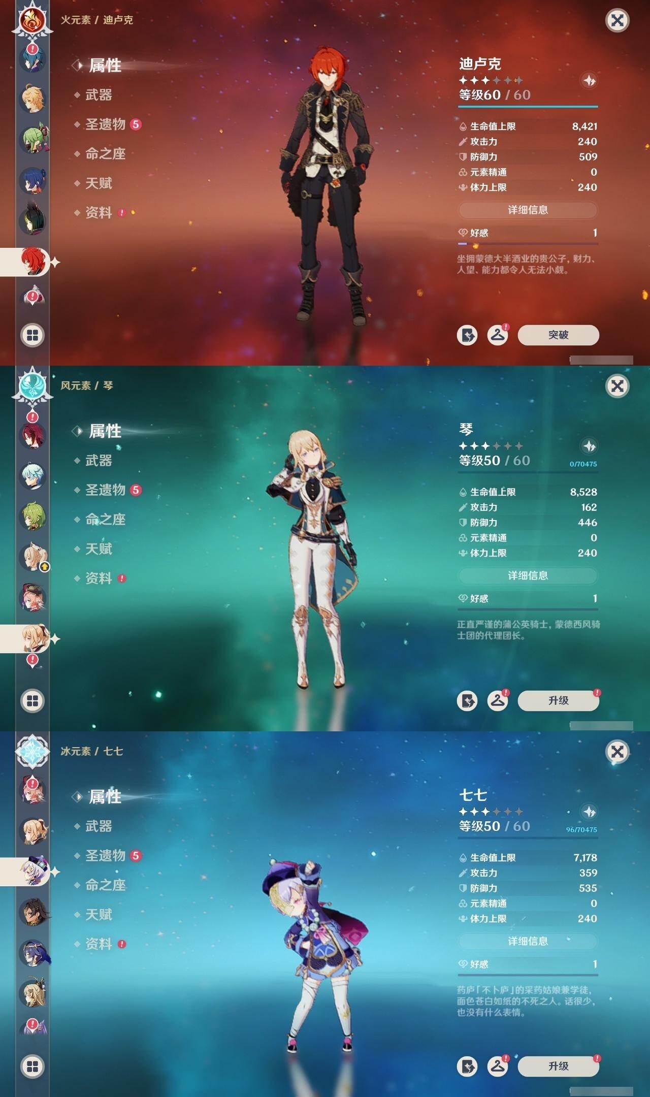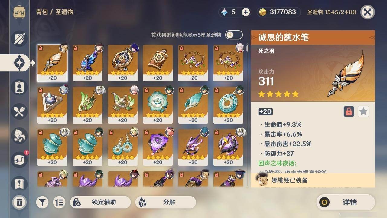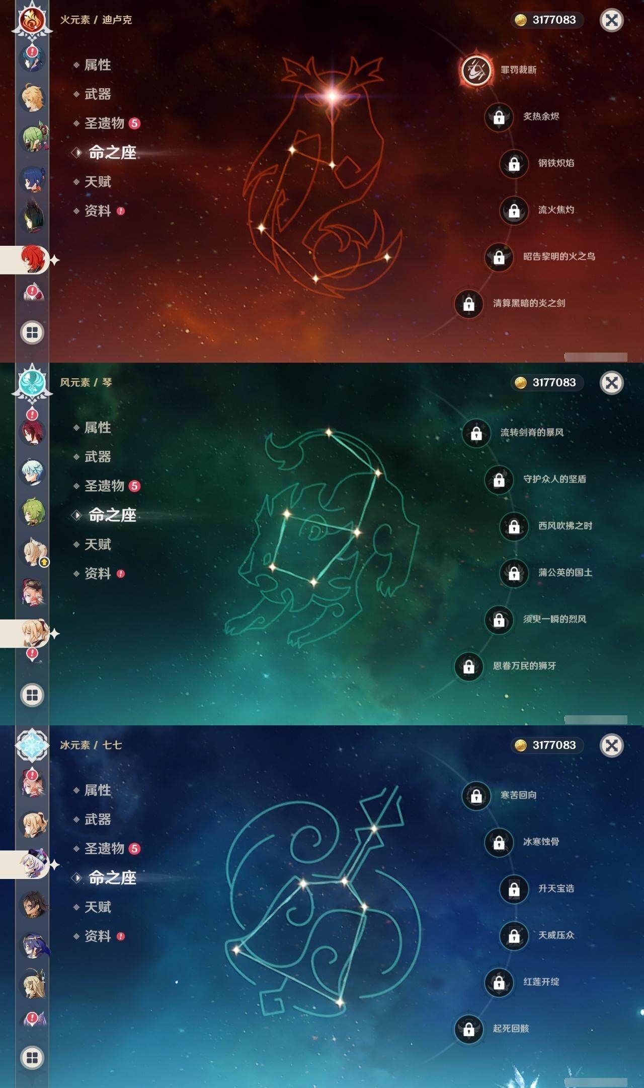 0命娜维娅,0命林尼,2命迪希雅,0命流浪者,0命纳西妲,0命提纳里,0命雷电将军,0命枫原万叶,0命胡桃,0命甘雨,0命魈,0命温迪,0命刻晴,0命七七,0命琴,0命莫娜,1命迪卢克,精1裁断,精1和璞鸢,精1天空之翼,精1风鹰剑