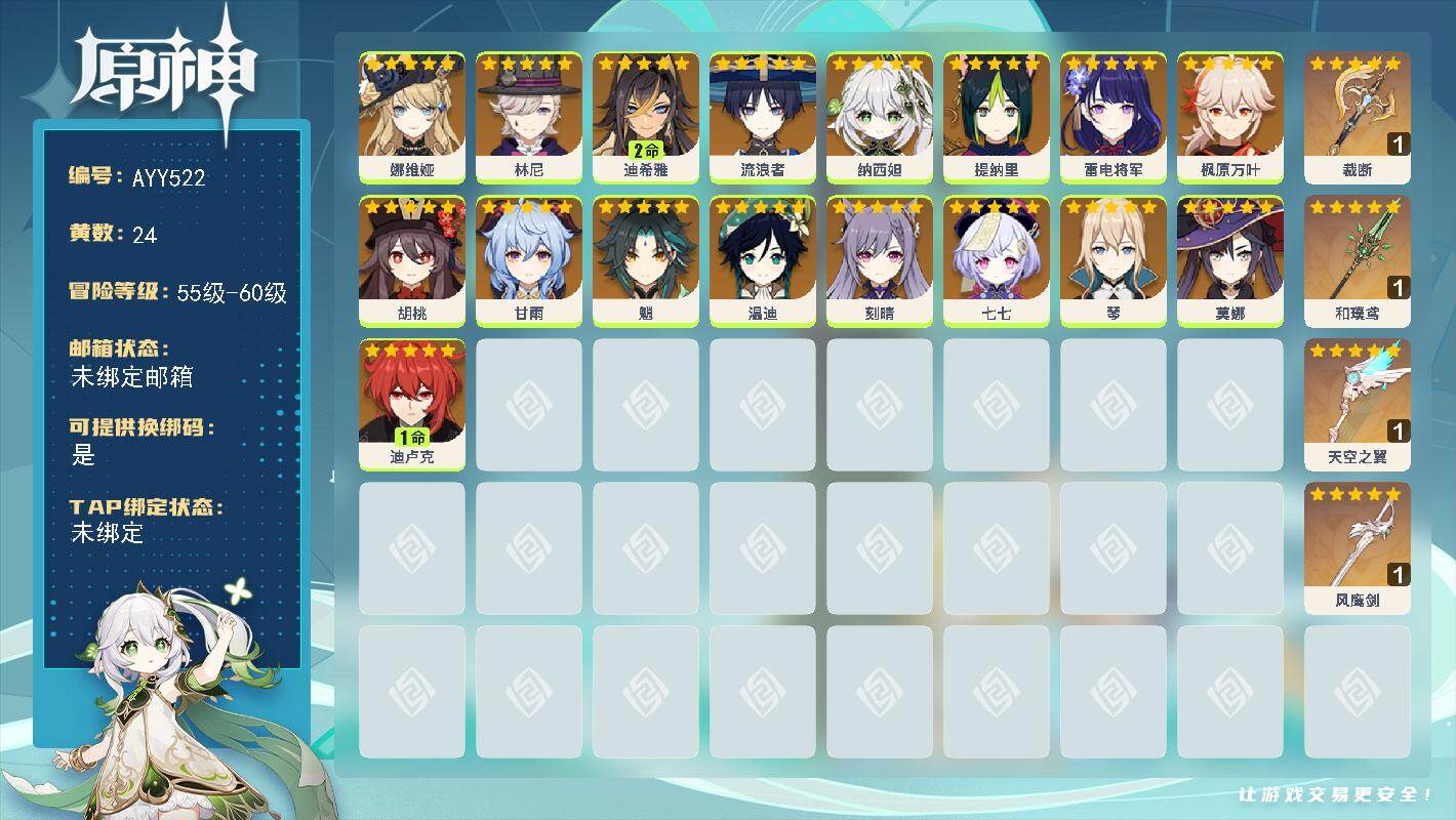 [16678312]58级/24黄/男主/17个五星角色/4个五星武器 0命娜维娅,0命林尼,2命迪希雅,0命流浪者,0命纳西妲,0命提纳里,0命雷电将军,0命枫原万叶,0命胡桃,0命甘雨,0命魈,0命温迪,0命刻晴,0命七七,0命琴,0命莫娜,1命迪卢克,精1裁断,精1和璞鸢,精1天空之翼,精1风鹰剑