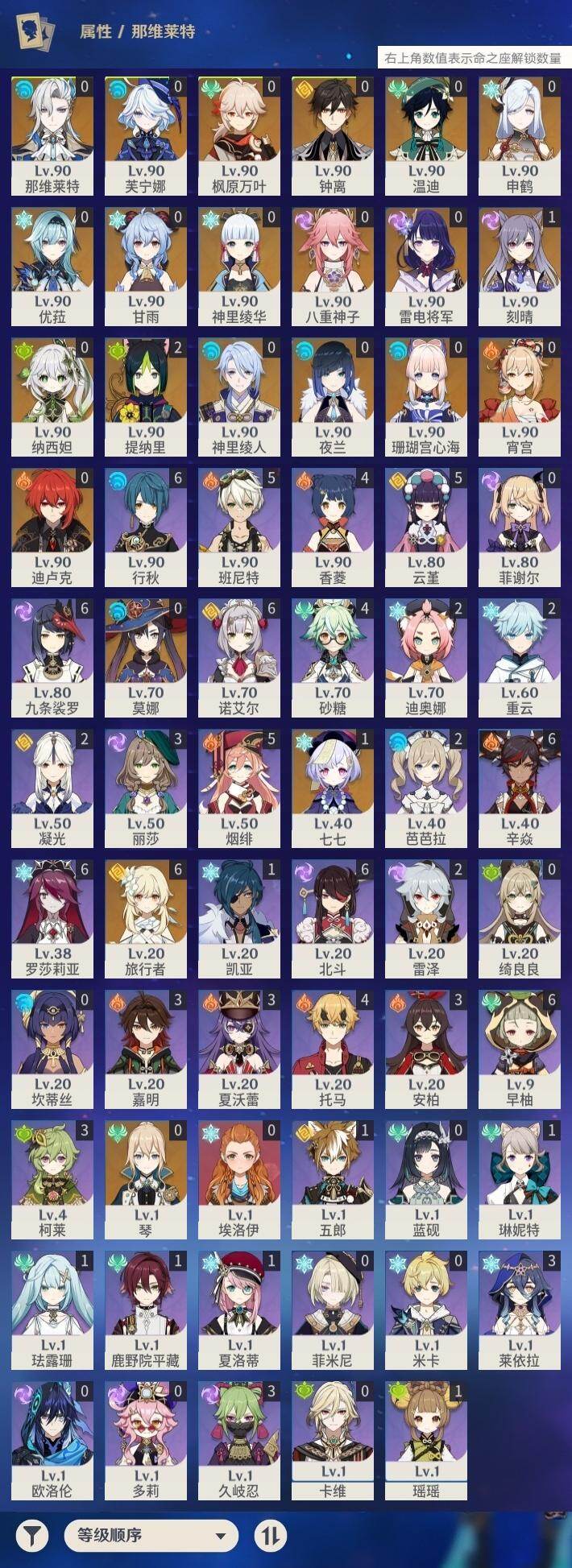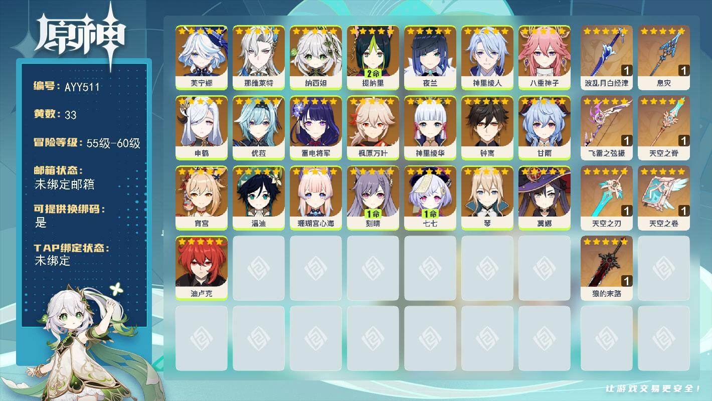 [16678239]60级/33黄/女主/22个五星角色/7个五星武器 0命芙宁娜,0命那维莱特,0命纳西妲,2命提纳里,0命夜兰,0命神里绫人,0命八重神子,0命申鹤,0命优菈,0命雷电将军,0命枫原万叶,0命神里绫华,0命钟离,0命甘雨,0命宵宫,0命温迪,0命珊瑚宫心海,1命刻晴,1命七七,0命琴,0命莫娜,0命迪卢克,精1波乱月白经津,精1息灾,精1飞雷之弦振,精1天空之脊,精1天空之刃,精1天空之卷,精1狼的末路