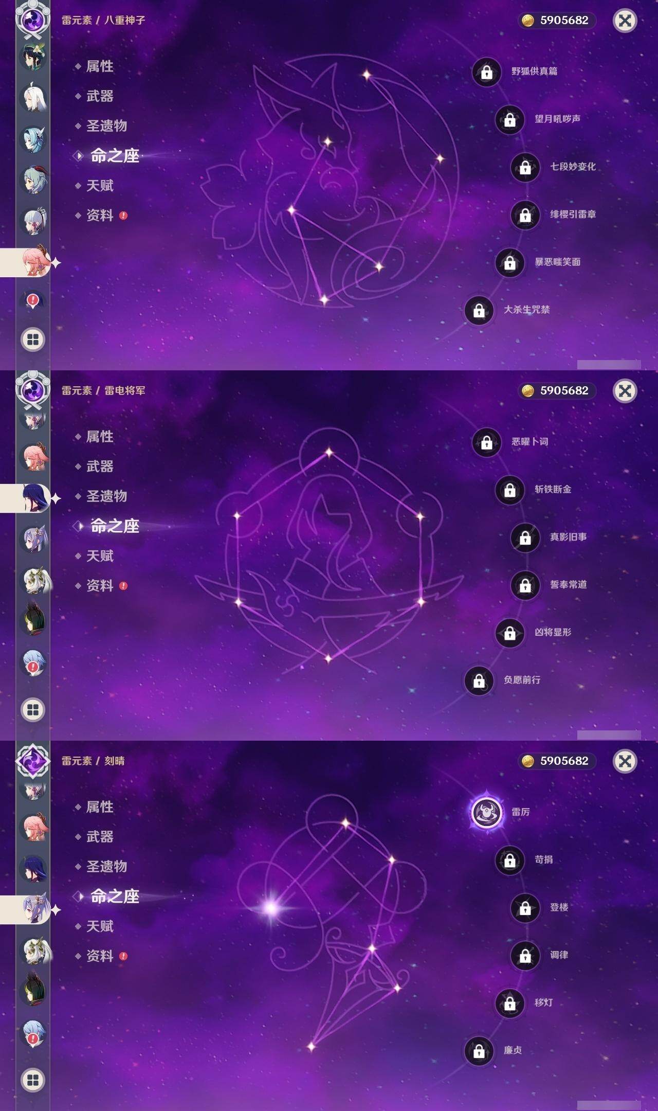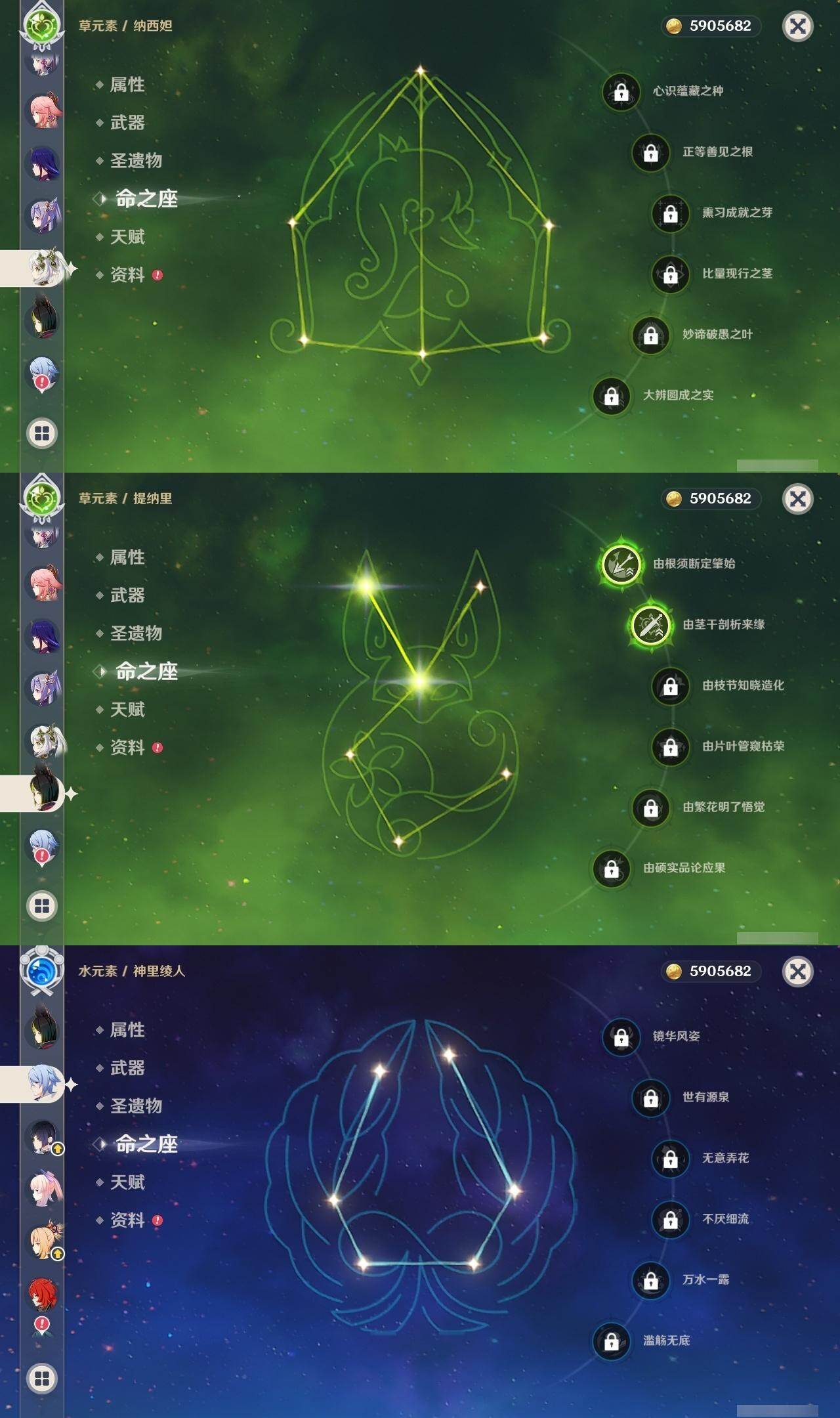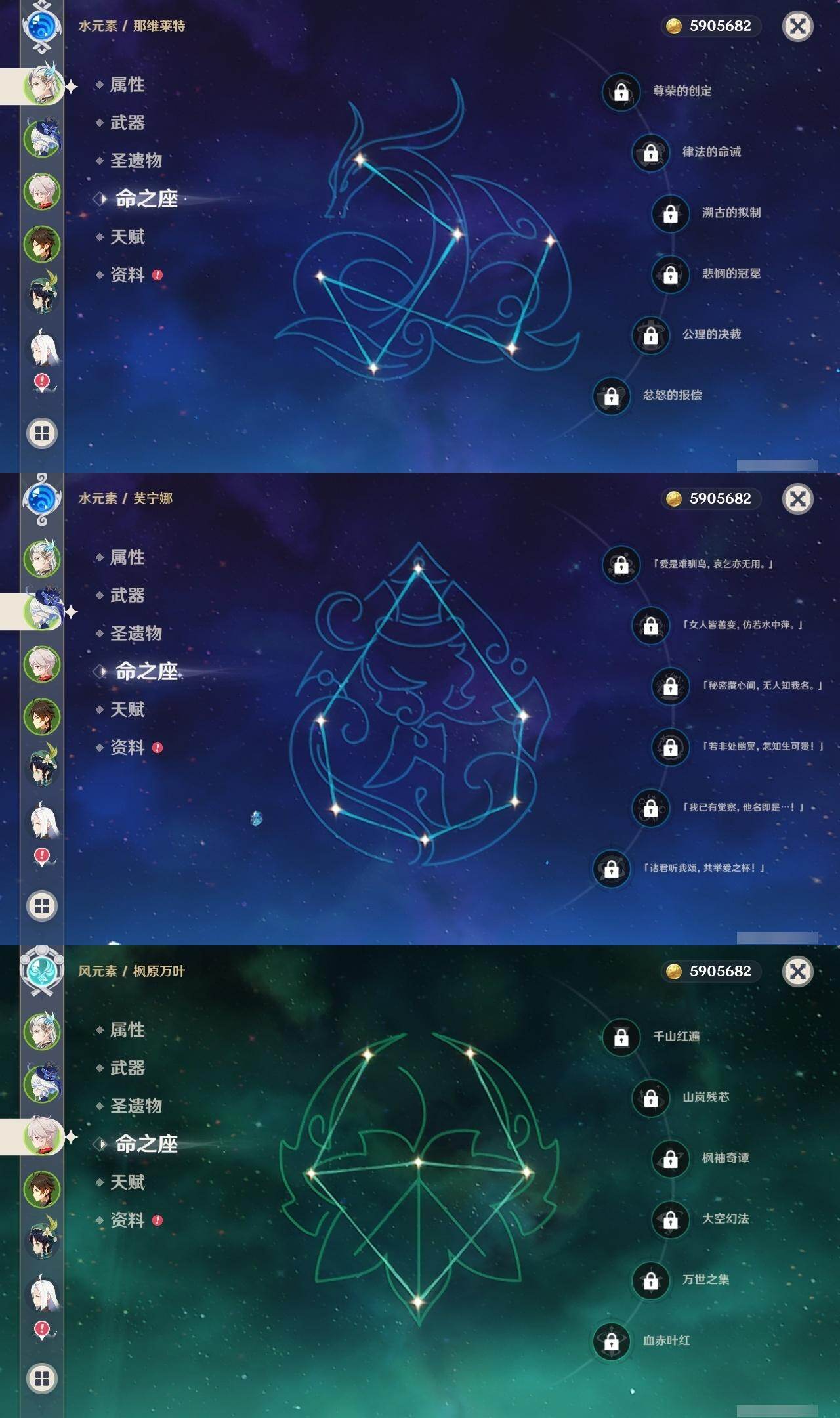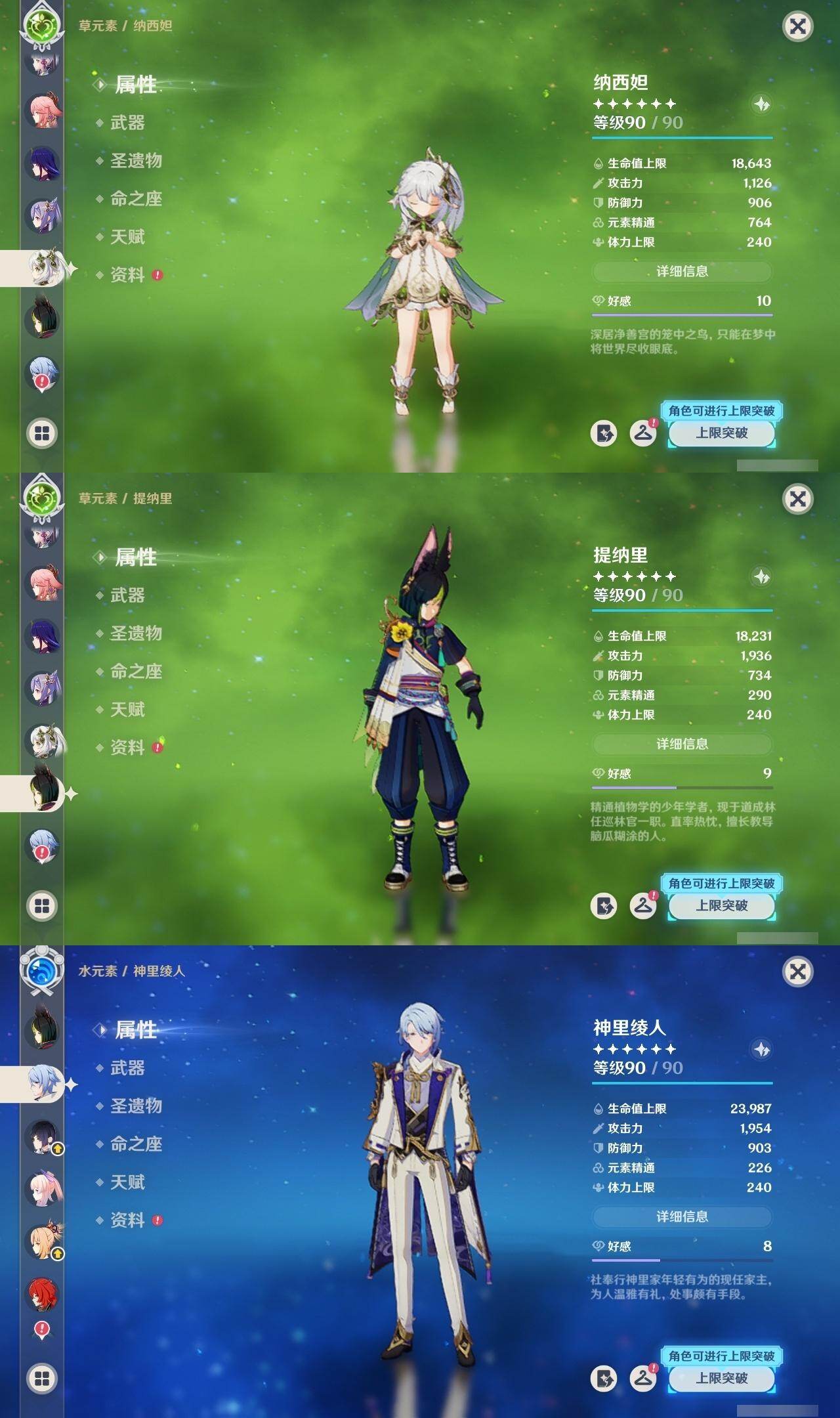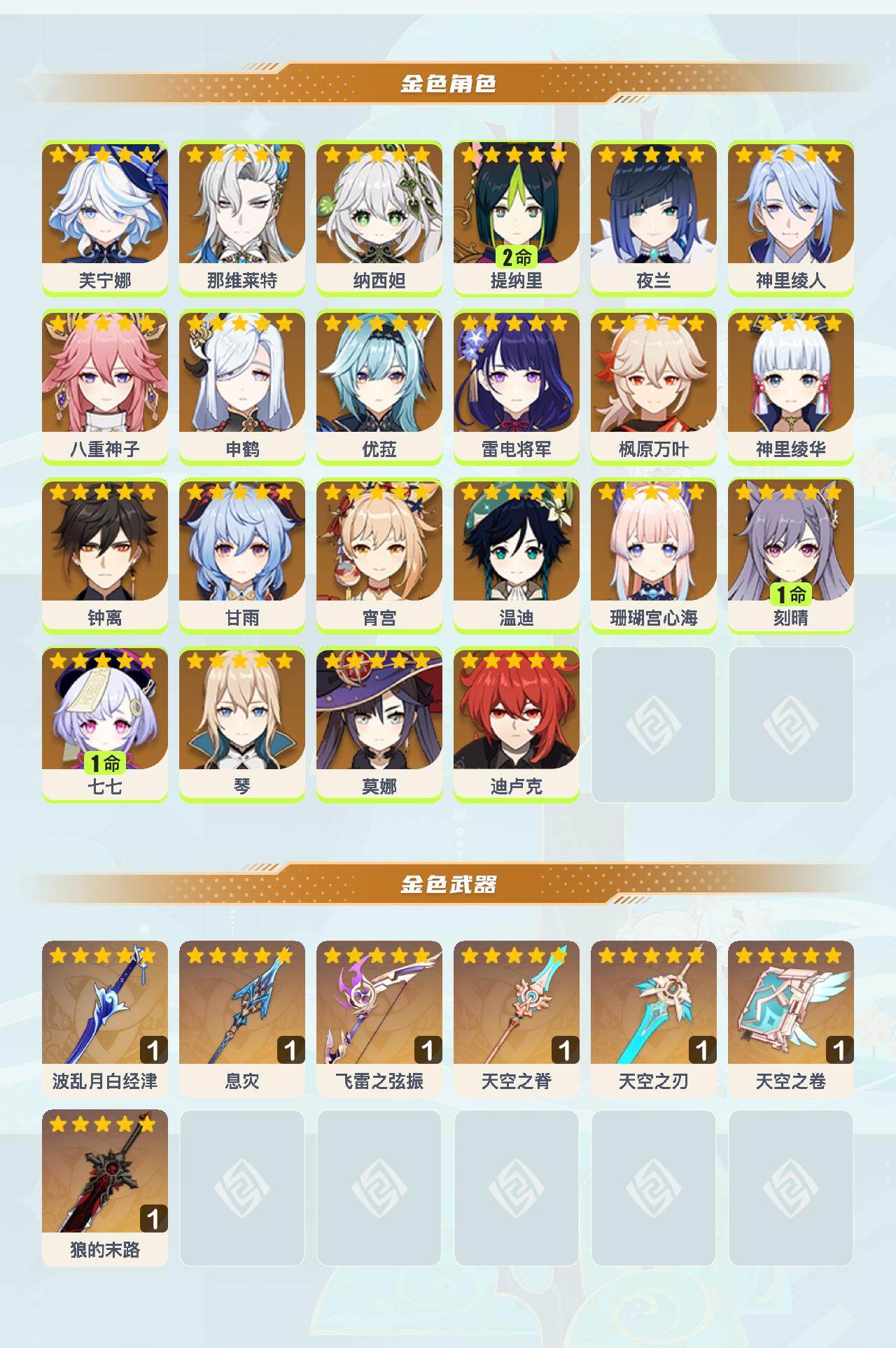 0命芙宁娜,0命那维莱特,0命纳西妲,2命提纳里,0命夜兰,0命神里绫人,0命八重神子,0命申鹤,0命优菈,0命雷电将军,0命枫原万叶,0命神里绫华,0命钟离,0命甘雨,0命宵宫,0命温迪,0命珊瑚宫心海,1命刻晴,1命七七,0命琴,0命莫娜,0命迪卢克,精1波乱月白经津,精1息灾,精1飞雷之弦振,精1天空之脊,精1天空之刃,精1天空之卷,精1狼的末路