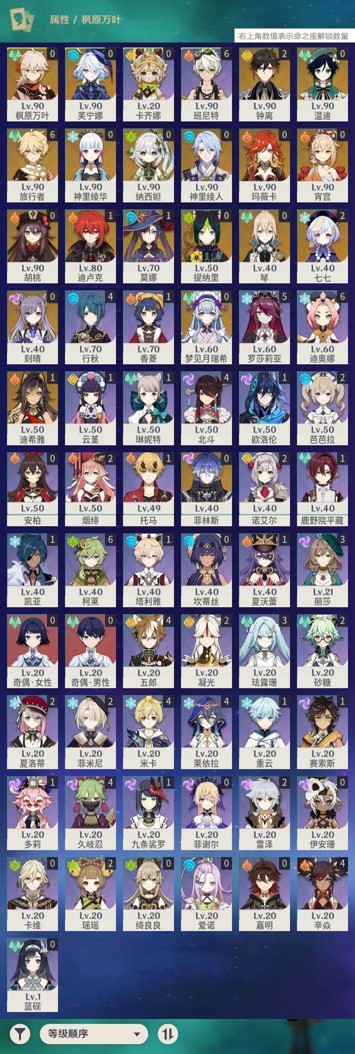 - [15583296]58级/27黄/女主/18个五星角色/2个五星武器 0命流浪者,0命夜兰,0命神里绫人,0命申鹤,0命优菈,0命雷电将军,0命枫原万叶,0命钟离,0命胡桃,1命甘雨,0命魈,0命宵宫,0命阿贝多,0命刻晴,0命七七,2命琴,4命莫娜,0命迪卢克,精1天空之翼,精1天空之傲
