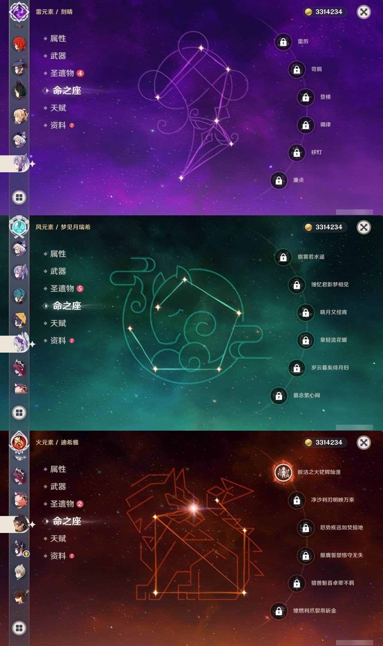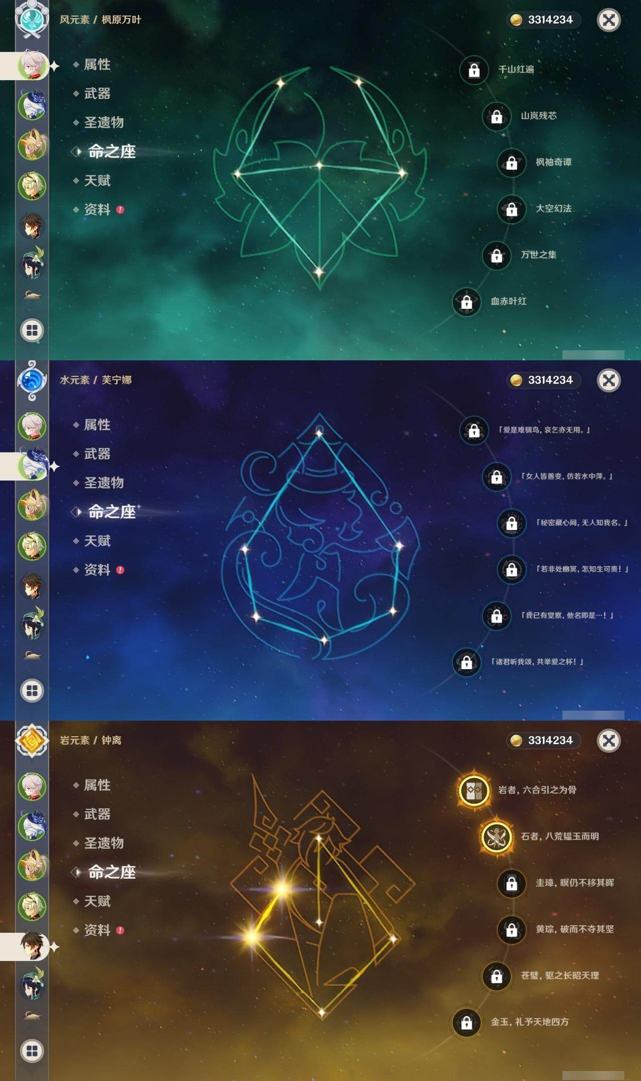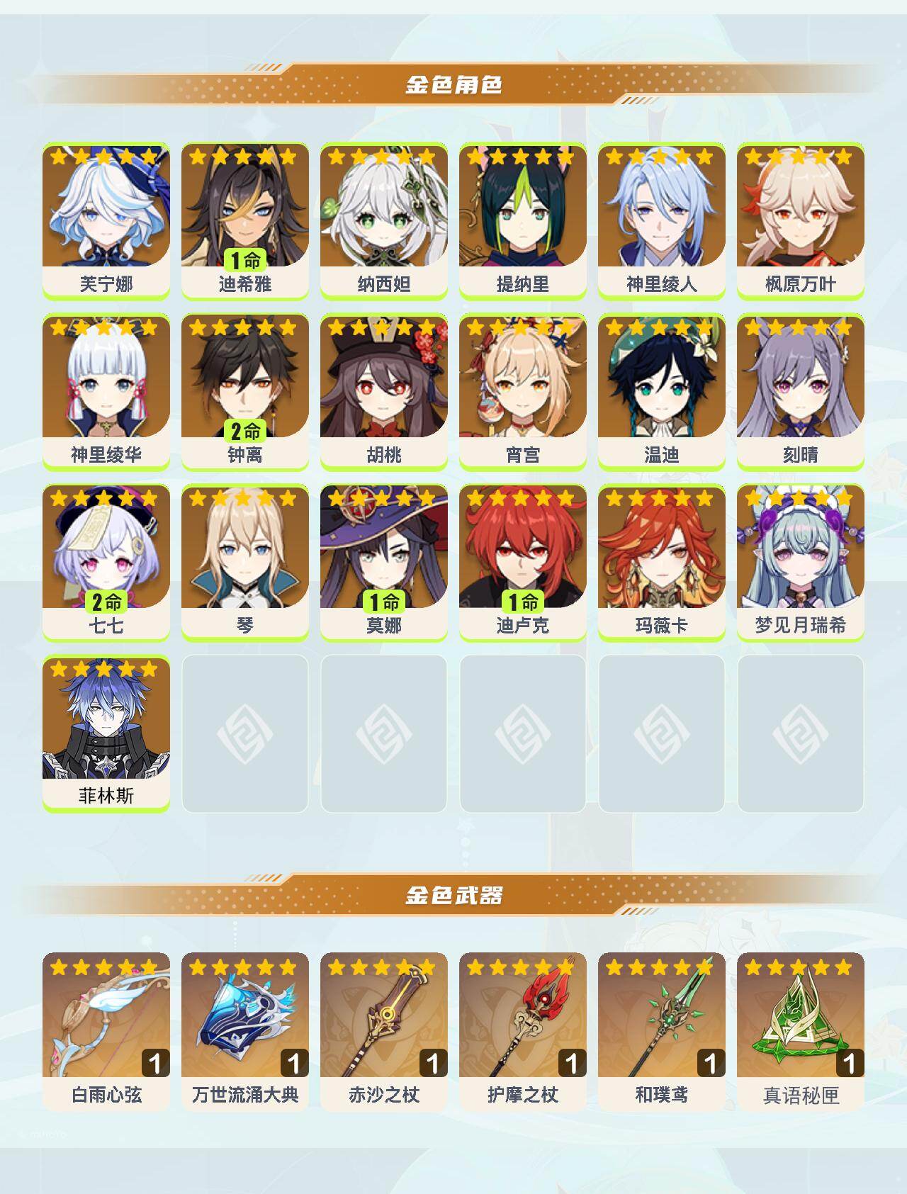 0命芙宁娜,1命迪希雅,0命纳西妲,0命提纳里,0命神里绫人,0命枫原万叶,0命神里绫华,2命钟离,0命胡桃,0命宵宫,0命温迪,0命刻晴,2命七七,0命琴,1命莫娜,1命迪卢克,0命玛薇卡,0命梦见月瑞希,0命菲林斯,精1白雨心弦,精1万世流涌大典,精1赤沙之杖,精1护摩之杖,精1和璞鸢,精1真语秘匣