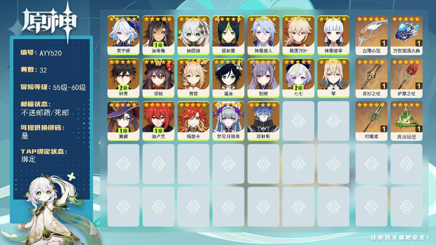 [16678281]58级/32黄/男主/19个五星角色/6个五星武器 0命芙宁娜,1命迪希雅,0命纳西妲,0命提纳里,0命神里绫人,0命枫原万叶,0命神里绫华,2命钟离,0命胡桃,0命宵宫,0命温迪,0命刻晴,2命七七,0命琴,1命莫娜,1命迪卢克,0命玛薇卡,0命梦见月瑞希,0命菲林斯,精1白雨心弦,精1万世流涌大典,精1赤沙之杖,精1护摩之杖,精1和璞鸢,精1真语秘匣