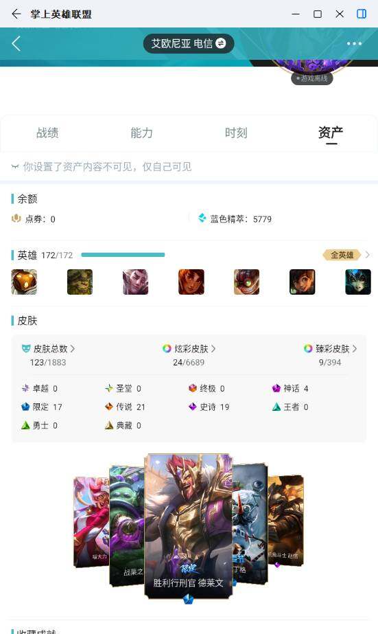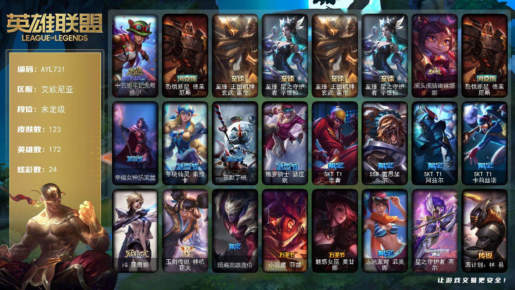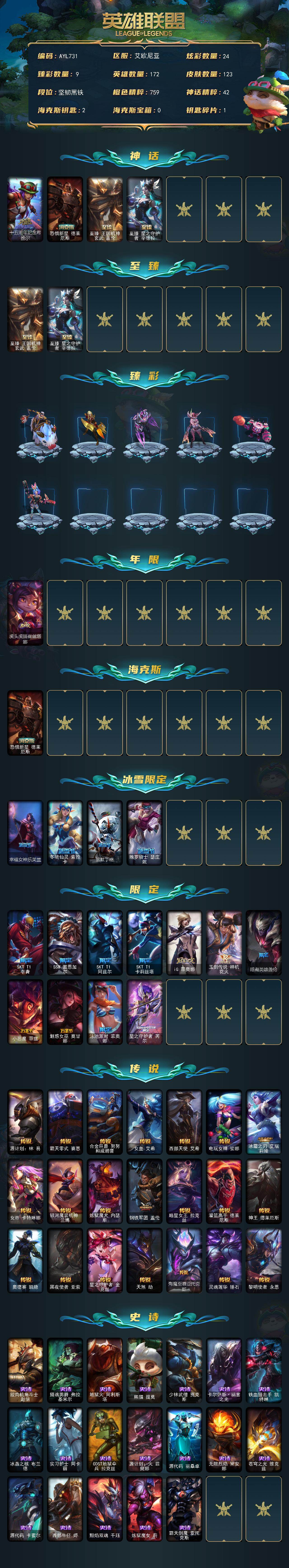 未定级段位-172英雄-123皮肤-24炫彩-0终极-4神话-17限定-21传说-19史诗