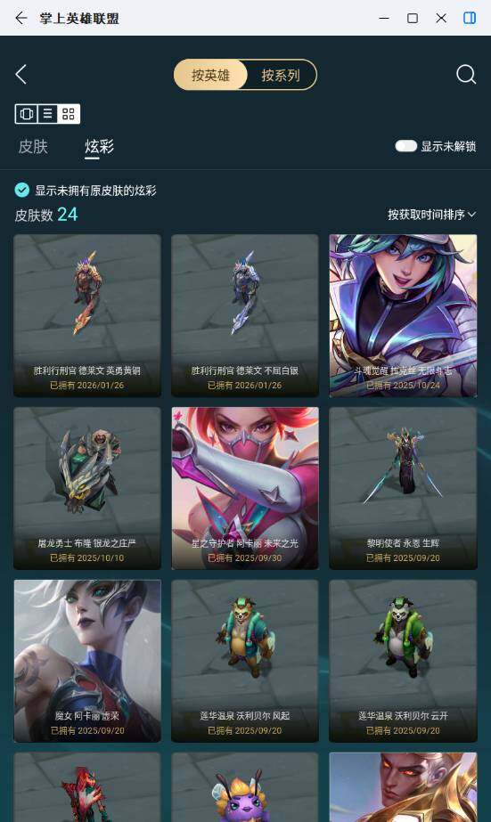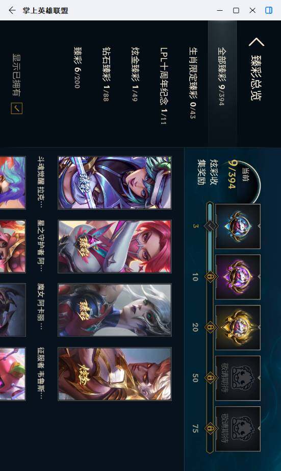 【臻彩皮肤】:无畏骑士瑟庄妮赤子初心,征服者韦鲁斯炫金,斗魂觉醒拉克丝无限斗志,天煞劫恒星游历者,破败军团厄运小姐灵岛征伐使,可爱可爱粉红红布里茨,幻灵战斗队长厄运小姐勇气赞歌,星之守护者阿卡丽未来之光,魔女阿卡丽虚荣