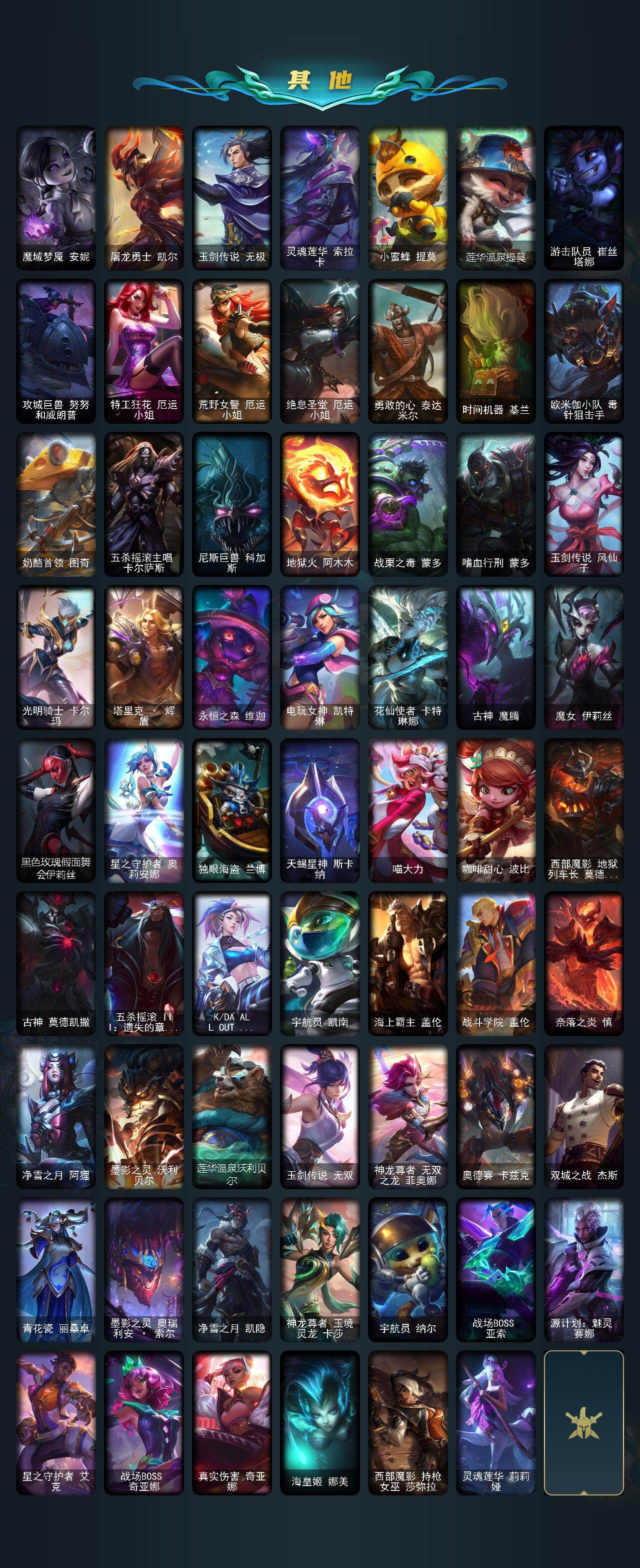 【其他皮肤1】:魔域梦魇安妮,屠龙勇士凯尔,玉剑传说无极,灵魂莲华索拉卡,小蜜蜂提莫,莲华温泉提莫,游击队员崔丝塔娜,攻城巨兽努努和威朗普,特工狂花厄运小姐,荒野女警厄运小姐,绝息圣堂厄运小姐,勇敢的心泰达米尔,时间机器基兰,欧米伽小队毒针狙击手,奶酪首领图奇,五杀摇滚主唱卡尔萨斯,尼斯巨兽科加斯,地狱火阿木木,战栗之毒蒙多,嗜血行刑蒙多,玉剑传说风仙子,光明骑士卡尔玛,塔里克辉盾,永恒之森维迦,电玩女神凯特琳,花仙使者卡特琳娜,古神魔腾,魔女伊莉丝,黑色玫瑰假面舞会伊莉丝,星之守护者奥莉安娜,独眼海盗兰博,天蝎星神斯卡纳,喵大力,