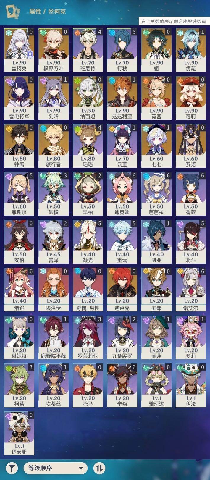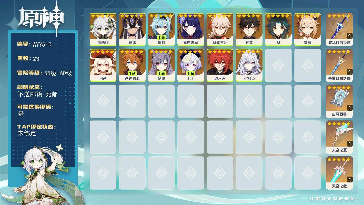 [16678226]57级/23黄/男主/14个五星角色/5个五星武器 0命纳西妲,0命赛诺,1命优菈,0命雷电将军,0命枫原万叶,0命钟离,0命魈,0命宵宫,0命可莉,1命达达利亚,1命刻晴,1命七七,0命迪卢克,0命丝柯克,精1波乱月白经津,精1苍古自由之誓,精1四风原典,精1天空之翼,精1天空之傲