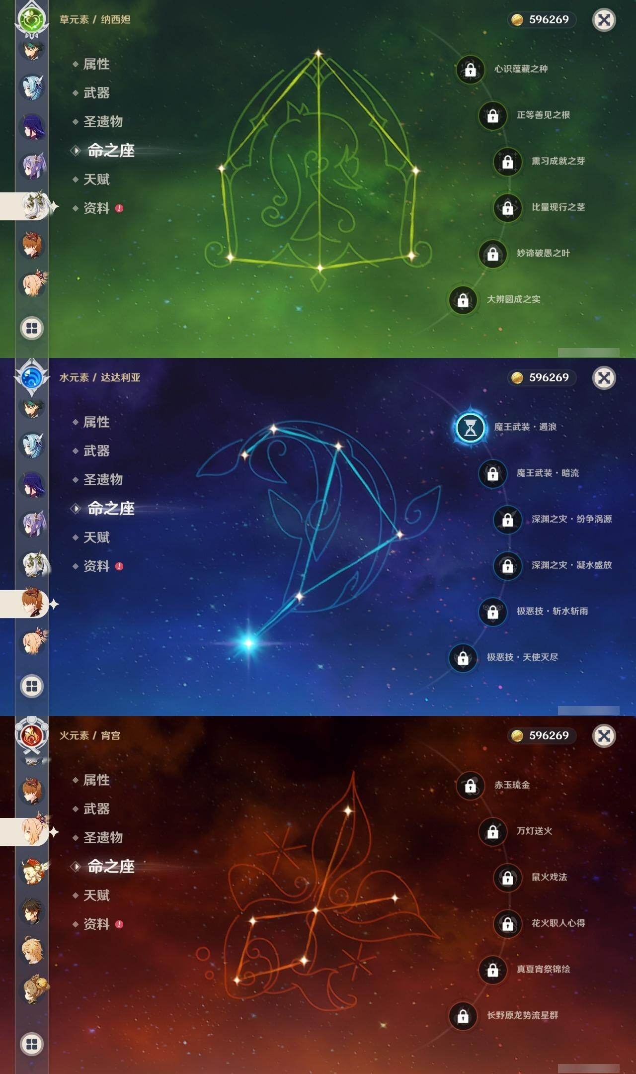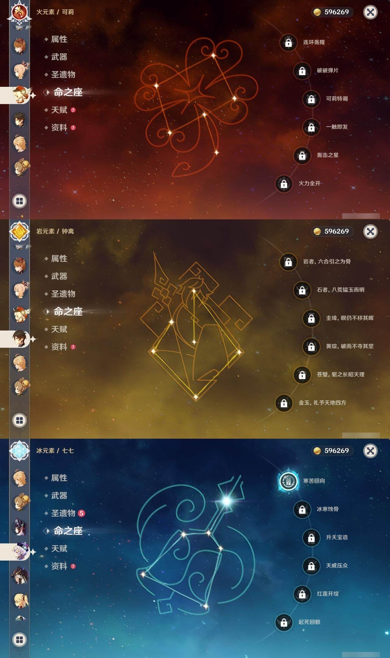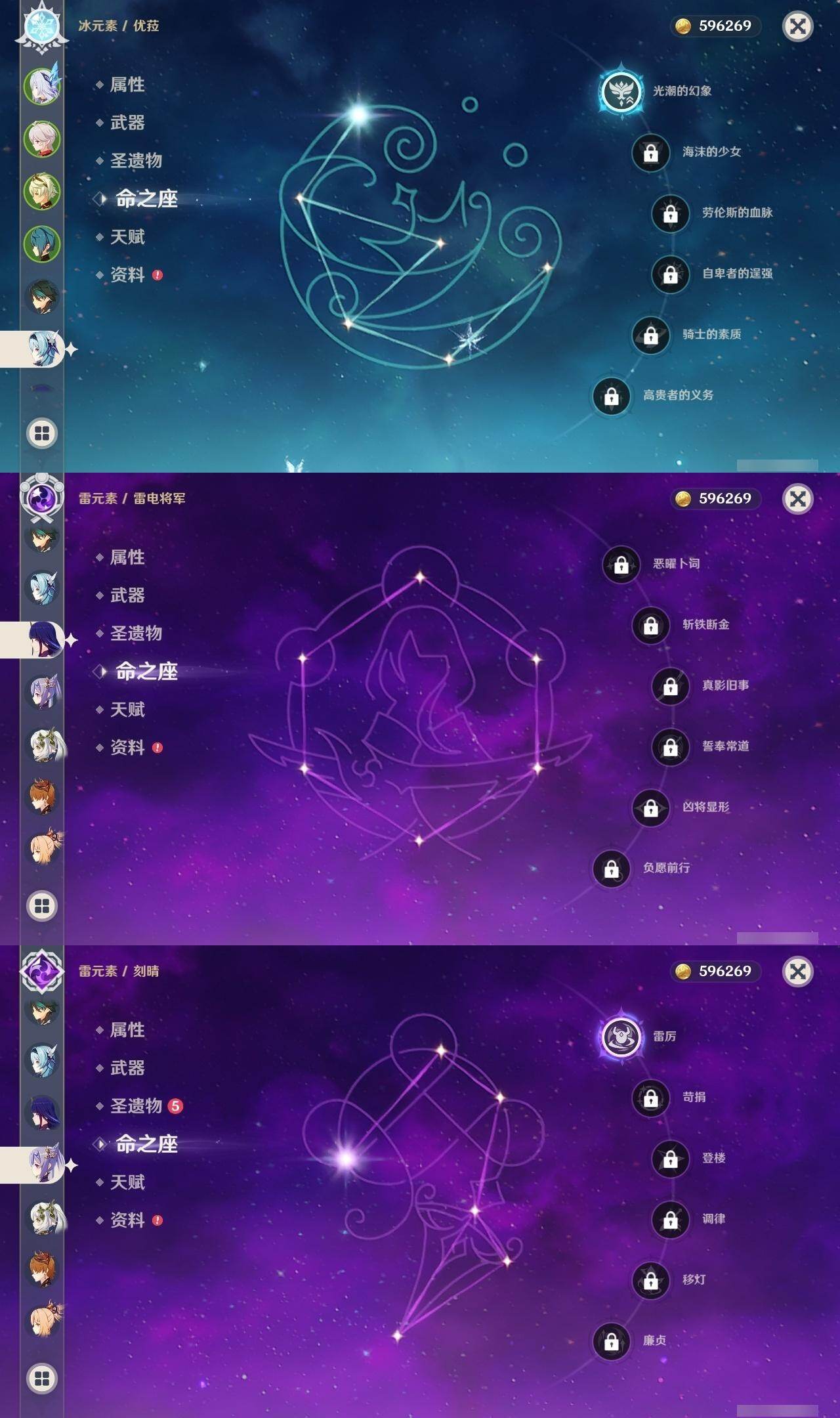 0命纳西妲,0命赛诺,1命优菈,0命雷电将军,0命枫原万叶,0命钟离,0命魈,0命宵宫,0命可莉,1命达达利亚,1命刻晴,1命七七,0命迪卢克,0命丝柯克,精1波乱月白经津,精1苍古自由之誓,精1四风原典,精1天空之翼,精1天空之傲