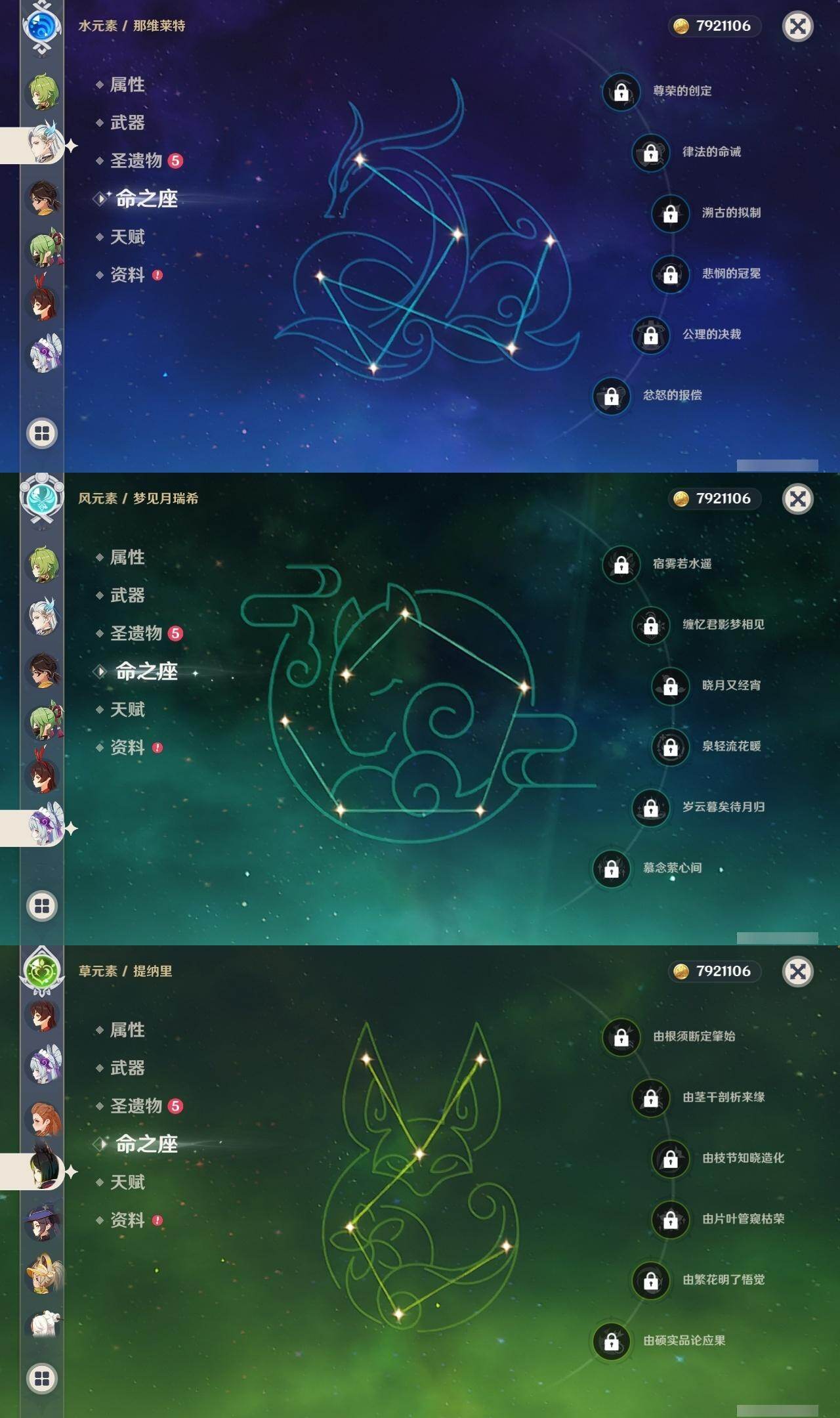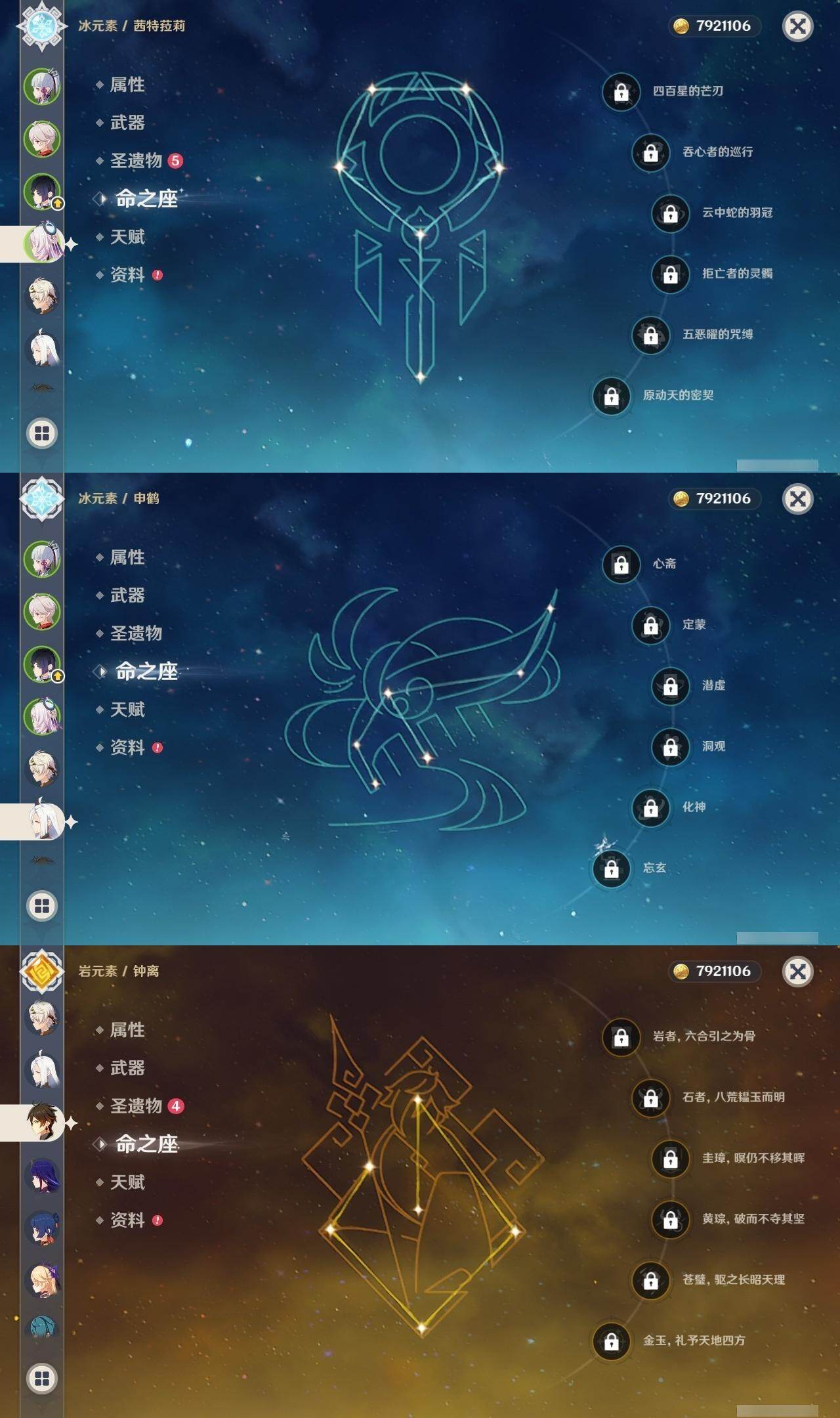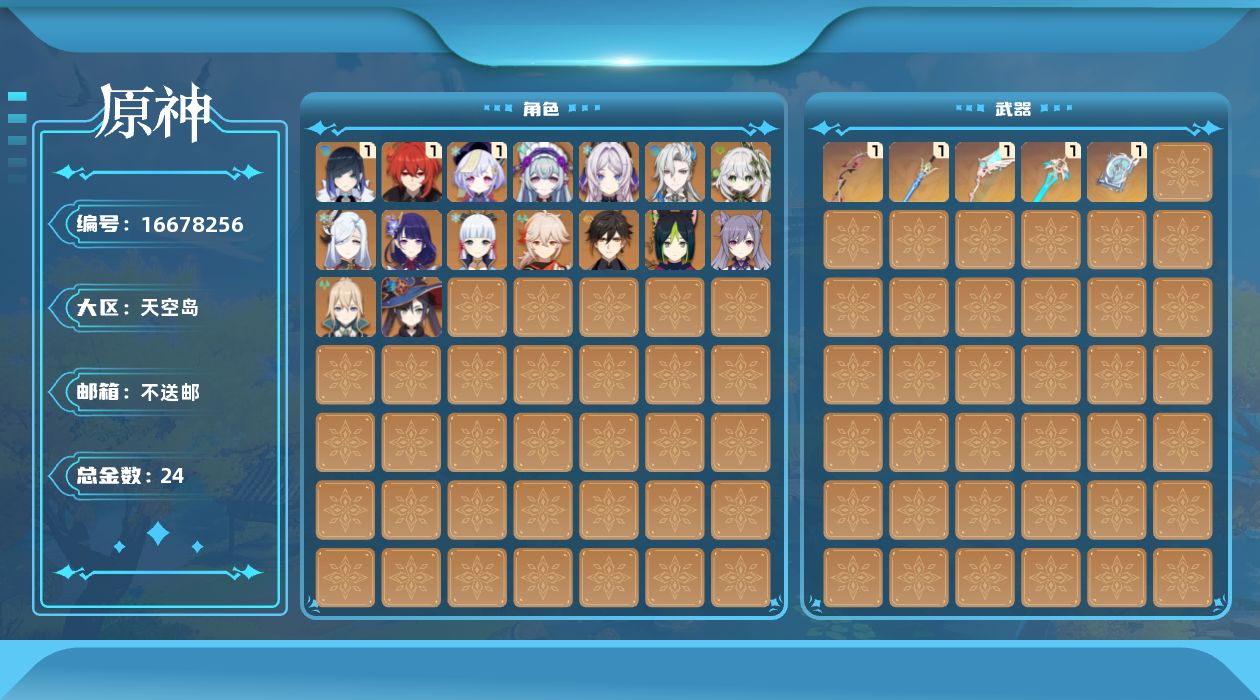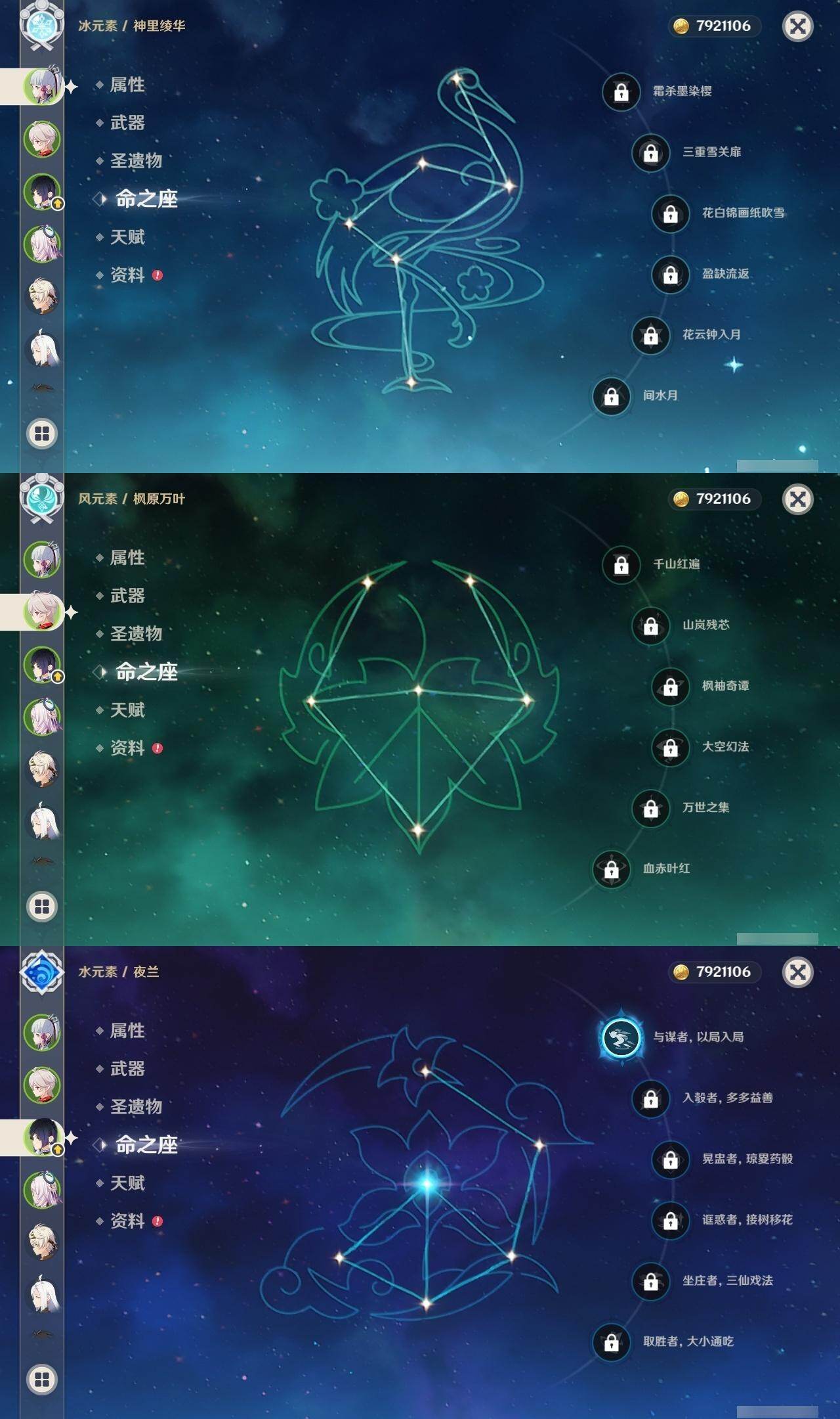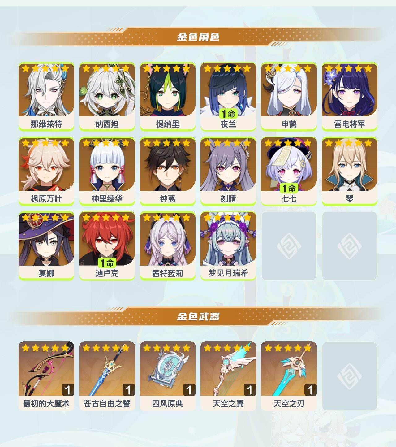 0命那维莱特,0命纳西妲,0命提纳里,1命夜兰,0命申鹤,0命雷电将军,0命枫原万叶,0命神里绫华,0命钟离,0命刻晴,1命七七,0命琴,0命莫娜,1命迪卢克,0命茜特菈莉,0命梦见月瑞希,精1最初的大魔术,精1苍古自由之誓,精1四风原典,精1天空之翼,精1天空之刃