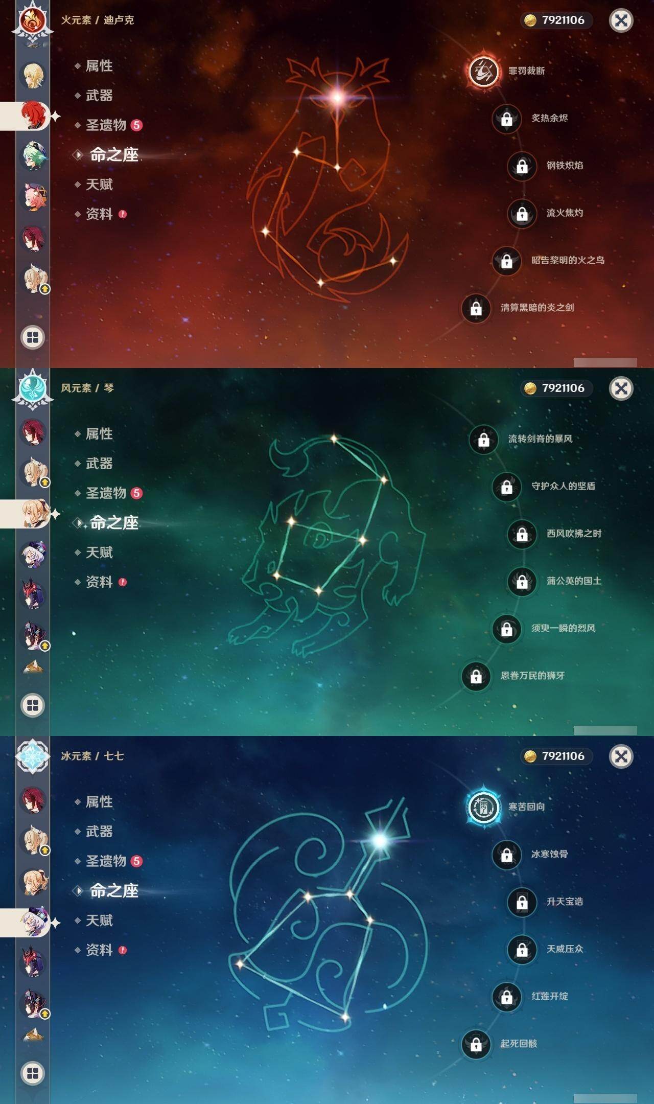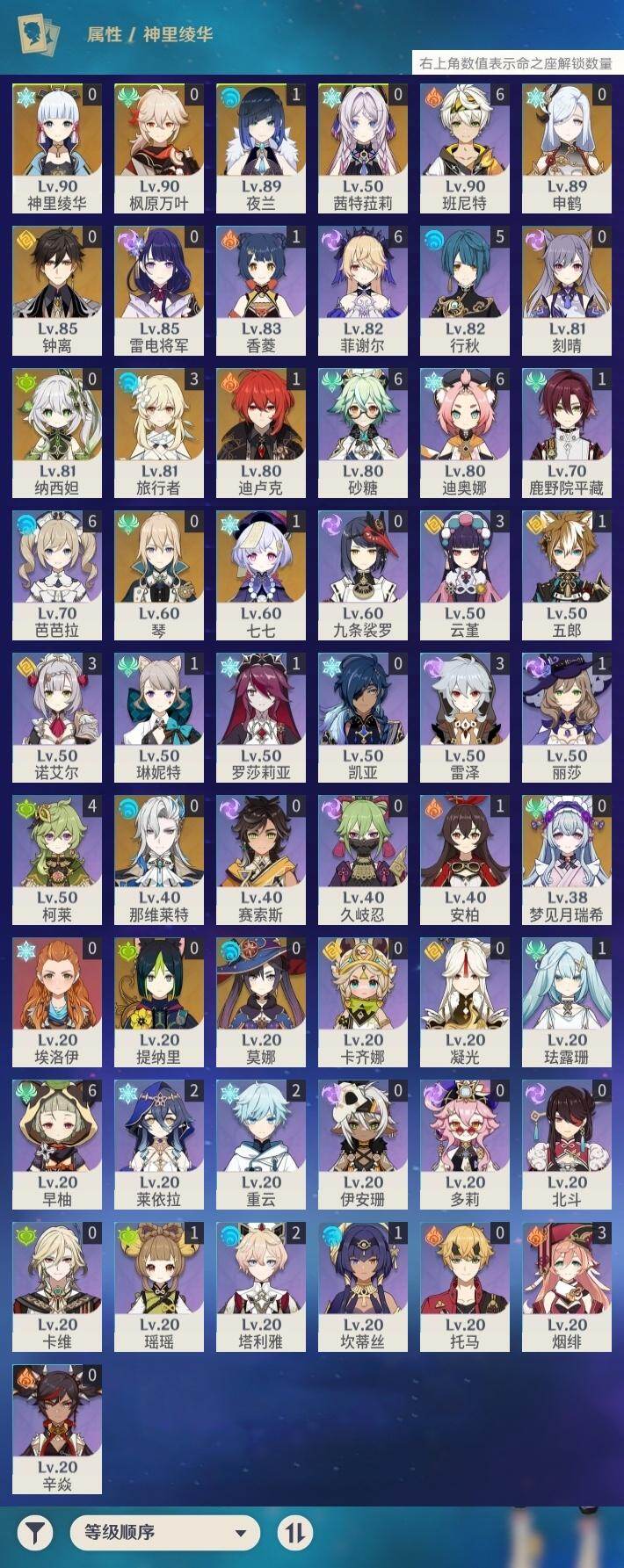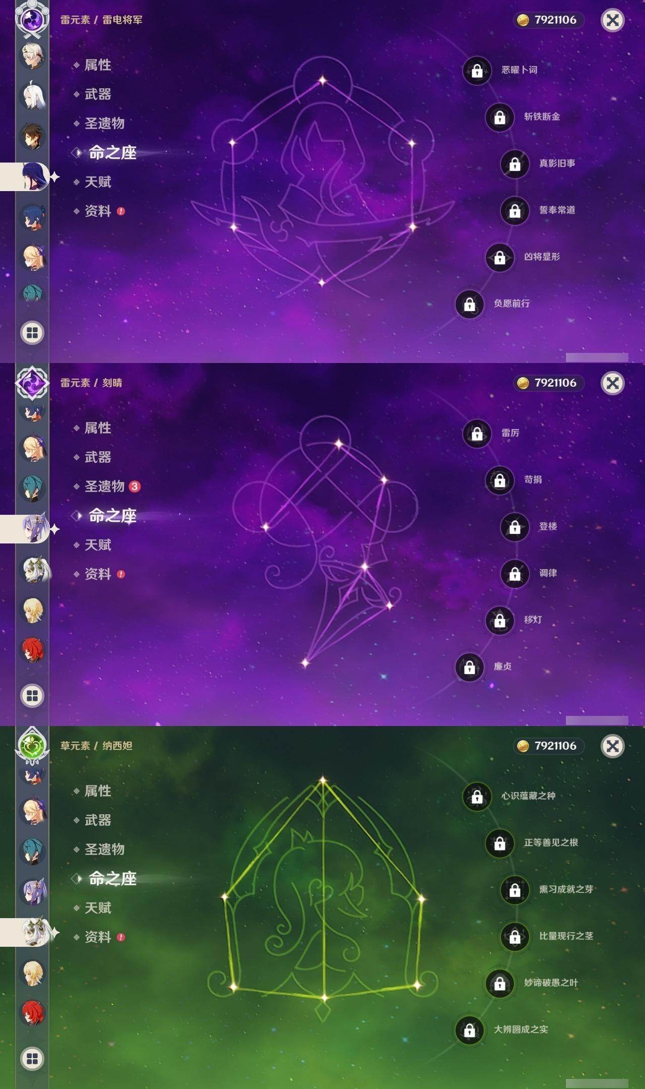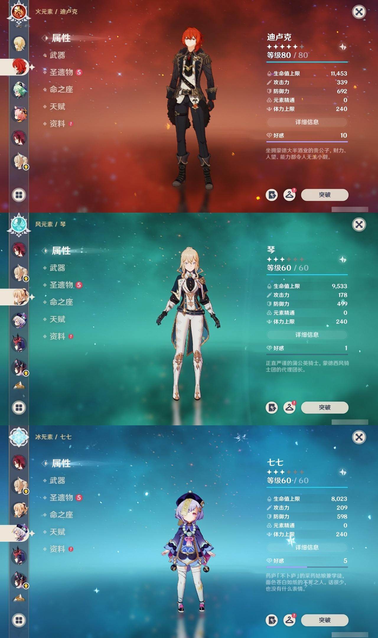 0命那维莱特,0命纳西妲,0命提纳里,1命夜兰,0命申鹤,0命雷电将军,0命枫原万叶,0命神里绫华,0命钟离,0命刻晴,1命七七,0命琴,0命莫娜,1命迪卢克,0命茜特菈莉,0命梦见月瑞希,精1最初的大魔术,精1苍古自由之誓,精1四风原典,精1天空之翼,精1天空之刃