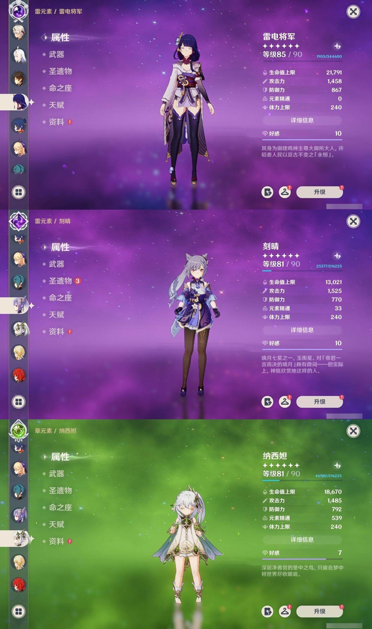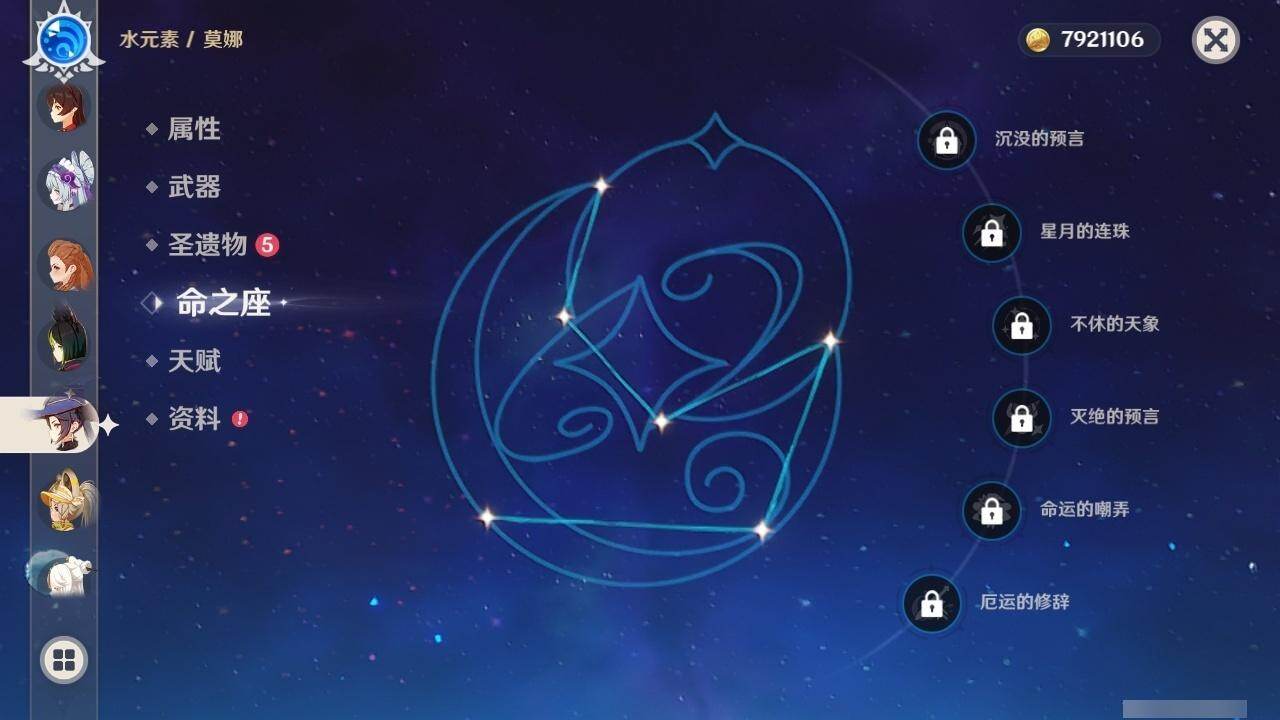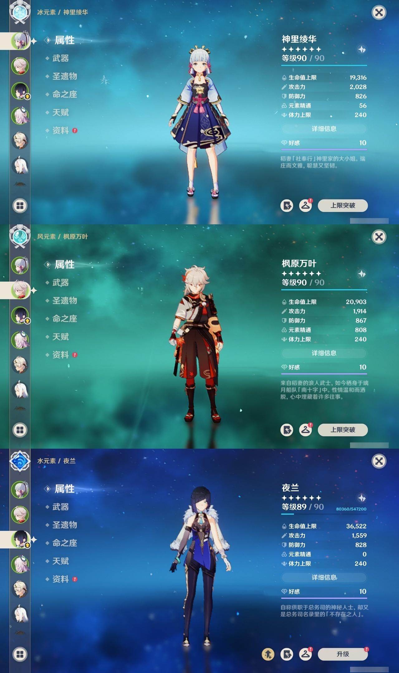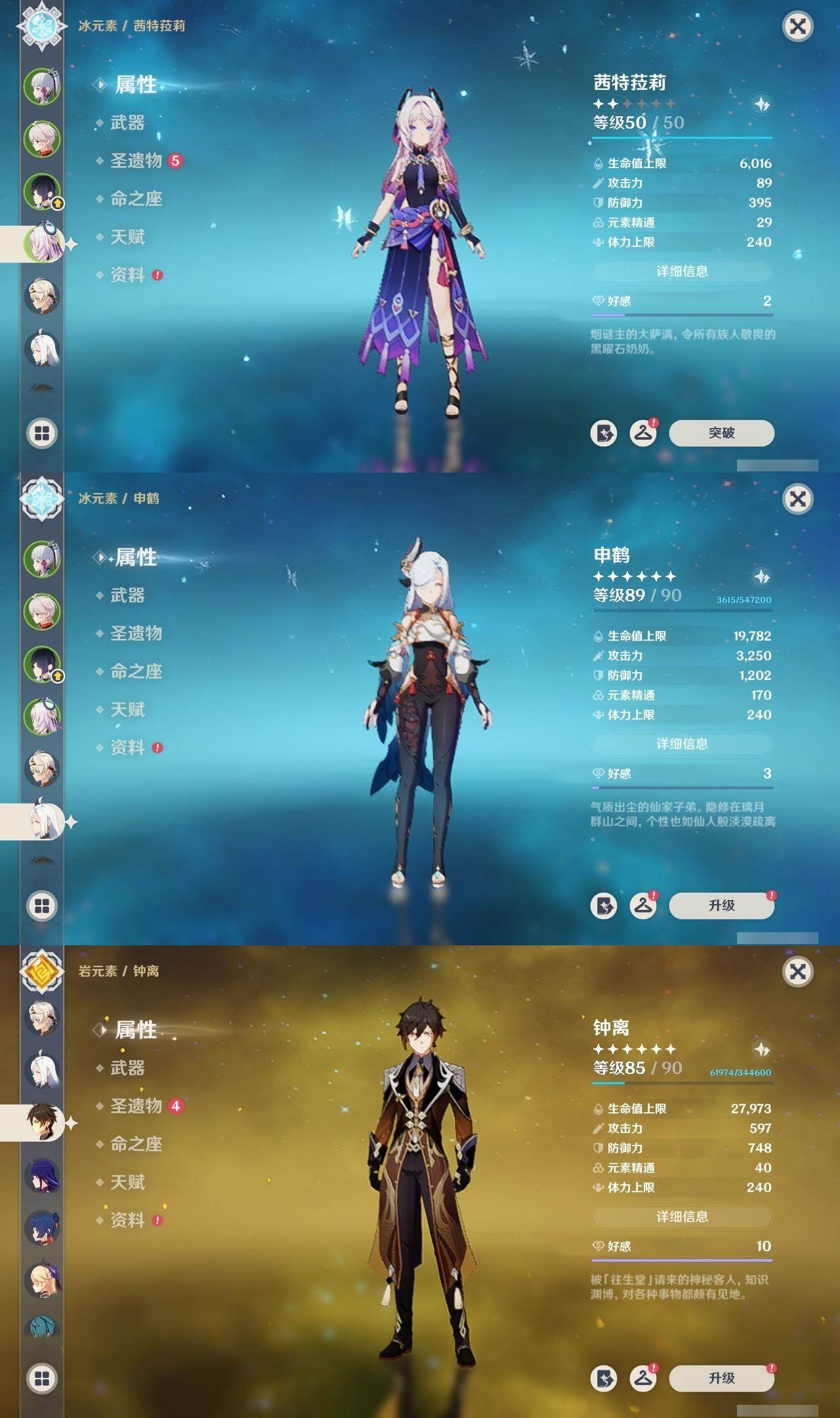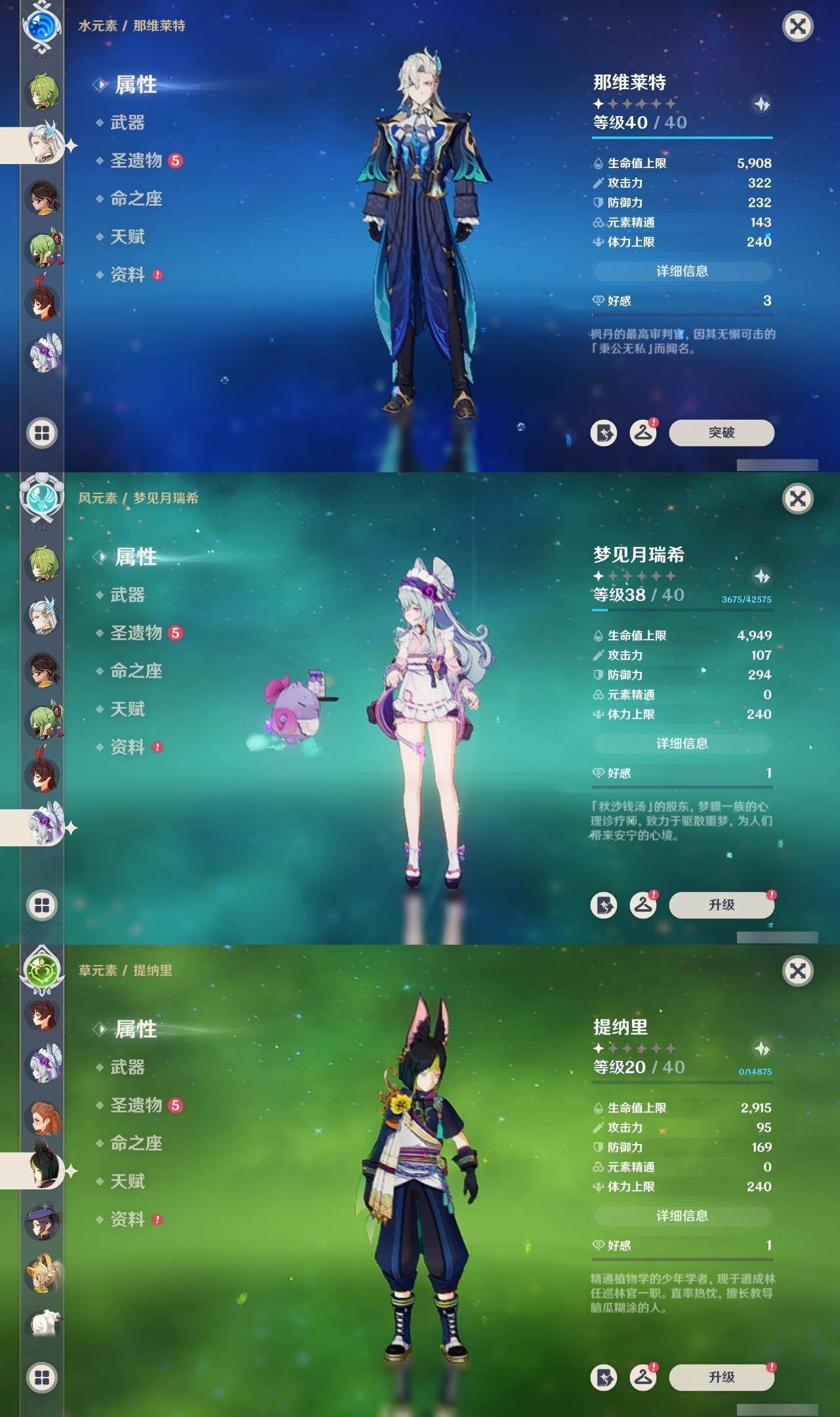 0命那维莱特,0命纳西妲,0命提纳里,1命夜兰,0命申鹤,0命雷电将军,0命枫原万叶,0命神里绫华,0命钟离,0命刻晴,1命七七,0命琴,0命莫娜,1命迪卢克,0命茜特菈莉,0命梦见月瑞希,精1最初的大魔术,精1苍古自由之誓,精1四风原典,精1天空之翼,精1天空之刃