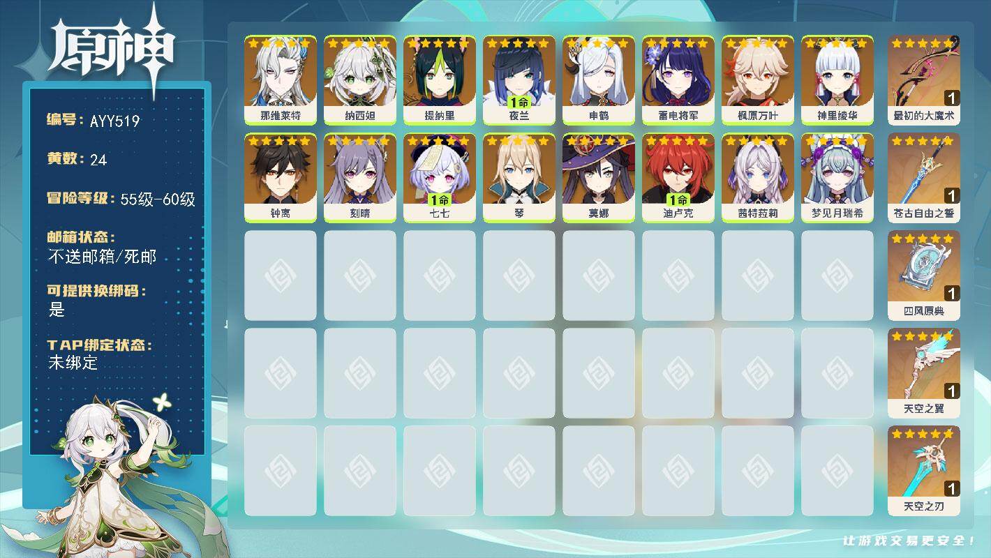 [16678256]【店主推荐捡漏号】57级/24黄/女主/16个五星角色/5个五星武器 0命那维莱特,0命纳西妲,0命提纳里,1命夜兰,0命申鹤,0命雷电将军,0命枫原万叶,0命神里绫华,0命钟离,0命刻晴,1命七七,0命琴,0命莫娜,1命迪卢克,0命茜特菈莉,0命梦见月瑞希,精1最初的大魔术,精1苍古自由之誓,精1四风原典,精1天空之翼,精1天空之刃