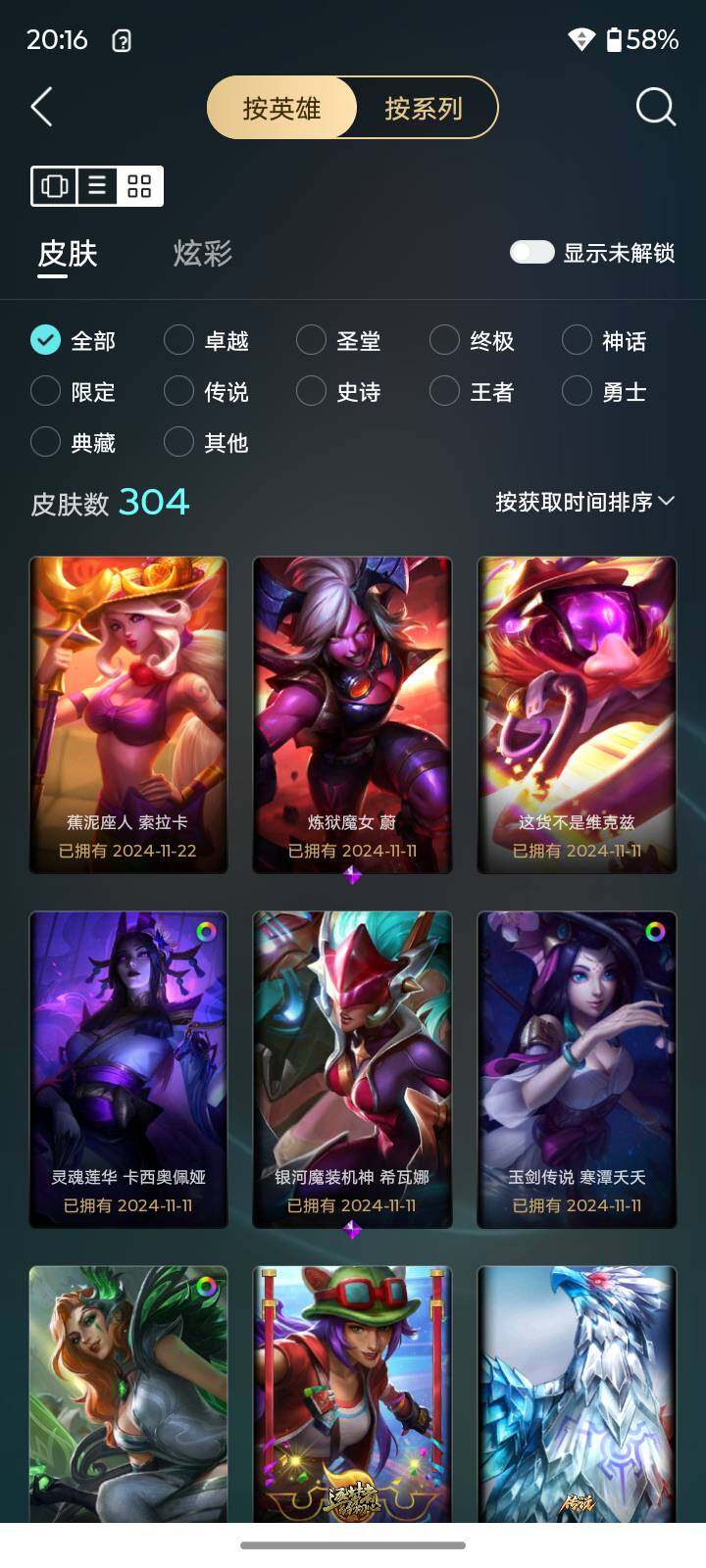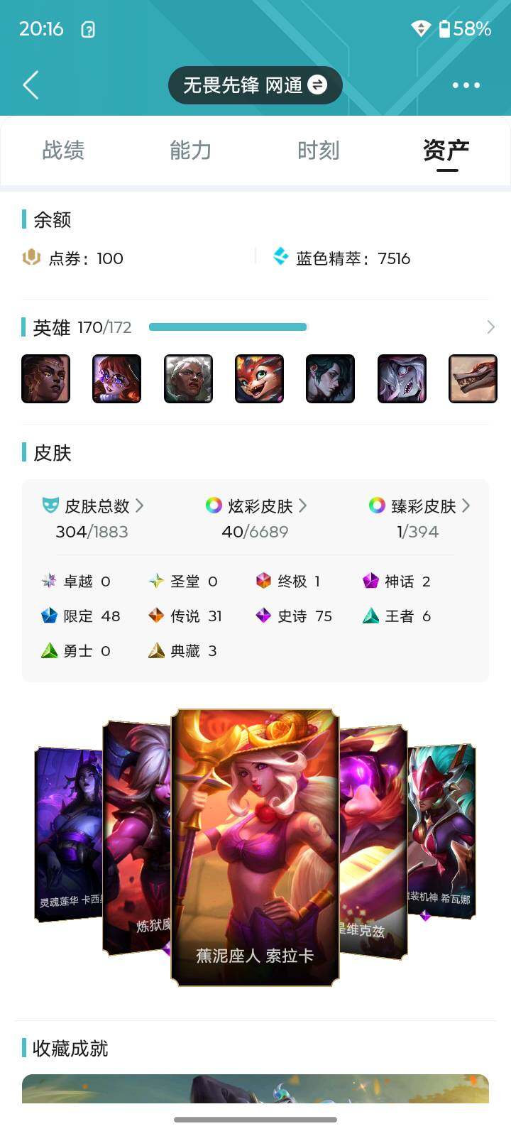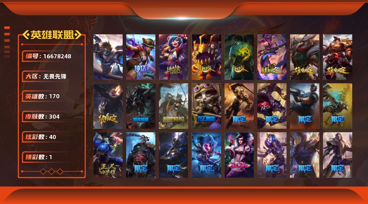 [16678248]【店主推荐捡漏号】未定级段位-170英雄-304皮肤-40炫彩-1终极-2神话-48限定-31传说-75史诗
