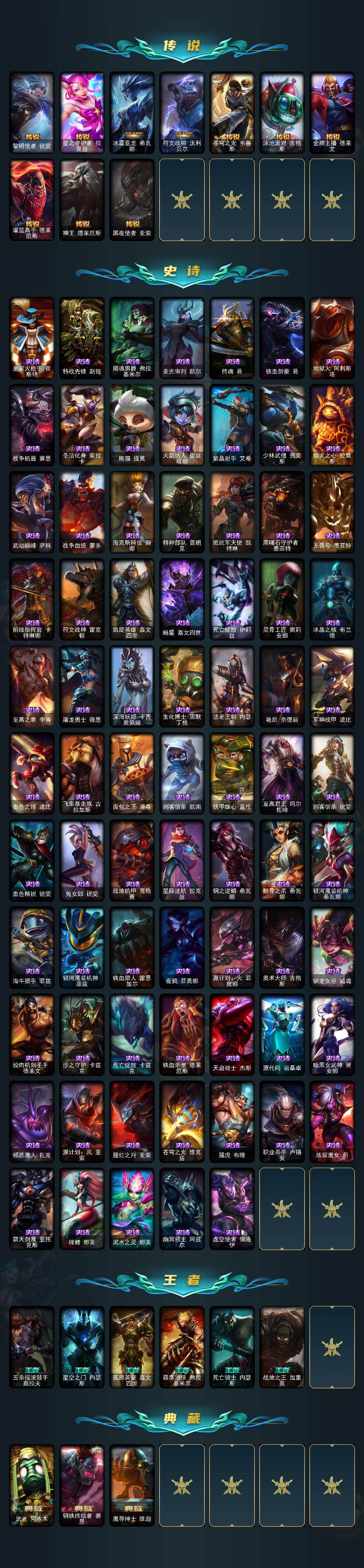 【史诗皮肤】:皇家火枪手崔斯特,特战先锋赵信,摄魂男爵弗拉基米尔,圣光审判凯尔,侍魂易,铁血剑豪易,地狱火阿利斯塔,战争机器赛恩,圣洁化身索拉卡,熊猫提莫,火箭达人崔丝塔娜,紫晶射手艾希,少林武僧贾克斯,熔火之心拉莫斯,武动巅峰萨科,战争血统蒙多,海克斯科技迦娜,特种部队普朗克,抵抗军天使凯特琳,黑曜石守护者墨菲特,无畏号墨菲特,前线指挥官卡特琳娜,符文战神雷克顿,凯旋英雄嘉文四世,暗星嘉文四世,死亡绽放伊莉丝,灵骨工匠奥