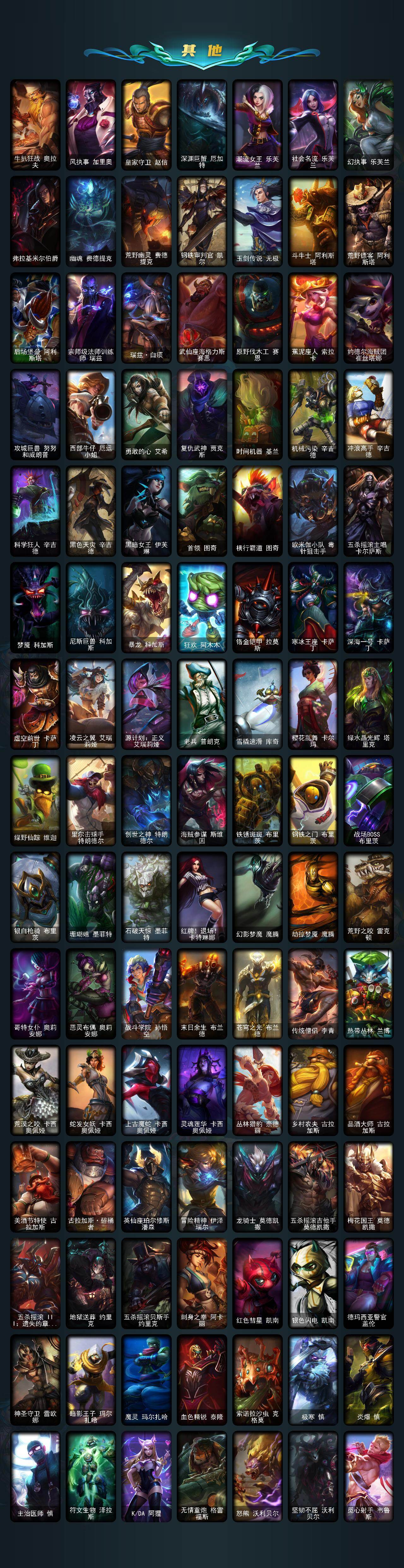 【限定皮肤】:战熊骑士瑟庄妮,穿星魔锋赵信,斩星魔剑易,SKTT1贾克斯,SSW图奇,SKTT1奥拉夫,SKTT1娜美,SSG霞,iG艾瑞莉娅,胜利女神奥莉安娜,胜利之剑亚托克斯,胜利枪神卢锡安,胜利凤凰艾尼维亚,胜利之王泰达米尔,胜利巨口克格莫,死亡誓约维克托,泳池派对蕾欧娜,泳池派对李青,泳池派对塔里克,密林猎手提莫,暗影沃里克,野兽猎人瑟庄妮,都铎王朝图奇,钢铁之翼艾尼维亚,防暴士兵格雷福斯,防暴天使凯尔,警用试作体K9内瑟斯