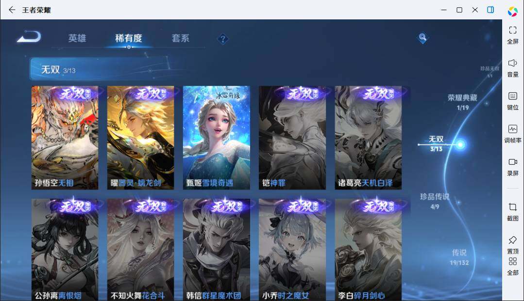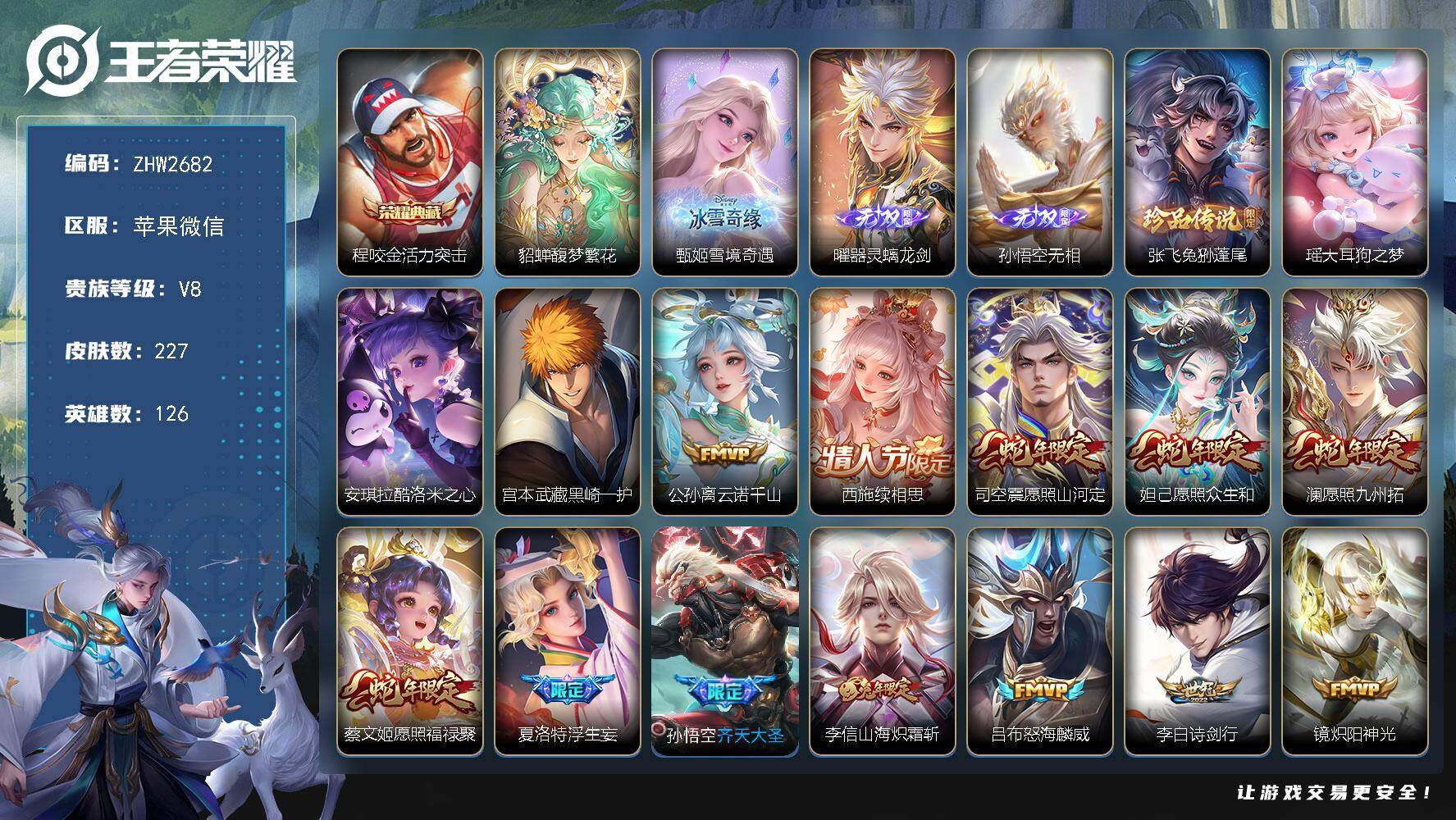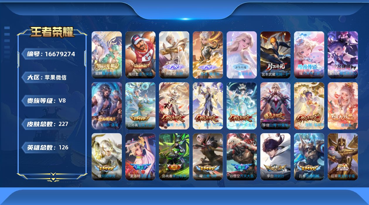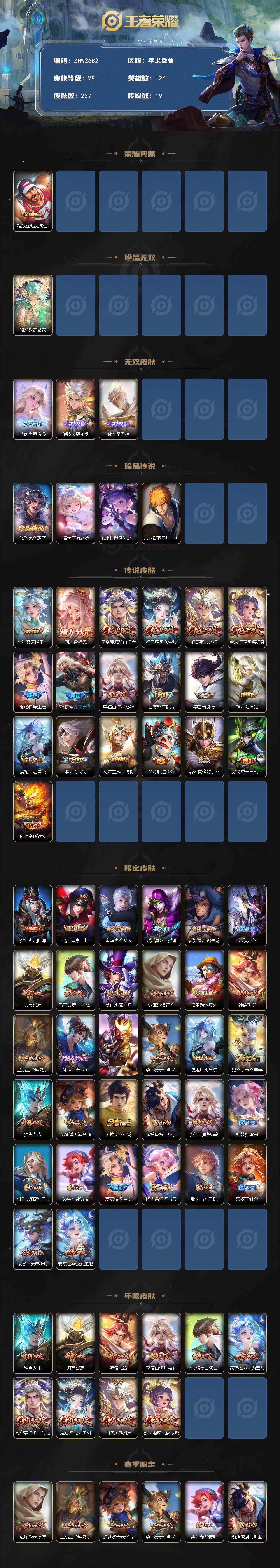 [16679274]精氪号!苹果WX-V8-永恒钻石III段位-126英雄-227皮肤-1典藏皮肤-1珍品无双-3无双-4珍品传说-19传说-70史诗