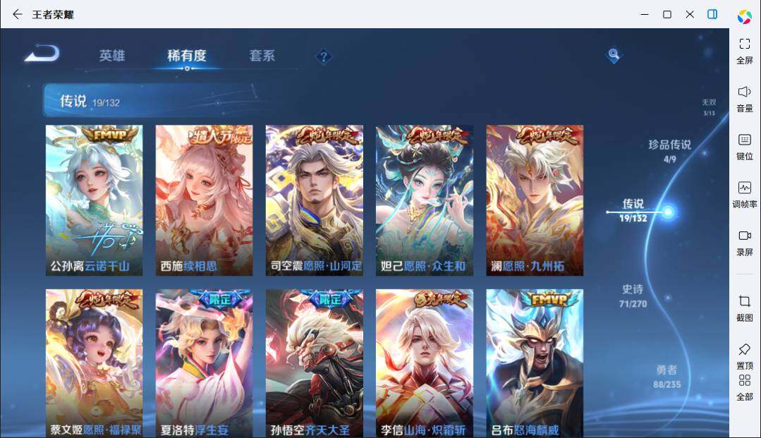 【传说皮肤】:公孙离云诺千山,西施续相思,司空震愿照山河定,妲己愿照众生和,澜愿照九州拓,蔡文姬愿照福禄聚,夏洛特浮生妄,孙悟空齐天大圣,李信山海炽霜斩,吕布怒海麟威,李白诗剑行,镜炽阳神光,虞姬启明星使,曜云鹰飞将,花木兰冠军飞将,梦奇胖达荣荣,后羿黄金射手座,孙尚香末日机甲,孙悟空地狱火