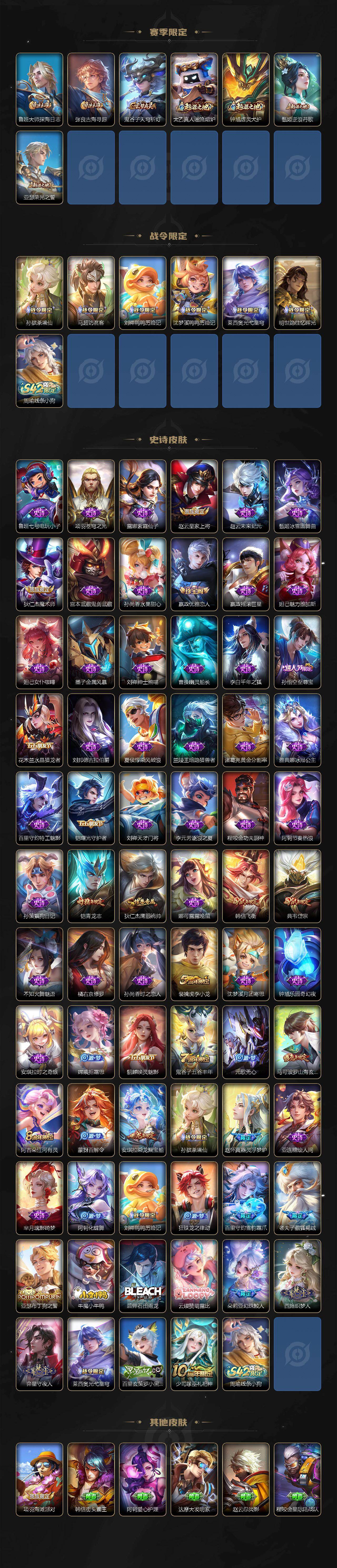 【限定皮肤】:狄仁杰阴阳师,赵云皇家上将,嬴政优雅恋人,高渐离死亡摇滚,高渐离玩趣恶龙,元歌无心,典韦岱宗,马可波罗山海玄木吟,狄仁杰魔术师,达摩沙漠行僧,项羽海滩派对,韩信飞衡,兰陵王金庭之子,孙悟空至尊宝,孙悟空齐天大圣,李元芳云中旅人,虞姬启明星使,鬼谷子五谷丰年,铠青龙志,沈梦溪大漠名商,裴擒虎李小龙,裴擒虎擒涛扼浪,李信山海炽霜斩,嫦娥拒霜思,鲁班大师探海日志,桑启海盐诗旅,夏洛特浮生妄,阿古朵江河有灵,张良古海寻踪,蒙犽百解令,鬼谷子天穹祈灯,安琪拉乘龙聚宝船