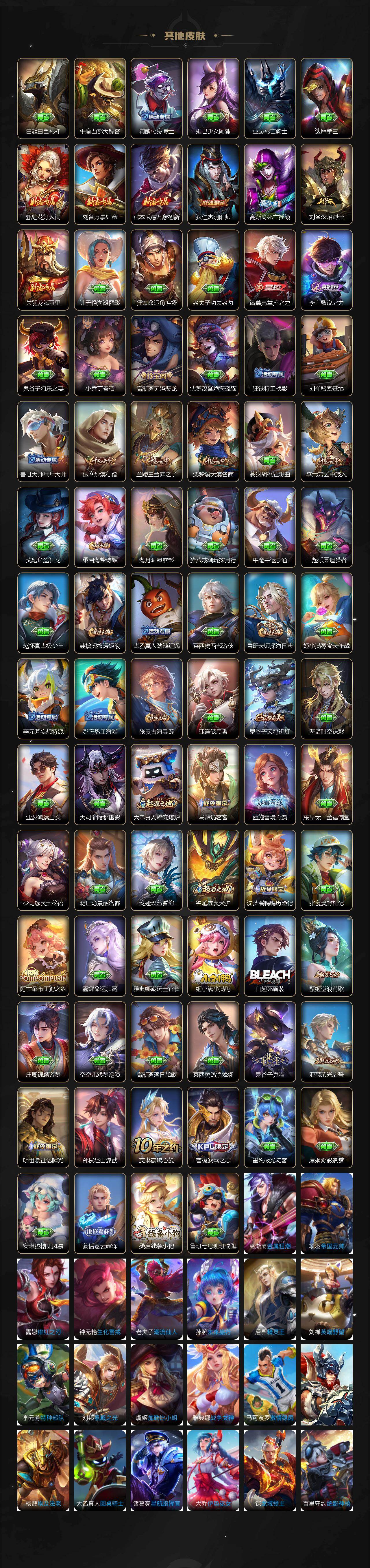 【史诗皮肤】:鲁班七号电玩小子,项羽苍穹之光,露娜紫霞仙子,赵云皇家上将,赵云未来纪元,甄姬冰雪圆舞曲,狄仁杰魔术师,宫本武藏鬼剑武藏,孙尚香水果甜心,嬴政优雅恋人,嬴政摇滚巨星,妲己魅力维加斯,妲己女仆咖啡,墨子金属风暴,刘禅绅士熊喵,曹操幽灵船长,李白千年之狐,孙悟空至尊宝,花木兰水晶猎龙者,刘邦德古拉伯爵,夏侯惇乘风破浪,兰陵王暗隐猎兽者,诸葛亮黄金分割率,雅典娜
