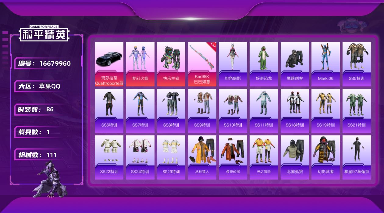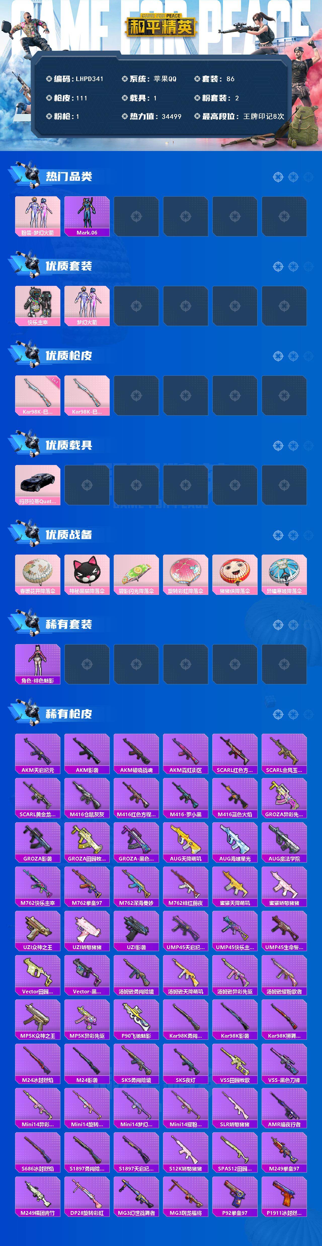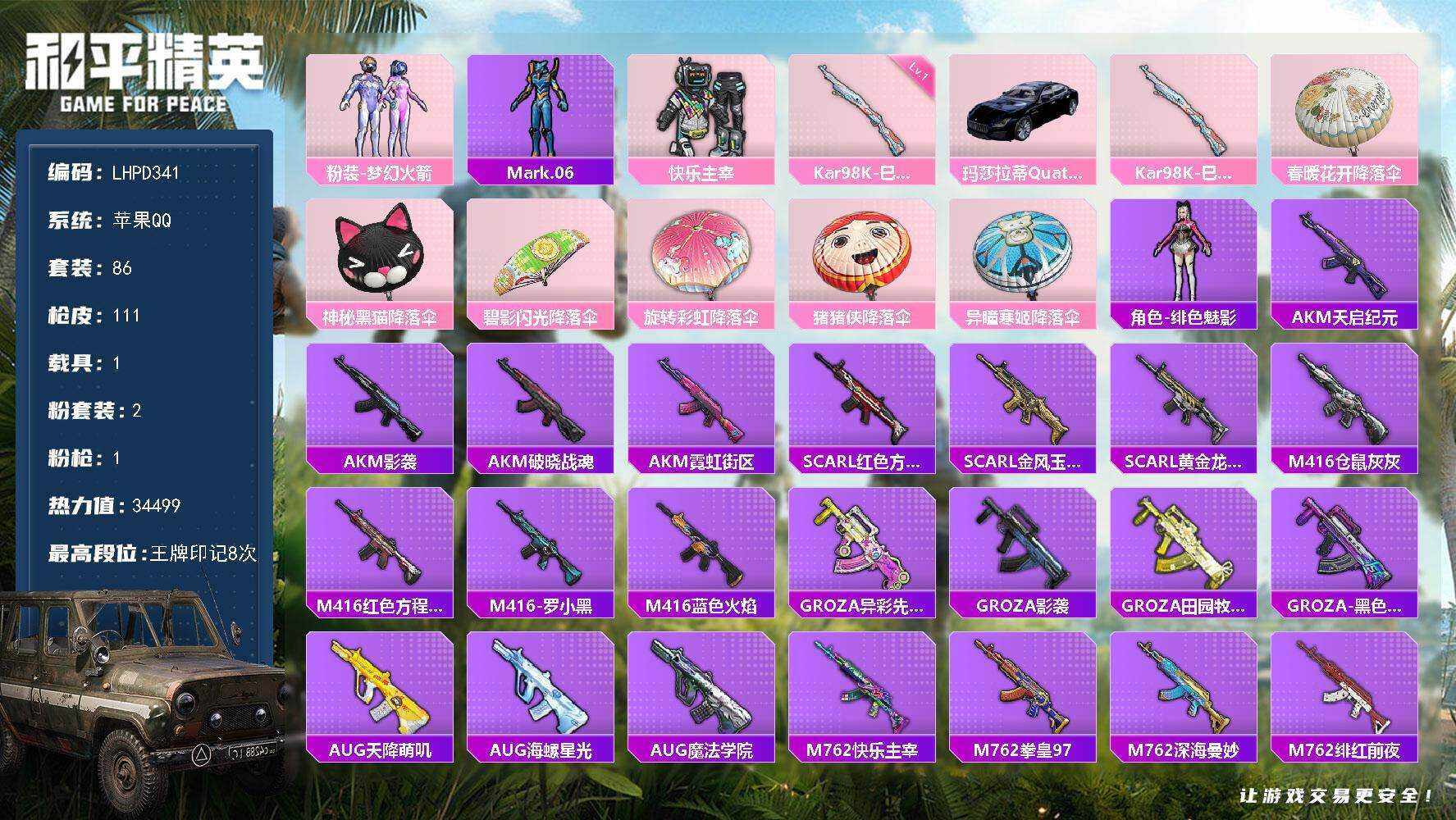 [16679960]【特价出售/店主推荐】苹果 手Q-2粉装-1特效枪-1载具-0粉色飞行器-34499热力值-8王牌印记-86套装-111枪皮【热门品类】:粉装-梦幻火箭,角色-Mark.06【粉色套装】:粉装-快乐主宰,粉装-梦幻火箭【粉色枪皮等级】:Kar98K-巳巳如意(一级)【粉色载具】:玛莎拉蒂Quattroporte(夜幕蓝)【粉色枪皮】:Kar98K-巳巳如意