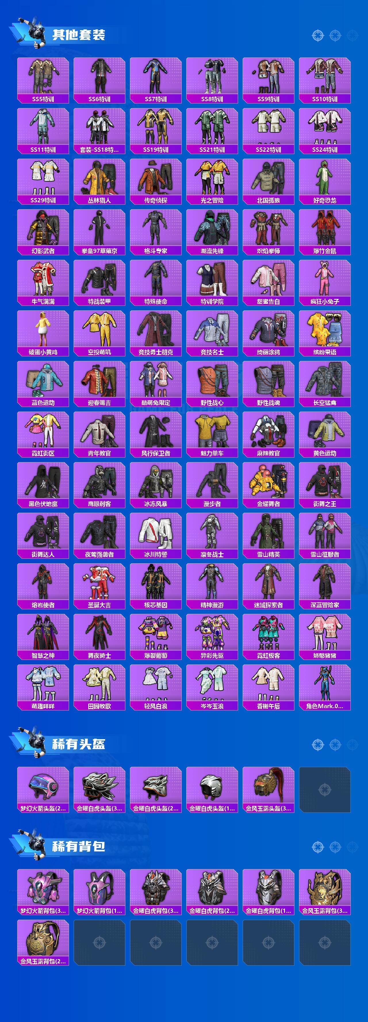 - [12030091]9粉装 8特效枪 2载具 12印记 可二次 可修改实名 身法装备:都市猎人,暗影哥特(红眼罩),Mark.06(新蓝螳螂) 优质装备:合金龙骨(蓝),甜心巧克力,都市猎人,M416心之恋语,梦幻火箭(新101)(新火箭少女101粉色套装),宝贝奶油派,天使彩虹糖,智能音符,星之彼岸,DP-28暗夜鎏金,SCAR-L纯梦嫁纱,Kar98K未来歌姬,七级SCAR-L-纯梦嫁纱,七级DP-28-暗夜鎏金,七级M416-心之恋语,UMP45量子极限,千金淑猫,GROZA-镜光银凌,Kar98K-巳巳如意 热门装扮:蔷薇星,闲梦青缨,动感兔斯基,鹰眼刺客,呆萌铁蟹,都市猎人 载具:冰绡玉鳞 稀有枪皮:DP-28-豹影疾电 五级特效枪:五级UMP45-量子极限,五级GROZA-镜光银凌,五级Kar98K-巳巳如意,五级DP-28-豹影疾电 四级特效枪:四级Kar98K-未来歌姬 紫色装扮:幻彩翩翩,SS23特训,妙红点点,霓虹热舞,SS30特训套装,SS31特训套装,云朵鹅,彩虹兔,雪绒豹,SS33特训套装,青涩时光,旭日情侣,田园牧歌,轻风白浪,和煦暖阳,SS22特训,顶瓜瓜,坚韧舞者,冰爽海盐,浓情蜜辣,风暴特警,飞行日记,魅力单车,鹤鸣,黑色伏地魔,龙的传人,龟仙人,冰河战士,龙魂突击队,蝶变,香桃花海,霓虹街区,超能勇士,都市漫游者,长空猛禽,极光猎影,蓝海鲸歌,街头潮人,涂山之恋,清新柠檬,灰色格斗者,海岛探路者,柠萌假日,血色贵族,糯粉咩咩,缤纷果语,荣耀,蓝彩潮人,蓝色运动,甜蜜告白,空岛之星,白熊同盟,萝兰蝴蝶,SS29特训,达芬奇,星途旅人,雏菊兔兔,热情海星,SS28特训,创世·追猎,Mark.06(新蓝螳螂),鱼渊荷华,燕燕于飞,巳巳如意,森林游猎者,风玲,智谋强哥,小狗蛇点点,异域银装,青团波波,糖糖葫芦,棉花软糖,竞技名士,都市丽猫,街头风暴,暗影哥特(红眼罩),红熊茄茄,纯真浪花,深海梦境,惊鸿侠骨,神气柴柴,懵萌河马,SS24特训(SS24特训套装),SS25特训,绝对偶像,锦衣飞扬,冰公主,SS27特训,焰鹰斗篷,幻羽潜行,无暇誓言,浪漫天命,小丑鱼,星河浪客,SS26特训,春光漫游,快闪甜心,贝斯之夜,小鸟芋圆,大橘大利,SS32特训服(SS32特训套装),春日漫步,糯粉咪咪(套装-糯粉咩咩),蓝冰羽,绯格组合,萌黄之夏,紫幽梦,粉恋花,白糯