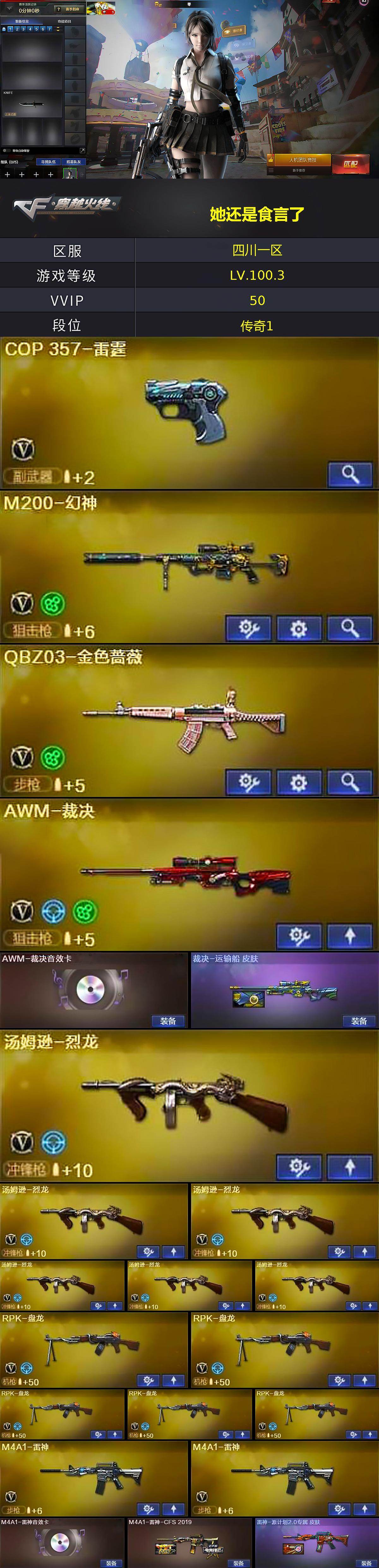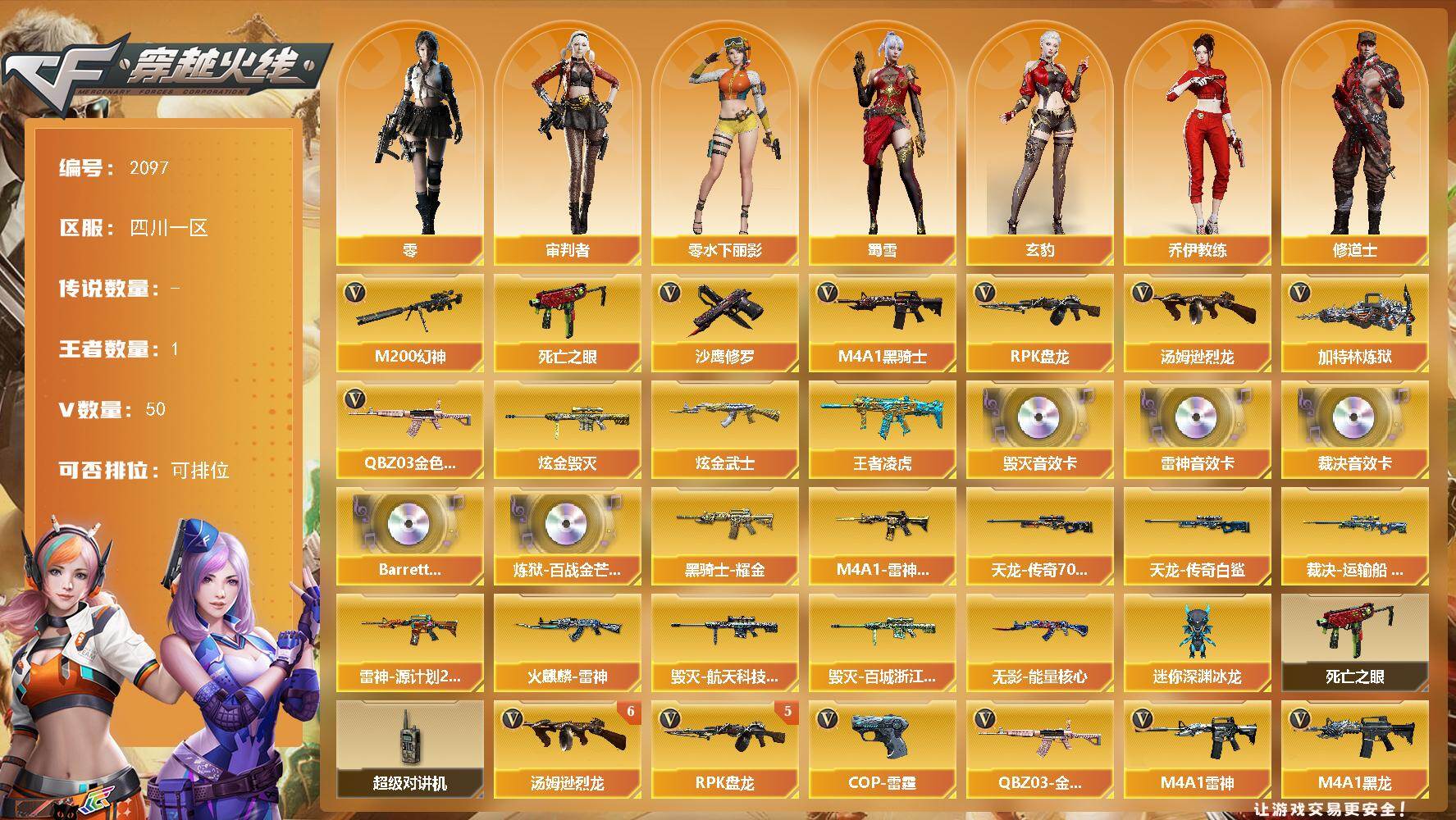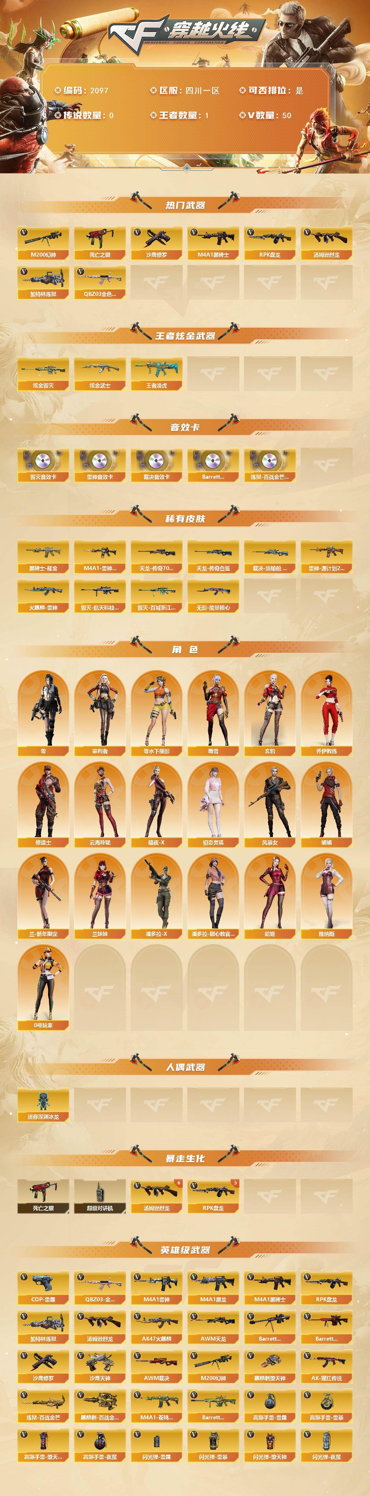 [16680712]四川一区-53V-1王者武器数-2炫金武器数 【热门武器】:QBZ03-金色蔷薇,M200-幻神,死亡之眼,M4A1-黑骑士,汤姆逊-烈龙*6,RPK-盘龙*5,加特林-炼狱,沙鹰-修罗*3 【王者炫金武器】:王者凌虎,炫金武士,炫金毁灭 【音效卡】:M4A1-雷神音效卡,Barrett-毁灭音效卡,AWM-裁决音效卡,Barrett-碧霄极光音效卡,炼狱-百战金芒-庆典舞曲音效卡 【皮肤】:裁决-运输船 皮肤,M4A1-雷神-CFS 2019,雷神-源计划2.0专属 皮肤,火麒麟-雷神,毁灭-航天科技皮肤,毁灭-百城浙江 皮肤,黑骑士耀金皮肤,无影-能量核心,AWM-天龙-传奇70KG,AWM-天龙-传奇白鲨 【角色】:零,玄豹,审判者,乔伊教练,修道士,云海玲珑,暗夜-X,初恋灵狐,风暴女,娟娟,兰-新年限定,兰妹妹,0号玩家,零-水下丽影,潘多拉-X,潘多拉-甜心教官,蛇姬,蜀雪,维纳斯 【人偶武器】:迷你深渊冰龙 【暴走生化】:死亡之眼,超级对讲机 【英雄级武器】:AK47-火麒麟,M4A1-黑龙,M4A1-雷神*2,M4A1-黑骑士,QBZ03-金色蔷薇,AK-47-猩红传说,AWM-天龙,Barrett-毁灭,Barrett-极光*2,AWM-裁决,M200-幻神,RPK-盘龙*5,加特林-炼狱,炼狱-百战金芒,汤姆逊-烈龙*6,沙鹰-修罗*3,沙鹰-天神*2,COP-雷霆,麒麟刺-堕天神,麒麟刺-百战金芒,高爆手雷-雷霆,高爆手雷-雷暴,高爆手雷-堕天神,高爆手雷-夜魔,闪光弹-雷霆,闪光弹-雷暴,闪光弹-堕天神,闪光弹-夜魔,烟雾弹-雷霆,烟雾弹-堕天神,烟雾弹-夜魔,M4A1-苍鸣雷神,Barrett-碧霄极光 【道具】:BS战队炫彩背包,CFS限定背包,云山科技背包,亚洲杯纪念炫彩背包,战舰背包,炫彩背包-诺拉,炫彩背包,百战金芒炫彩背包,老虎背包,女皇终结者-魔龙之吻,救世主-黑桃战神,黄金生化钩,绿色巨人,灵魂忍者*2,变异宝贝,迷雾幽灵*2,夺命之镰,防化服*3,金色流光-枪王排位*2,星辰流光-枪王排位,巅峰赛先锋-金色流光,流光-再燃火线,枪王排位28赛季金色流光,枪王排位29赛季金色流光,语音特效-盛典烟火,萌萌小葵表情,EP战队名片,EP战队喷图,EP战队击杀图标,防弹头盔*5,防弹衣*4,C4工具钳*6,手雷包*4 【特殊枪械】
