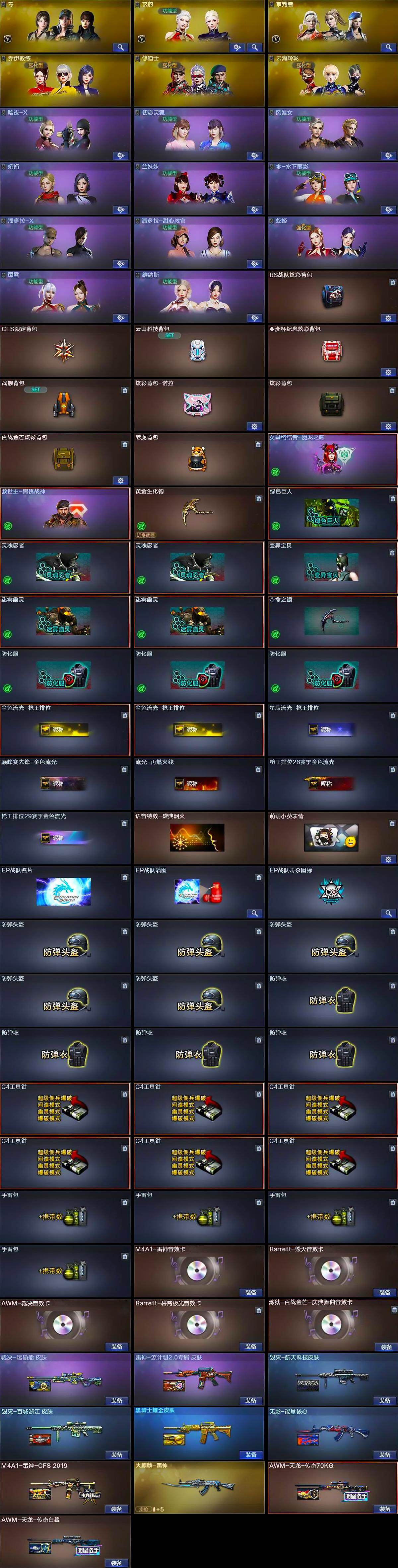 【道具】:BS战队炫彩背包,CFS限定背包,云山科技背包,亚洲杯纪念炫彩背包,战舰背包,炫彩背包-诺拉,炫彩背包,百战金芒炫彩背包,老虎背包,女皇终结者-魔龙之吻,救世主-黑桃战神,黄金生化钩,绿色巨人,灵魂忍者*2,变异宝贝,迷雾幽灵*2,夺命之镰,防化服*3,金色流光-枪王排位*2,星辰流光-枪王排位,巅峰赛先锋-金色流光,流光-再燃火线,枪王排位28赛季金色流光,枪王排位29赛季金色流光,语音特效-盛典烟火,萌萌小葵表情,EP战队名片,EP战队喷图,EP战队击杀图标,防弹头盔*5,防弹衣*4,C4工具钳*6,手雷包*4