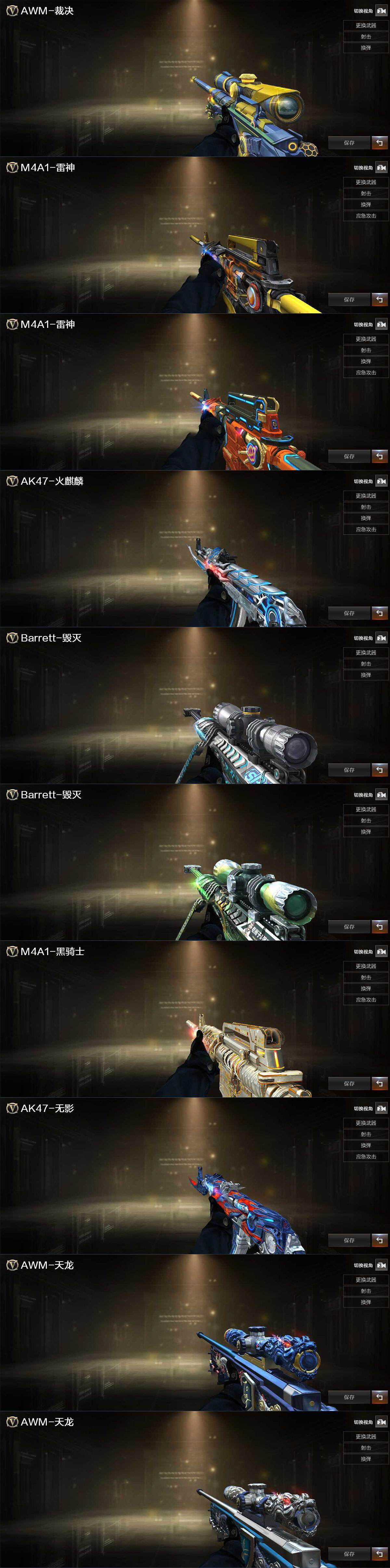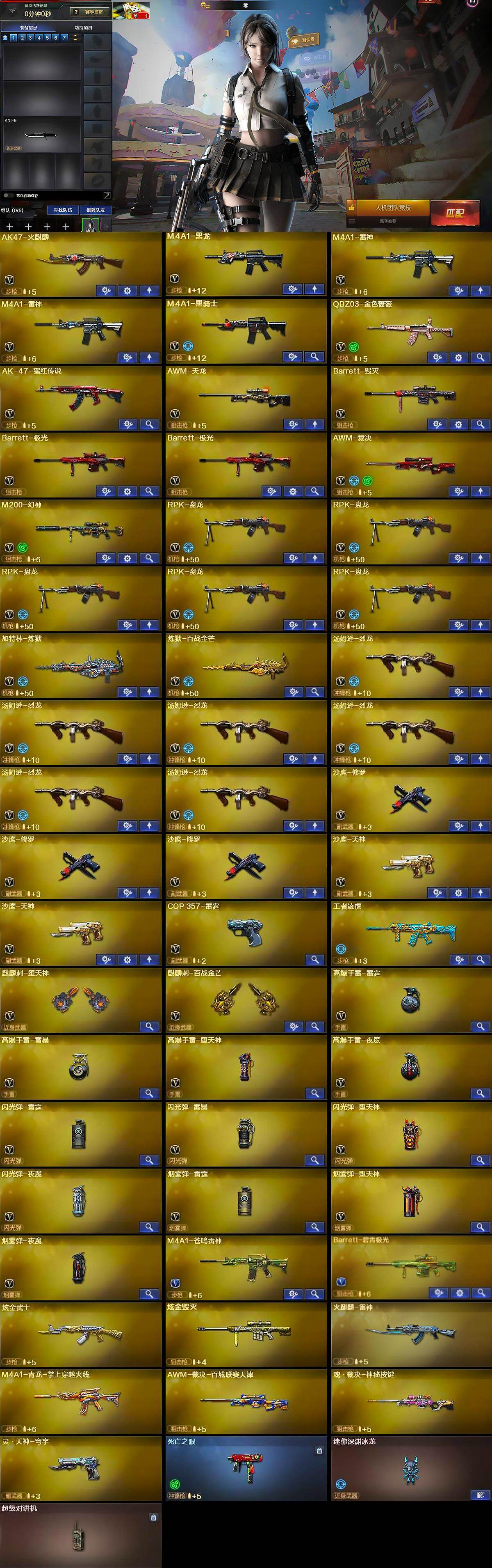 【英雄级武器】:AK47-火麒麟,M4A1-黑龙,M4A1-雷神*2,M4A1-黑骑士,QBZ03-金色蔷薇,AK-47-猩红传说,AWM-天龙,Barrett-毁灭,Barrett-极光*2,AWM-裁决,M200-幻神,RPK-盘龙*5,加特林-炼狱,炼狱-百战金芒,汤姆逊-烈龙*6,沙鹰-修罗*3,沙鹰-天神*2,COP-雷霆,麒麟刺-堕天神,麒麟刺-百战金芒,高爆手雷-雷霆,高爆手雷-雷暴,高爆手雷-堕天神,高爆手雷-夜魔,闪光弹-雷霆,闪光弹-雷暴,闪光弹-堕天神,闪光弹-夜魔,烟雾弹-雷霆,烟雾弹-堕天神,烟雾弹-夜魔,M4A1-苍鸣雷神,Barrett-碧霄极光