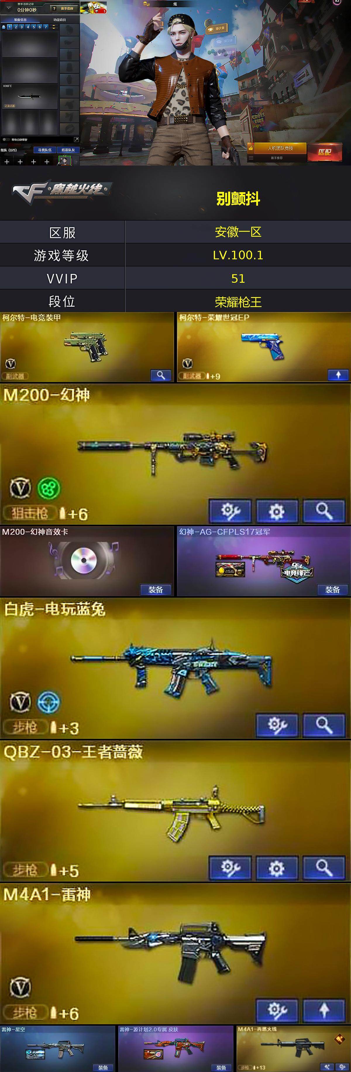 - [16946106]北方大区-19V-4王者武器数-1炫金武器数 【传说武器】:传说幽瞳 【热门武器】:传说幽瞳,M4A1-青龙,M200-幻神,金色蔷薇-古蛇迷踪,修罗-古蛇迷踪,Kar98K-星神,金色小号,Cat-刀锋,牛牛-AK47 【王者炫金武器】:炫金毁灭 【音效卡】:修罗-古蛇迷踪音效卡,QBZ03-金色蔷薇-古蛇迷踪音效卡,Kar98K-星神音效卡 【皮肤】:白虎-AG-CFPLS20冠军,星神-漫游,炼狱-星空,屠龙-星耀 皮肤,麒麟刺-甜蜜糖果 皮肤 【角色】:瞳,审判者,王者雾萌萌,蛇隐宗,芳心审判者,风暴女*2,嘉年华灵狐,娟娟,猎狐者-追月,灵动武士,曼陀罗-X,玫瑰花神,萌儿,娜塔莉娅,蛇姬,斯沃特-X,蜀雪,兔囡囡,雪莉杨-摸金校尉,夜玫瑰-幻能朋克,樱-战斗天使,影武者-X 【人偶武器】:白虎-迷你小艾,Scar Light-马枪,Cat-刀锋,牛牛-AK47,灵狐娃娃手雷*2 【暴走生化】:超级对讲机 【挑战大师】:激光毁灭者III-白马银枪*2 【英雄级武器】:M4A1-黑龙,M4A1-雷神,AN94-超新星,AK47-机械迷城,AK47-黑鲨,M4A1-青龙,金色蔷薇-古蛇迷踪,AWM-天龙,Barrett-毁灭,M200-幻神,Kar98K-星神,Barrett-金色蔷薇,王者风神-觉醒版,AA-12-雷霆,修罗-古蛇迷踪,麒麟刺,高爆手雷-古蛇迷踪,闪光弹-雷霆王者-觉醒版,烟雾弹-古蛇迷踪,烟雾弹-雷霆王者-觉醒版 【道具】:古蛇迷踪炫彩背包,超级背包,绿色巨人,灵魂忍者,迷雾幽灵,夺命之镰,防化服*2,金色流光-枪王排位*2,星辰流光-枪王排位,枪王排位28赛季金色流光,枪王排位29赛季金色流光,语音特效-机器人,古蛇迷踪打击特效,蛇隐宗表情,防弹头盔*3,防弹衣*3,C4工具钳*3,手雷包*3 【特殊枪械】: