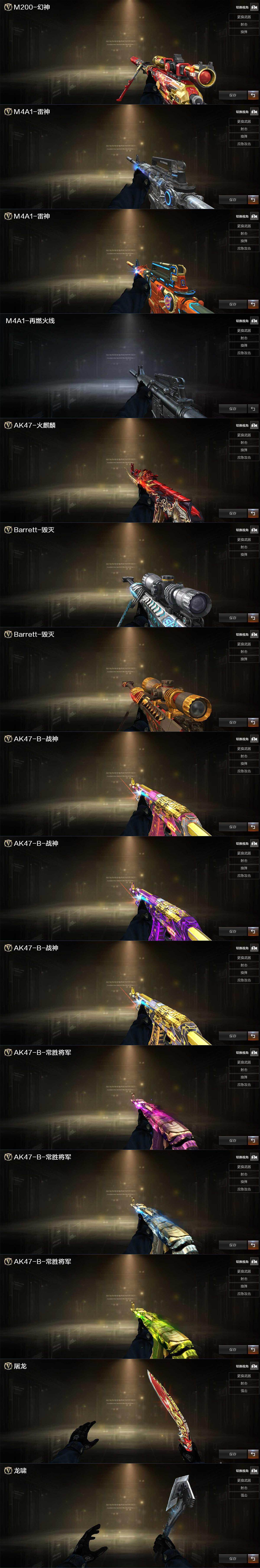 【皮肤】:幻神-AG-CFPLS17冠军,雷神-星空,雷神-源计划2.0专属 皮肤,M4A1-再燃火线,火麒麟-平天大圣,毁灭-航天科技皮肤,毁灭-英雄计划 皮肤,战神-粉色甜心皮肤,战神-紫绶金章皮肤,战神-流金岁月皮肤,AK47-B-常胜将军-曹操,AK47-B-常胜将军-刘备*2,AK47-B-常胜将军-孙权*2,屠龙-荣耀世冠AG,轻型军用手斧-再燃火线