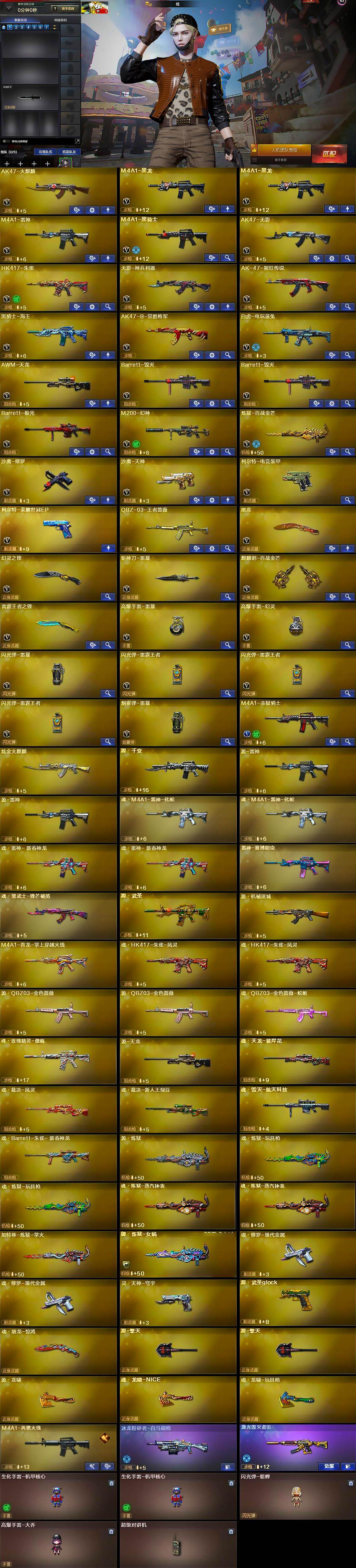 【英雄级武器】:AK47-火麒麟,M4A1-黑龙*2,M4A1-雷神,M4A1-黑骑士,AK47-无影,HK417-朱雀,无影-神兵利器,AK-47-猩红传说,黑骑士-海王,AK47-B-常胜将军,白虎-电玩蓝兔,AWM-天龙,Barrett-毁灭*2,Barrett-极光,M200-幻神,炼狱-百战金芒,沙鹰-修罗,沙鹰-天神,柯尔特-电竞装甲,柯尔特-荣耀世冠EP,屠龙,幻灵之锋,斩神刀-雷暴,麒麟刺-百战金芒,雷霆王者之锋-觉醒版,高爆手雷-雷暴,高爆手雷-幻灵,闪光弹-雷暴,闪光弹-雷霆王者-觉醒版*3,烟雾弹-雷暴,烟雾弹-荣耀世冠EP,M4A1-赤狱骑士