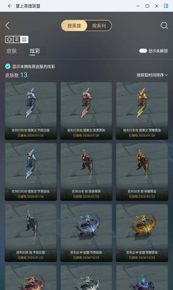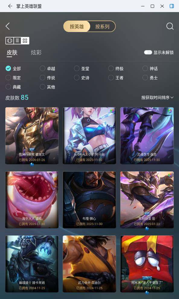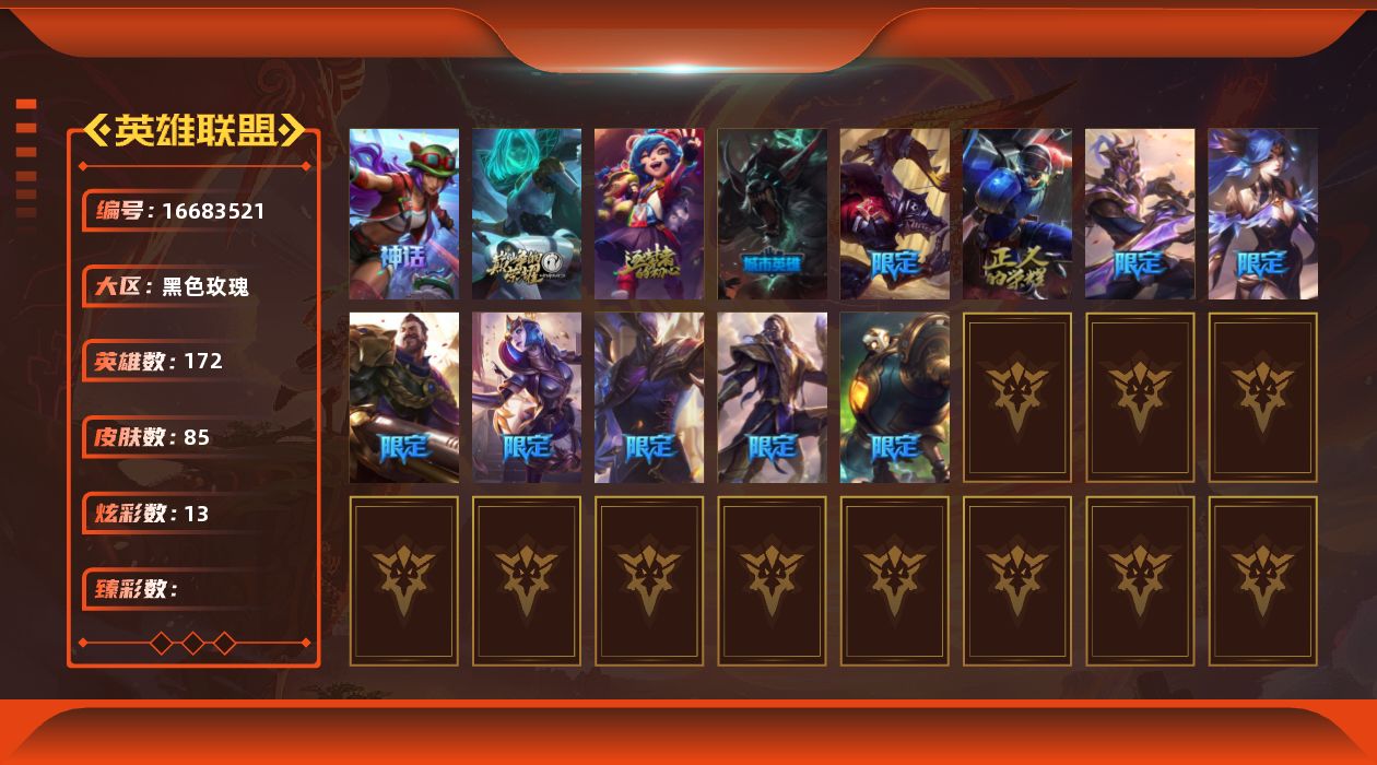 [16683521]黄金段位-172英雄-85皮肤-13炫彩-0终极-3神话-12限定-3传说-27史诗