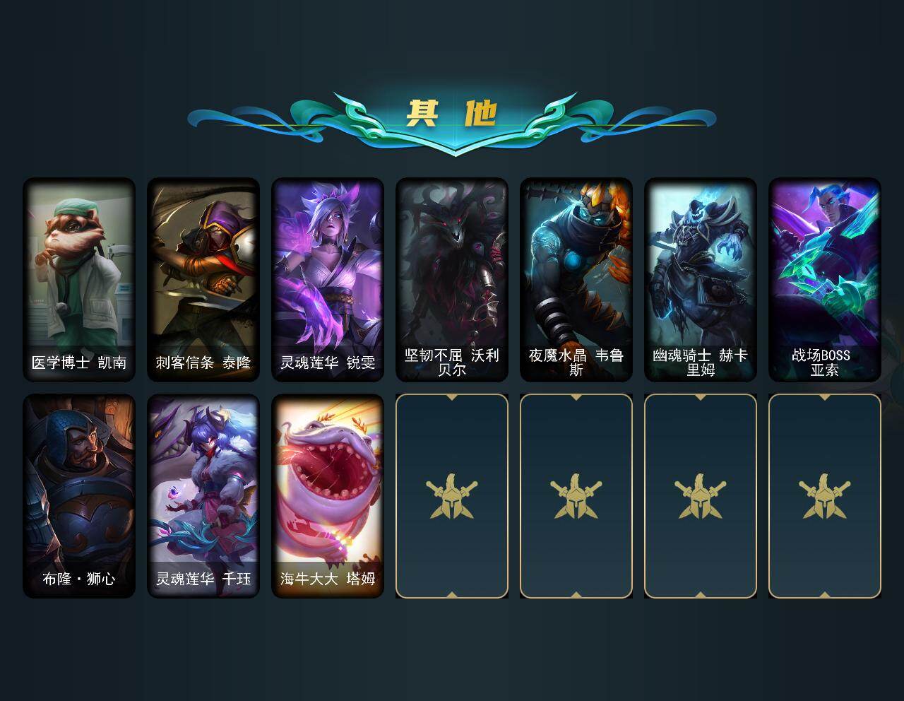 【其他皮肤1】:银河魔装机神安妮,深渊巨蟹厄加特,末世天使凯尔,星战易,无极执事易,哞利斯塔,蕉泥座人索拉卡,脏兮兮努努和威朗普,机械污染辛吉德,狂欢阿木木,忍龟拉莫斯,小丑工作坊萨科,健美教练蒙多,泳池派对蒙多,日冕女神卡尔玛,冰壶选手维迦,海贼参谋斯维因,荒野治安官凯特琳,末日余生布兰德,灵魂莲华薇恩,沙暴巨蝎斯卡纳,法国女仆奈德丽,武力全开乌迪尔,美酒节特使古拉加斯,英仙座珀尔修斯潘森,五杀摇滚吉他手莫德凯撒,KDAALLOUT阿卡丽,红色彗星凯南,医学博士凯南,刺客信条泰隆,灵魂莲华锐雯,坚韧不屈沃利贝尔,夜魔水晶韦鲁斯,幽魂骑士赫卡里姆,战场BOSS亚索,布隆狮心,灵魂莲华千珏,海牛大大塔姆