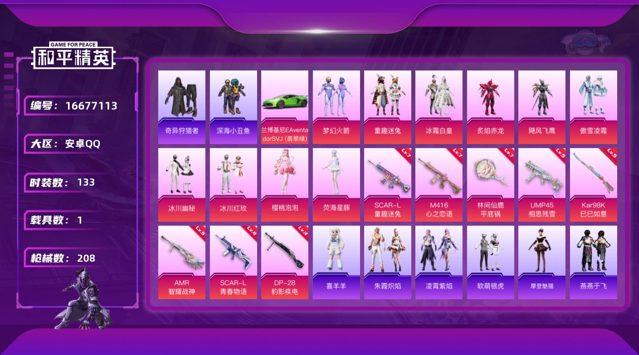 [16677113]安卓 手Q-11粉装-8特效枪-1载具-5粉色飞行器-69199热力值-11王牌印记-133套装-208枪皮 【热门品类】:粉装-梦幻火箭,粉装-童趣迷兔,套装-深海小丑鱼,套装-奇异狩猎者 【粉色套装】:粉装-梦幻火箭,粉装-冰霜白皇,粉装-童趣迷兔,粉装-炙焰赤龙,粉装-飓风飞鹰,粉装-傲雪凌霜,粉装-冰川幽秘,粉装-冰川红玫,角色-樱桃泡泡,角色-荧海星豚,角色-霁蓝缠春 【粉色枪皮等级】:SCAR-L-童趣迷兔(七级),SCAR-L-青春物语(四级),M416-心之恋语(七级),UMP45-相思残雪(五级),Kar98K-巳巳如意(五级),AMR-智耀战神(五级),DP-28-豹影疾电(三级),平底锅-林间仙鹿(七级) 【粉色载具】:兰博基尼Aventador SVJ(翡翠绿) 【粉色枪皮】:SCAR-L-童趣迷兔,SCAR-L-青春物语,M416-心之恋语,UMP45-相思残雪,Kar98K-巳巳如意,AMR-智耀战神,DP-28-豹影疾电,平底锅-林间仙鹿 【粉色飞行器】:梦幻火箭飞行器,扶摇飞仙飞行器,绒雪飘舞飞行器,歌者泠鸢飞行器 【粉色降落伞】:绝对恒星降落伞,梦幻火箭降落伞,扶摇飞仙降落伞,星之彼岸降落伞,暗夜玫瑰降落伞,海渊国主降落伞,绒雪飘舞降落伞,太空嘟嘟降落伞,旋转彩虹降落伞,冰川粉黛降落伞,星穹咏叹调降落伞,炫彩糖果降落伞 【稀有套装】:套装-雪国风尚,套装-炫彩糖果,角色-摩登魅猫,套装-燕燕于飞,套装-鱼渊荷华,角色-糖霜甜心,套装-新风雅兰,套装-紫幽梦,套装-蓝冰羽,套装-星影赞美诗,套装-霓虹热舞,套装-云朵鹅,套装-雪绒豹,套装-朱霞炽焰,套装-凌霄紫焰,玩偶服-喜羊羊 【稀有枪皮】:AUG-冰晶雪宝,AKM-夜灯,AKM-奇异狩猎者,AKM-彩虹符号,AKM-星之彼岸,AKM-萌趣颜团子,AKM-虎虎生威,AKM-霓虹街区,AKM-龙的传人,M16A4-夜灯,M16A4-幻世战舞者,M16A4-甜心亚梦,M16A4-蓝色火焰,SCAR-L-扶摇飞仙,SCAR-L-炫彩节奏,SCAR-L-玉兔迎春,SCAR-L-红色方程式,SCAR-L-冷漠罗丽,M416-糯团青竹,M416-红色方程式,M416-绯红前夜,GROZA-异彩先驱,GROZA-彩虹符号,GROZA-治愈之星,GROZA-田园牧歌,AUG-冰川粉黛,AUG-青