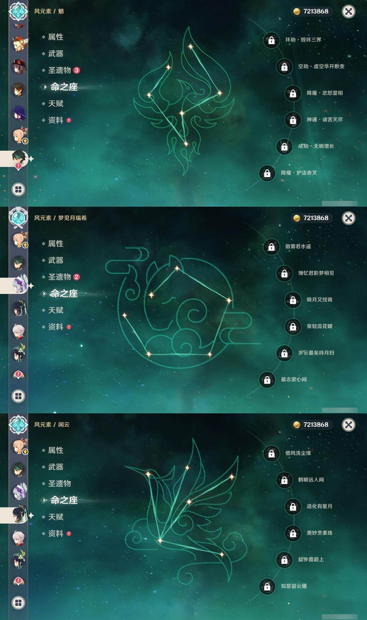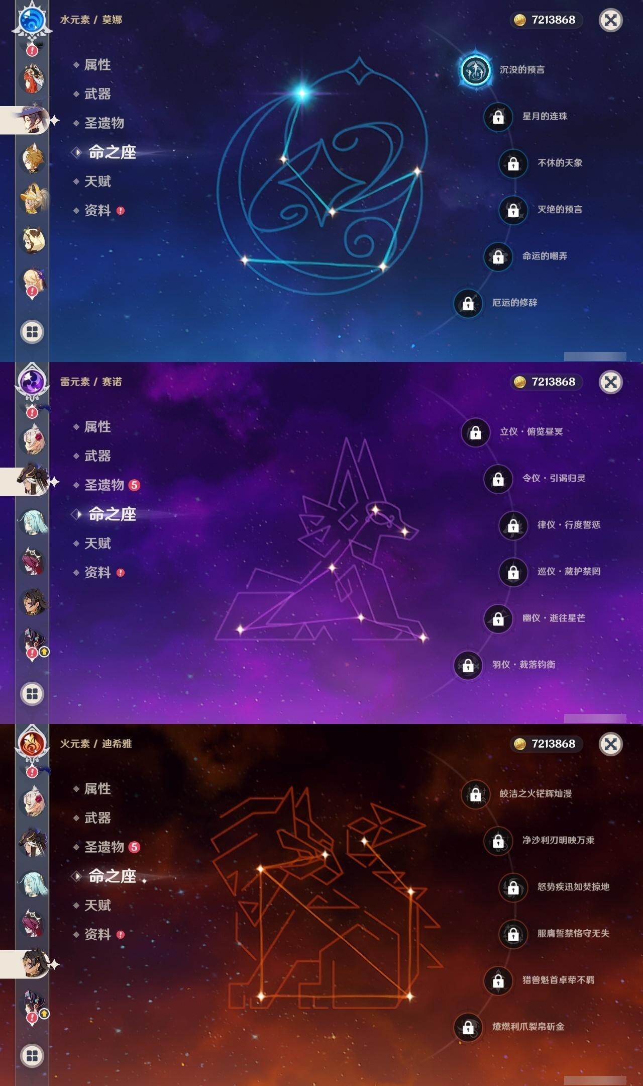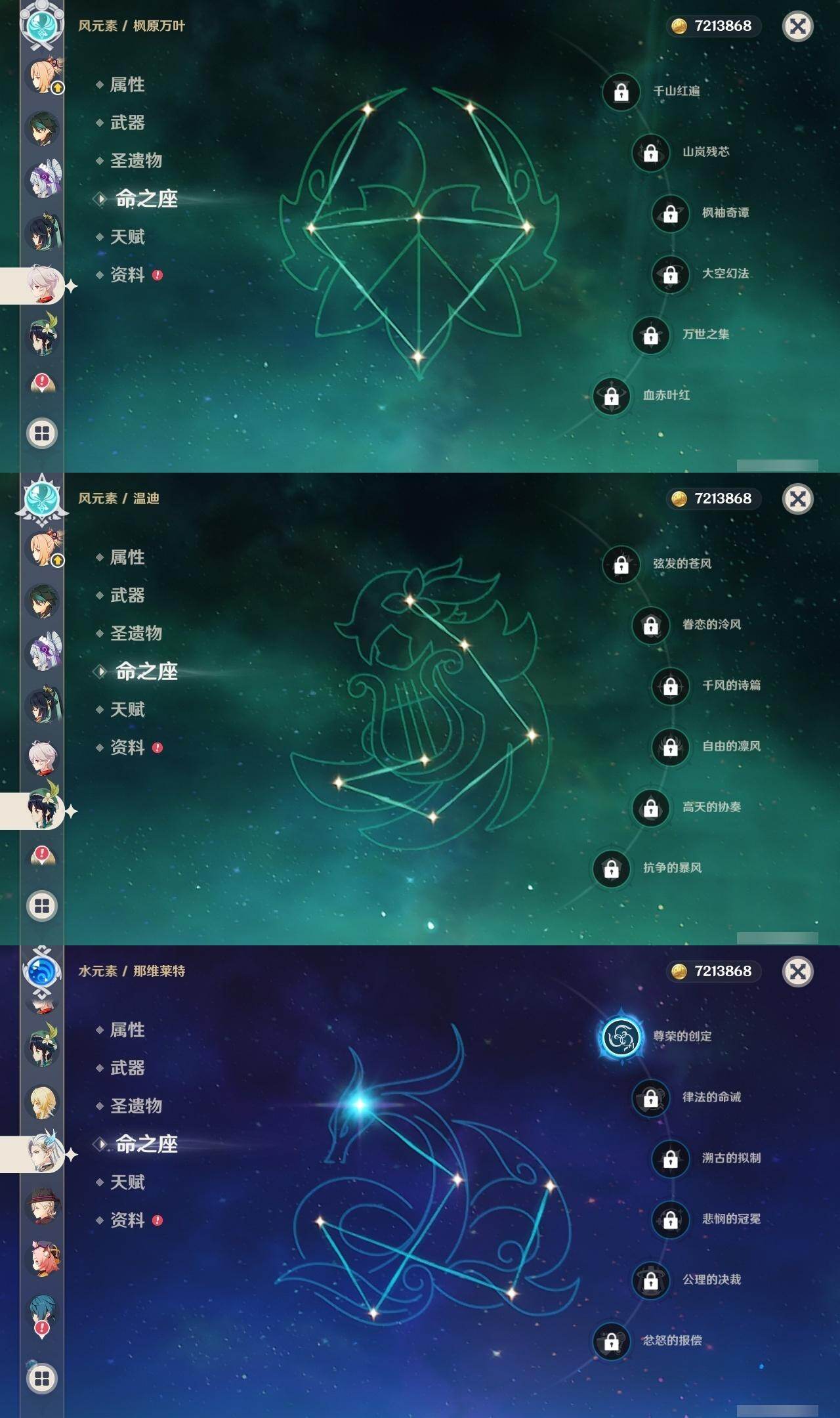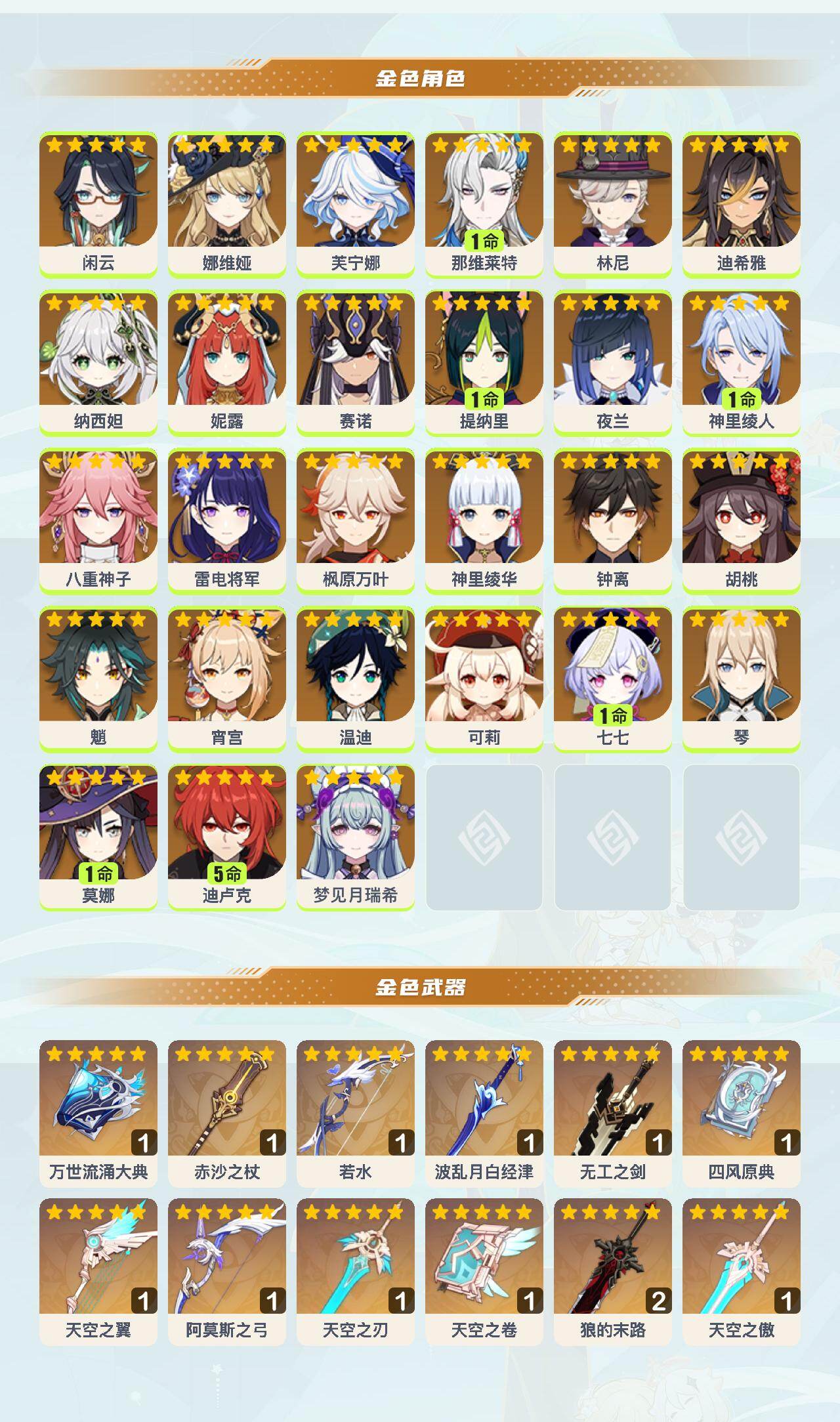 0命闲云,0命娜维娅,0命芙宁娜,1命那维莱特,0命林尼,0命迪希雅,0命纳西妲,0命妮露,0命赛诺,1命提纳里,0命夜兰,1命神里绫人,0命八重神子,0命雷电将军,0命枫原万叶,0命神里绫华,0命钟离,0命胡桃,0命魈,0命宵宫,0命温迪,0命可莉,1命七七,0命琴,1命莫娜,5命迪卢克,0命梦见月瑞希,精1万世流涌大典,精1赤沙之杖,精1若水,精1波乱月白经津,精1无工之剑,精1四风原典,精1天空之翼,精1阿莫斯之弓,精1天空之刃,精1天空之卷,精2狼的末路,精1天空之傲