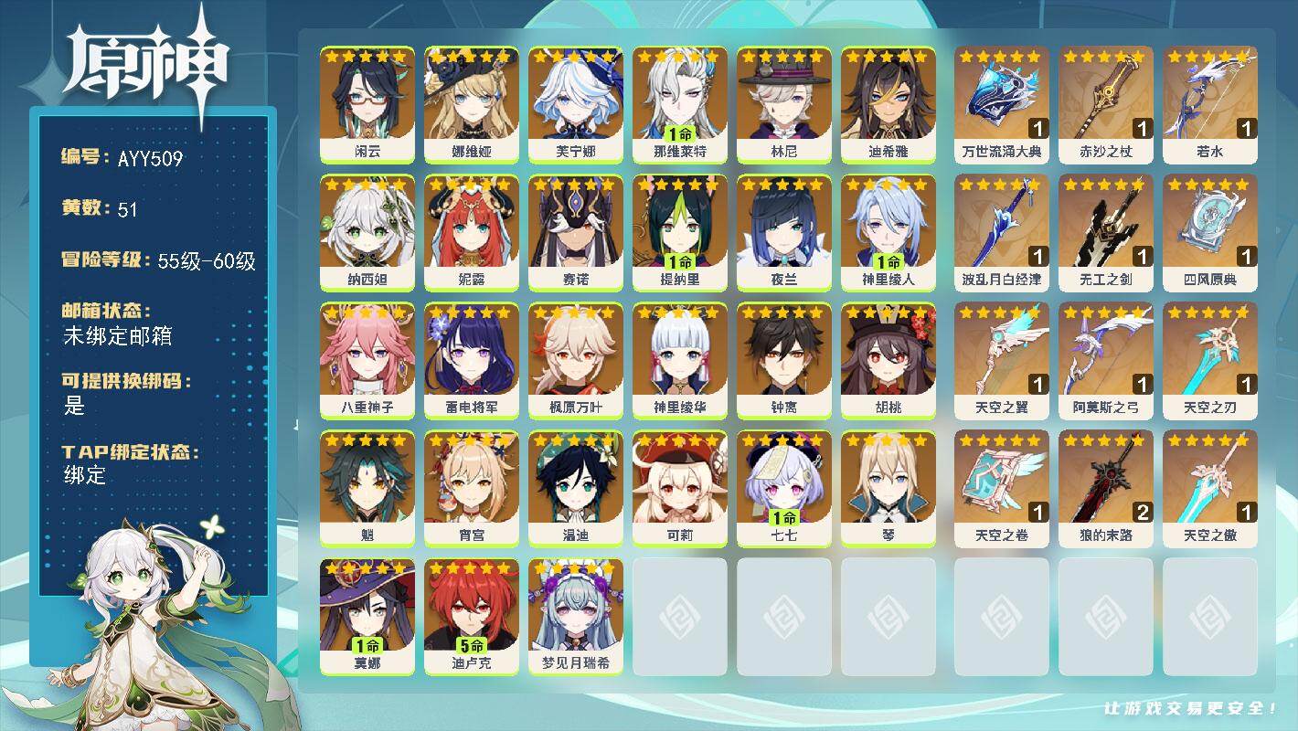 [16686911]60级/51黄/女主/27个五星角色/13个五星武器 0命闲云,0命娜维娅,0命芙宁娜,1命那维莱特,0命林尼,0命迪希雅,0命纳西妲,0命妮露,0命赛诺,1命提纳里,0命夜兰,1命神里绫人,0命八重神子,0命雷电将军,0命枫原万叶,0命神里绫华,0命钟离,0命胡桃,0命魈,0命宵宫,0命温迪,0命可莉,1命七七,0命琴,1命莫娜,5命迪卢克,0命梦见月瑞希,精1万世流涌大典,精1赤沙之杖,精1若水,精1波乱月白经津,精1无工之剑,精1四风原典,精1天空之翼,精1阿莫斯之弓,精1天空之刃,精1天空之卷,精2狼的末路,精1天空之傲