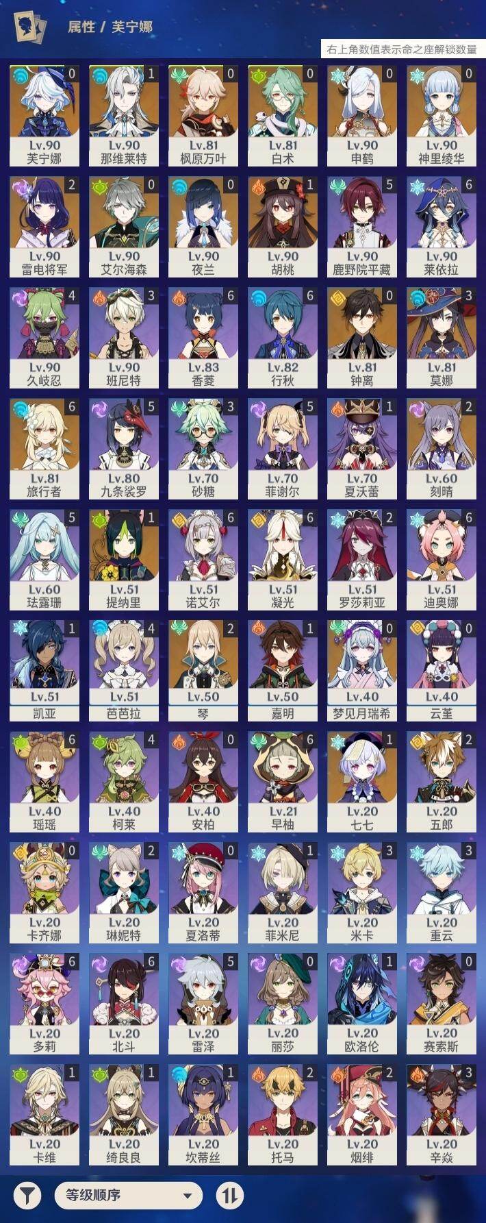 - [14861464]60级/52黄/女主/31个五星角色 0命克洛琳德,0命阿蕾奇诺,0命娜维娅,2命芙宁娜,3命那维莱特,0命白术,0命迪希雅,0命艾尔海森,0命纳西妲,3命提纳里,1命夜兰,0命神里绫人,0命雷电将军,0命枫原万叶,0命神里绫华,0命钟离,1命胡桃,0命甘雨,0命魈,0命宵宫,0命珊瑚宫心海,4命刻晴,1命七七,2命琴,2命莫娜,2命迪卢克,0命基尼奇,0命希诺宁,0命梦见月瑞希,0命爱可菲,0命杜林