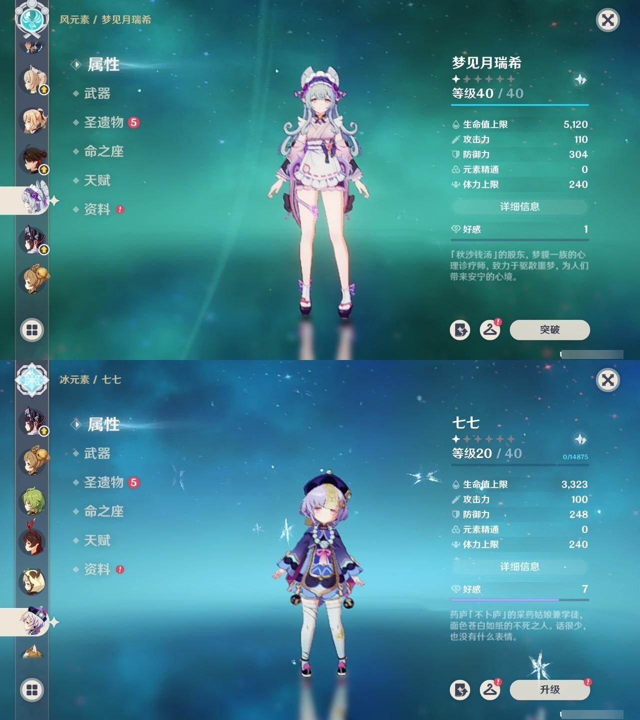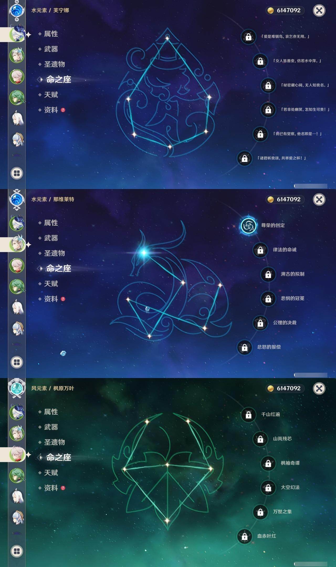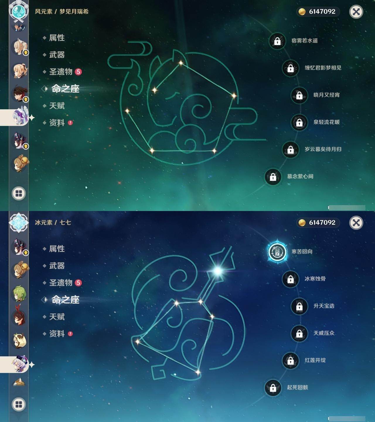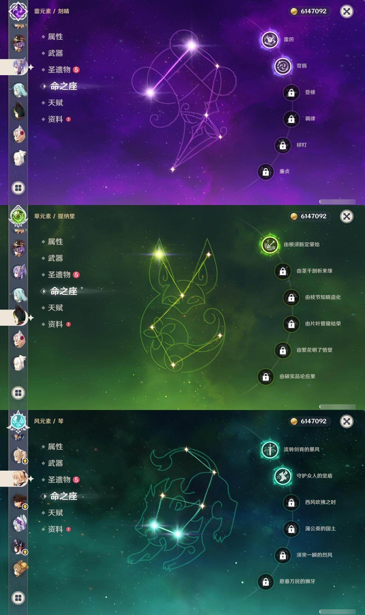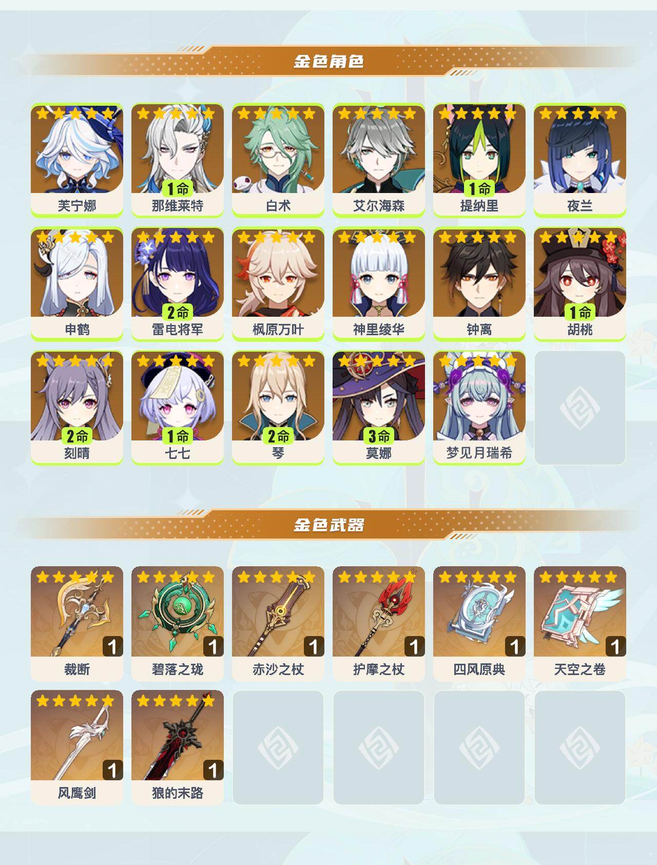 0命芙宁娜,1命那维莱特,0命白术,0命艾尔海森,1命提纳里,0命夜兰,0命申鹤,2命雷电将军,0命枫原万叶,0命神里绫华,0命钟离,1命胡桃,2命刻晴,1命七七,2命琴,3命莫娜,0命梦见月瑞希,精1裁断,精1碧落之珑,精1赤沙之杖,精1护摩之杖,精1四风原典,精1天空之卷,精1风鹰剑,精1狼的末路