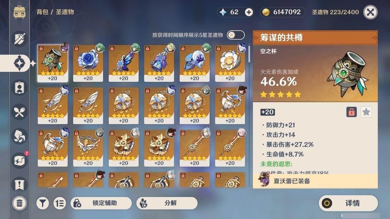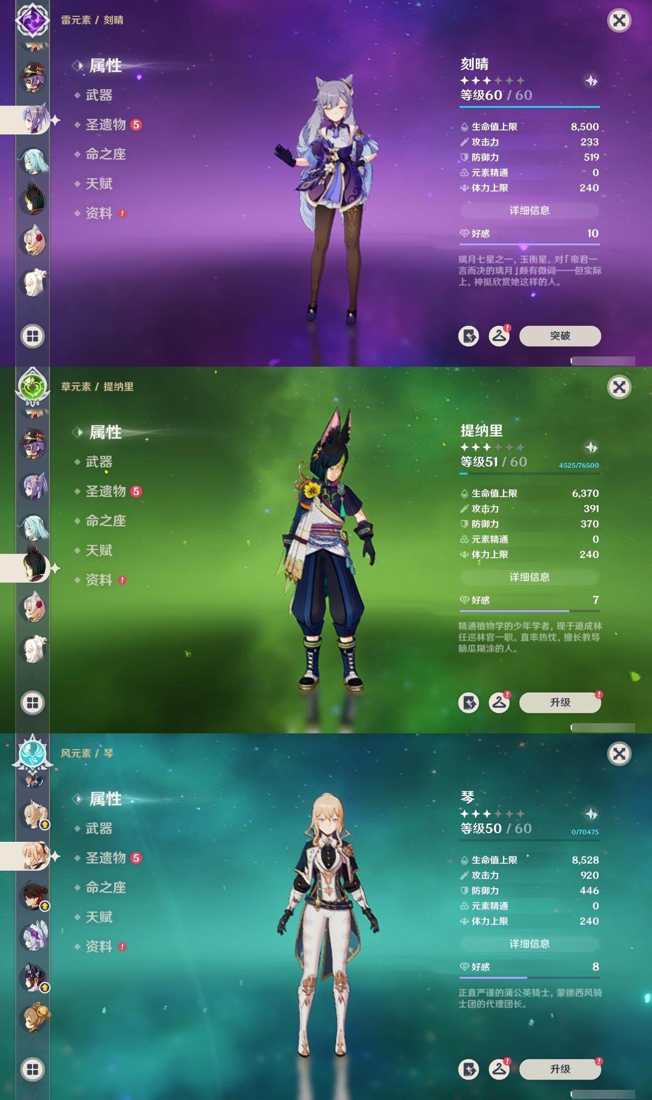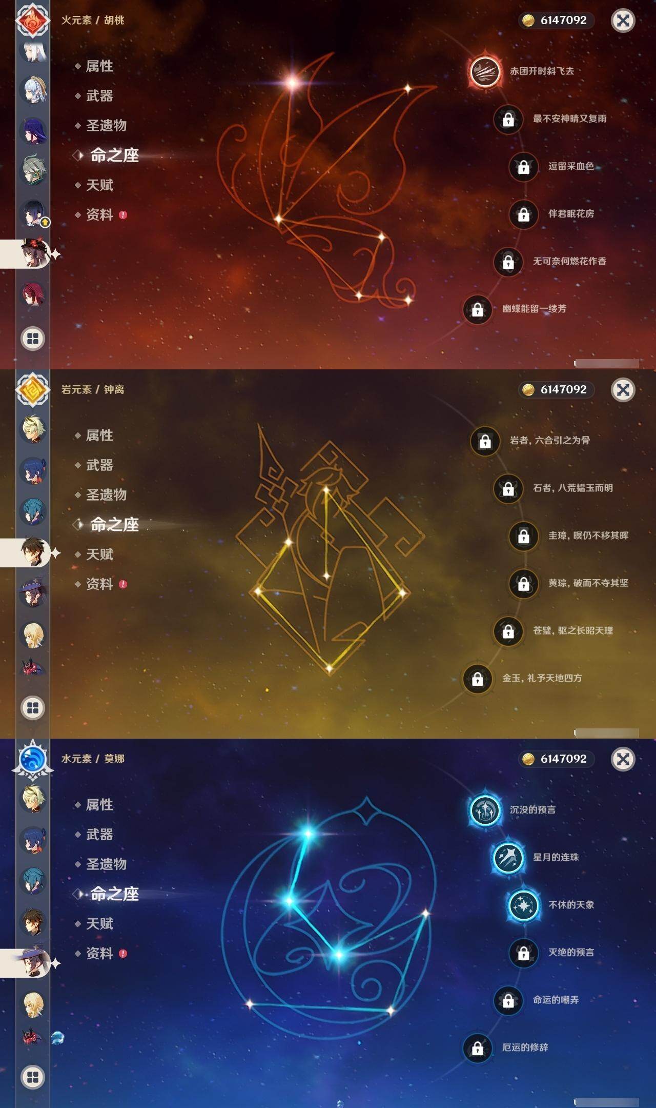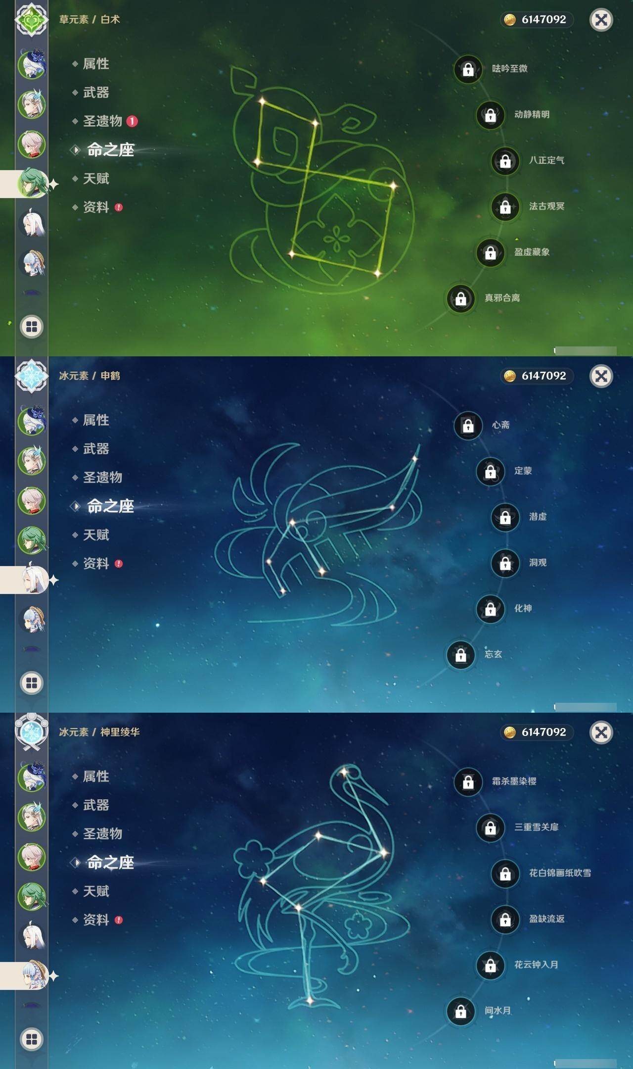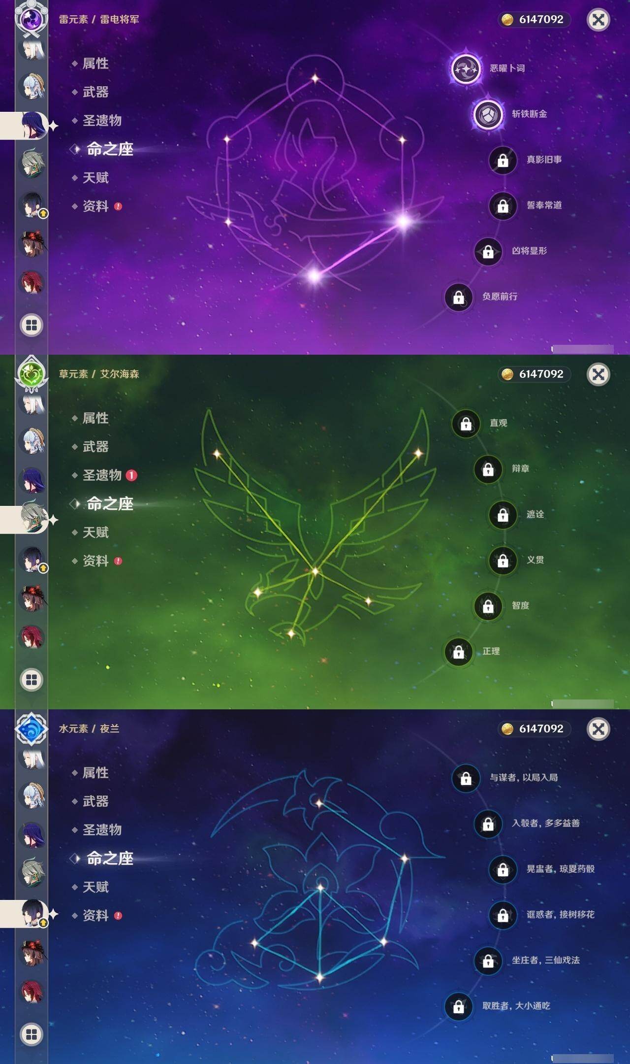 0命芙宁娜,1命那维莱特,0命白术,0命艾尔海森,1命提纳里,0命夜兰,0命申鹤,2命雷电将军,0命枫原万叶,0命神里绫华,0命钟离,1命胡桃,2命刻晴,1命七七,2命琴,3命莫娜,0命梦见月瑞希,精1裁断,精1碧落之珑,精1赤沙之杖,精1护摩之杖,精1四风原典,精1天空之卷,精1风鹰剑,精1狼的末路