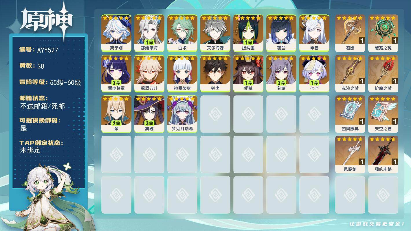 [16687001]59级/38黄/女主/17个五星角色/8个五星武器 0命芙宁娜,1命那维莱特,0命白术,0命艾尔海森,1命提纳里,0命夜兰,0命申鹤,2命雷电将军,0命枫原万叶,0命神里绫华,0命钟离,1命胡桃,2命刻晴,1命七七,2命琴,3命莫娜,0命梦见月瑞希,精1裁断,精1碧落之珑,精1赤沙之杖,精1护摩之杖,精1四风原典,精1天空之卷,精1风鹰剑,精1狼的末路