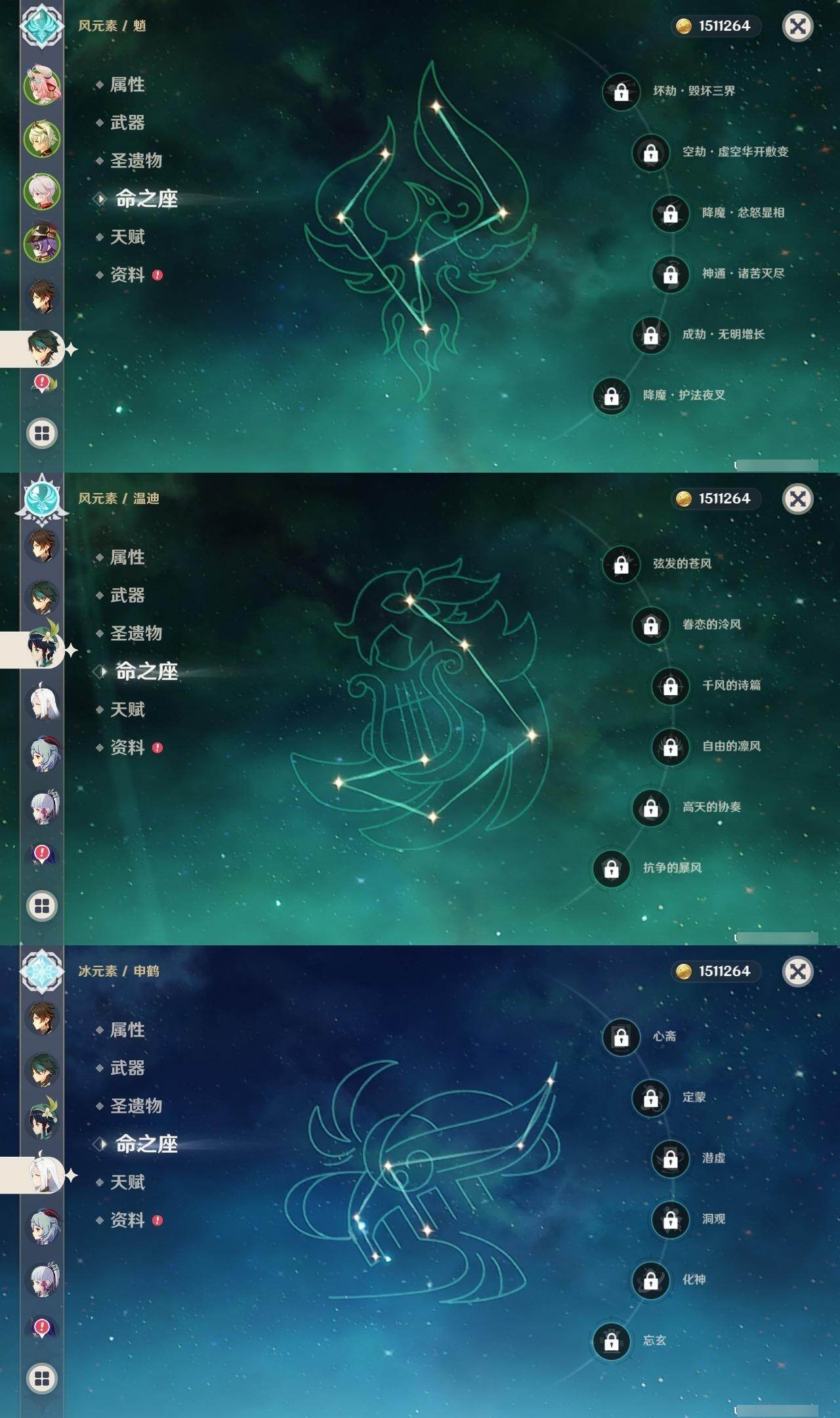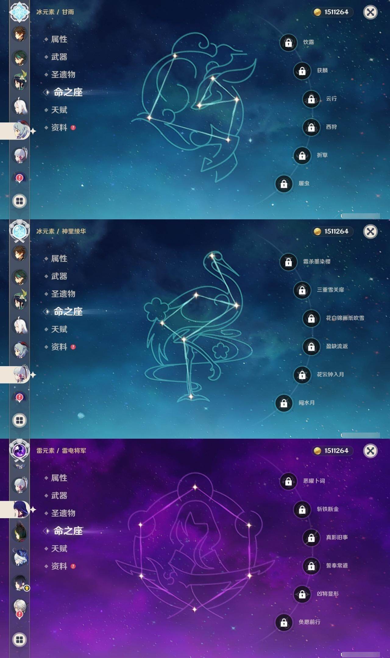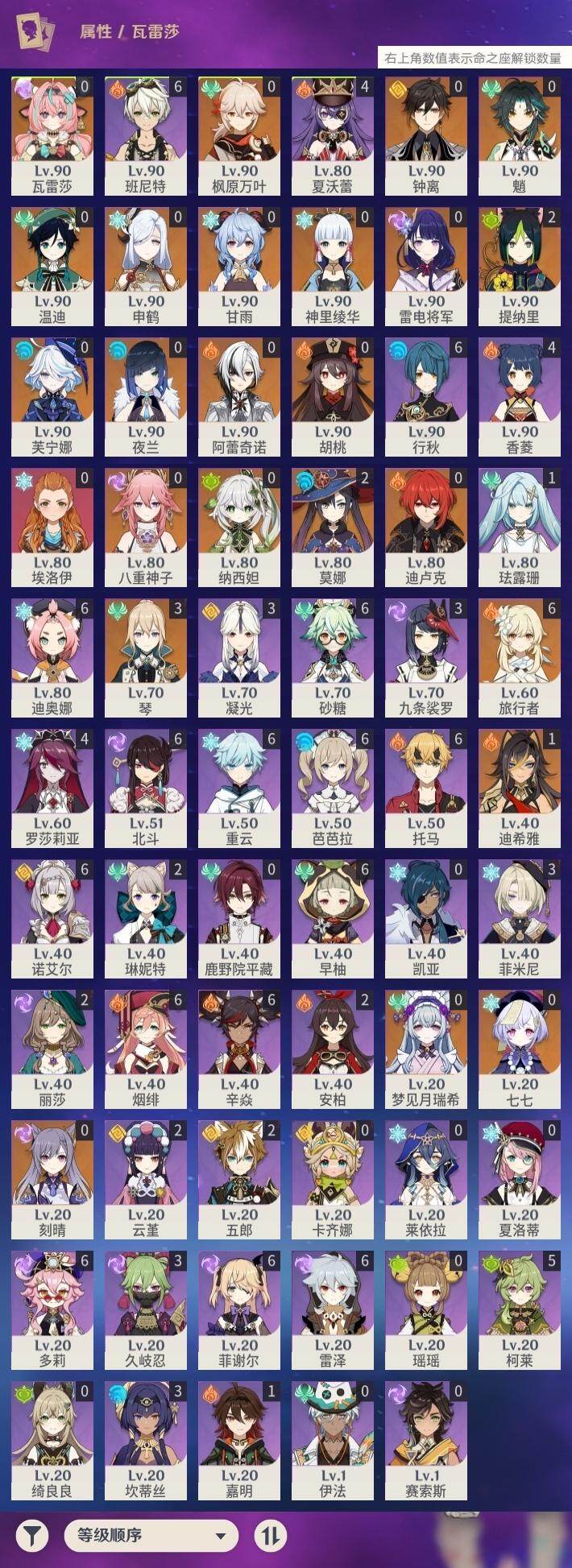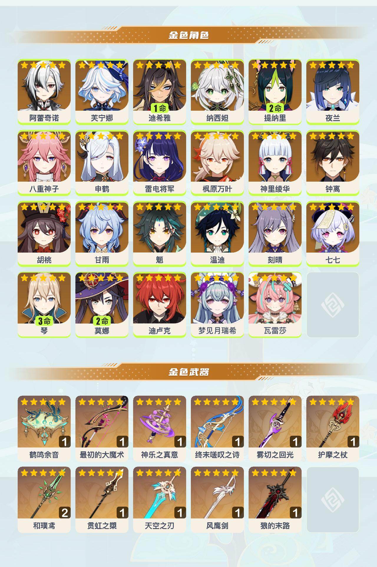 0命阿蕾奇诺,0命芙宁娜,1命迪希雅,0命纳西妲,2命提纳里,0命夜兰,0命八重神子,0命申鹤,0命雷电将军,0命枫原万叶,0命神里绫华,0命钟离,0命胡桃,0命甘雨,0命魈,0命温迪,0命刻晴,0命七七,3命琴,2命莫娜,0命迪卢克,0命梦见月瑞希,0命瓦雷莎,精1鹤鸣余音,精1最初的大魔术,精1神乐之真意,精1终末嗟叹之诗,精1雾切之回光,精1护摩之杖,精2和璞鸢,精1贯虹之槊,精1天空之刃,精1风鹰剑,精1狼的末路