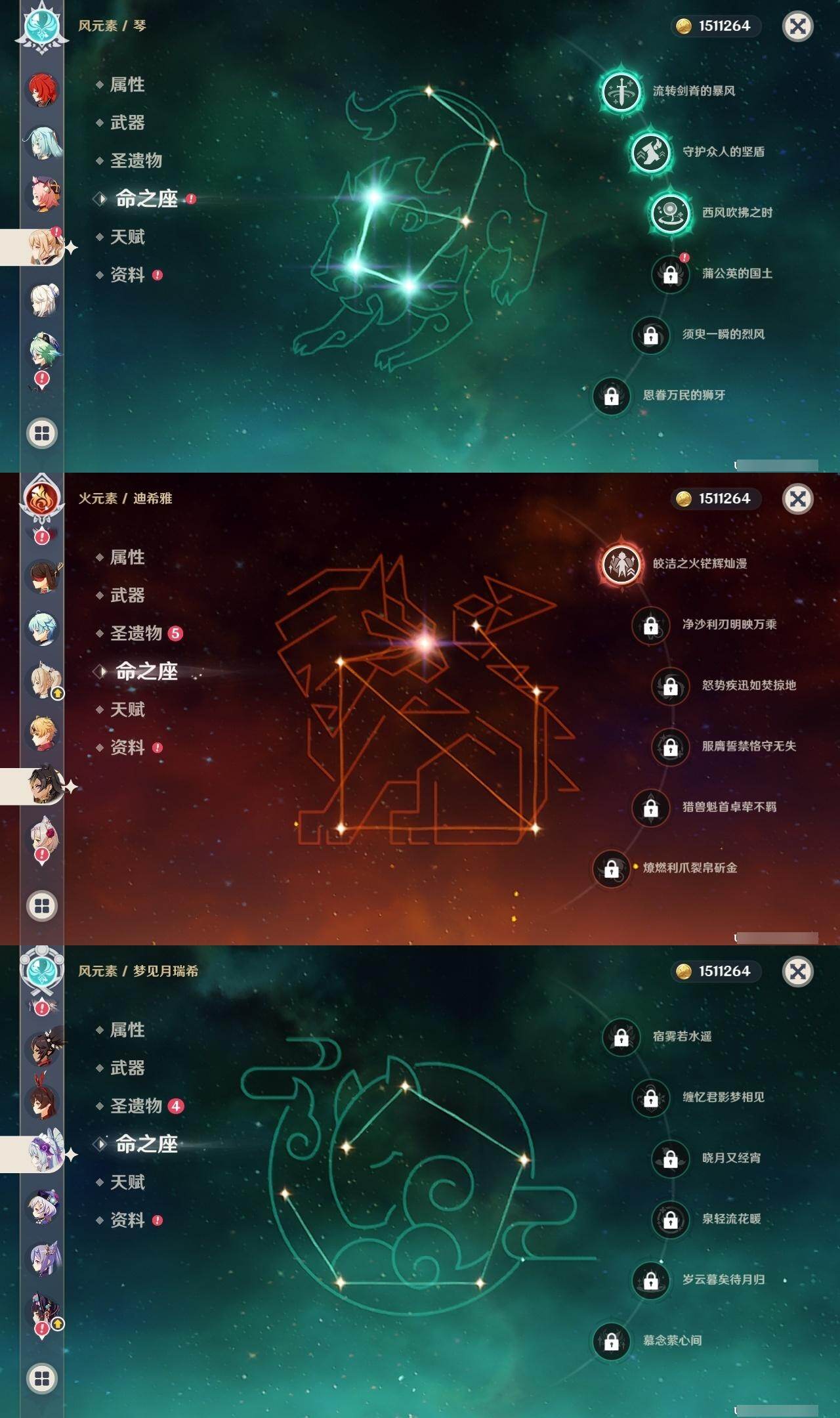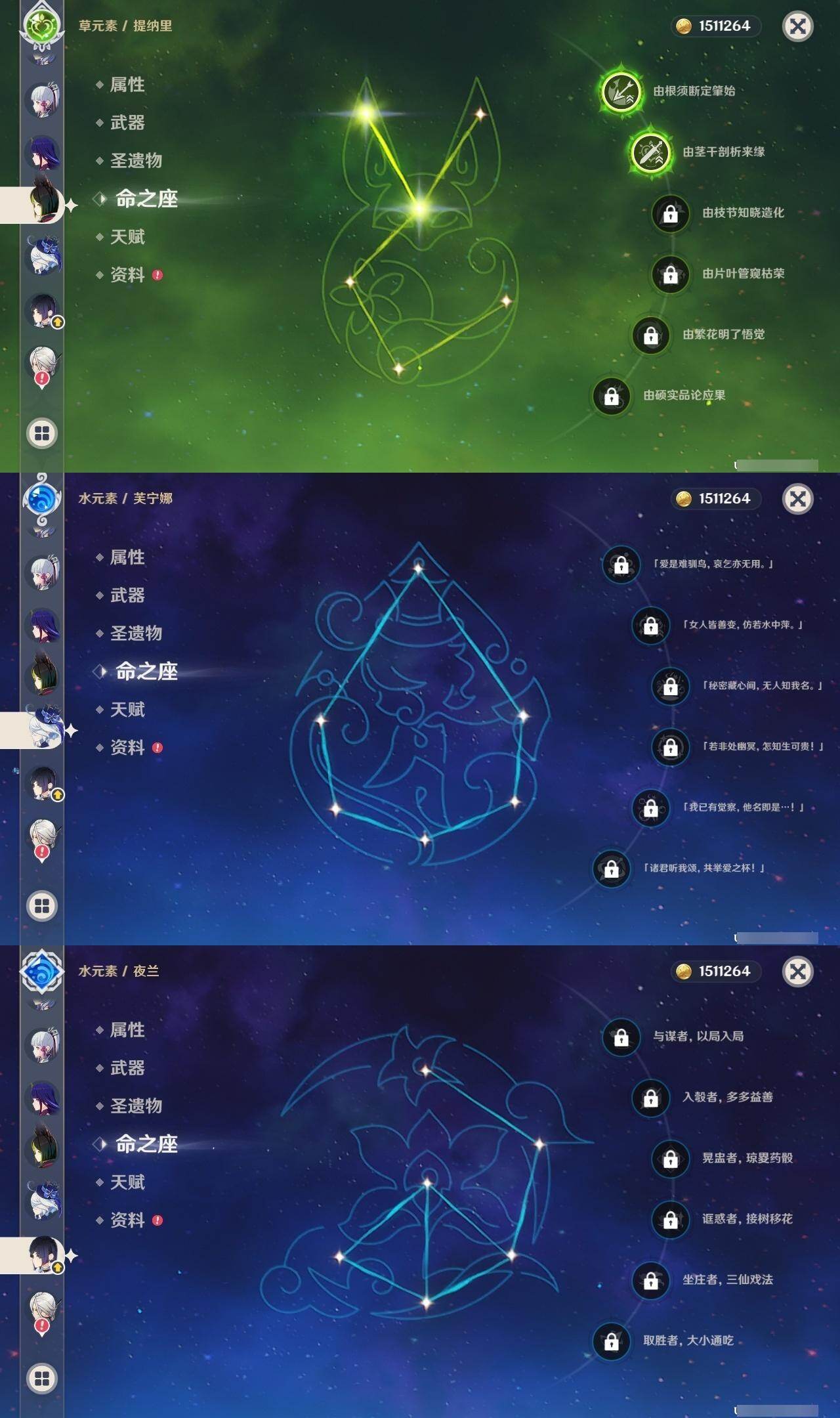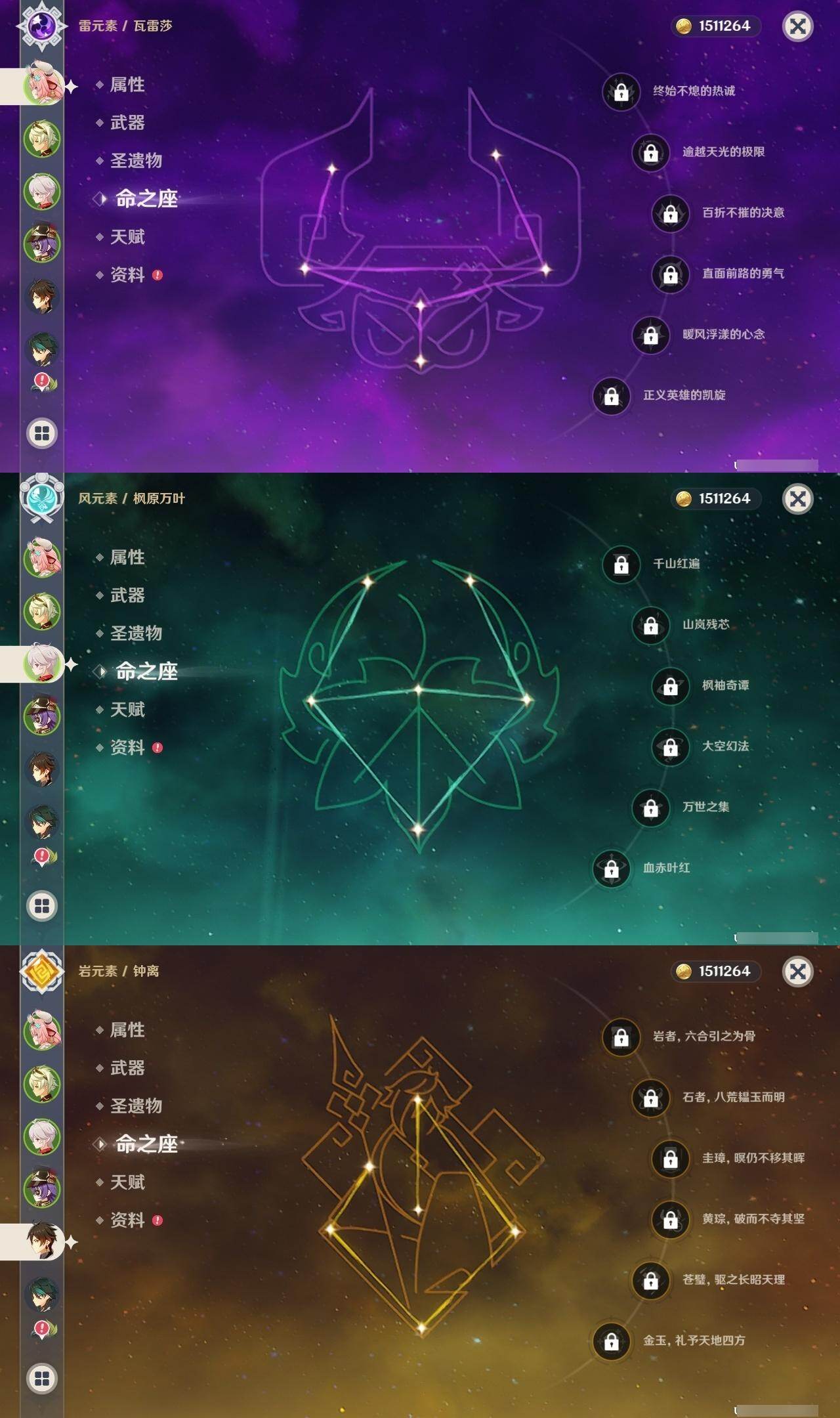 0命阿蕾奇诺,0命芙宁娜,1命迪希雅,0命纳西妲,2命提纳里,0命夜兰,0命八重神子,0命申鹤,0命雷电将军,0命枫原万叶,0命神里绫华,0命钟离,0命胡桃,0命甘雨,0命魈,0命温迪,0命刻晴,0命七七,3命琴,2命莫娜,0命迪卢克,0命梦见月瑞希,0命瓦雷莎,精1鹤鸣余音,精1最初的大魔术,精1神乐之真意,精1终末嗟叹之诗,精1雾切之回光,精1护摩之杖,精2和璞鸢,精1贯虹之槊,精1天空之刃,精1风鹰剑,精1狼的末路