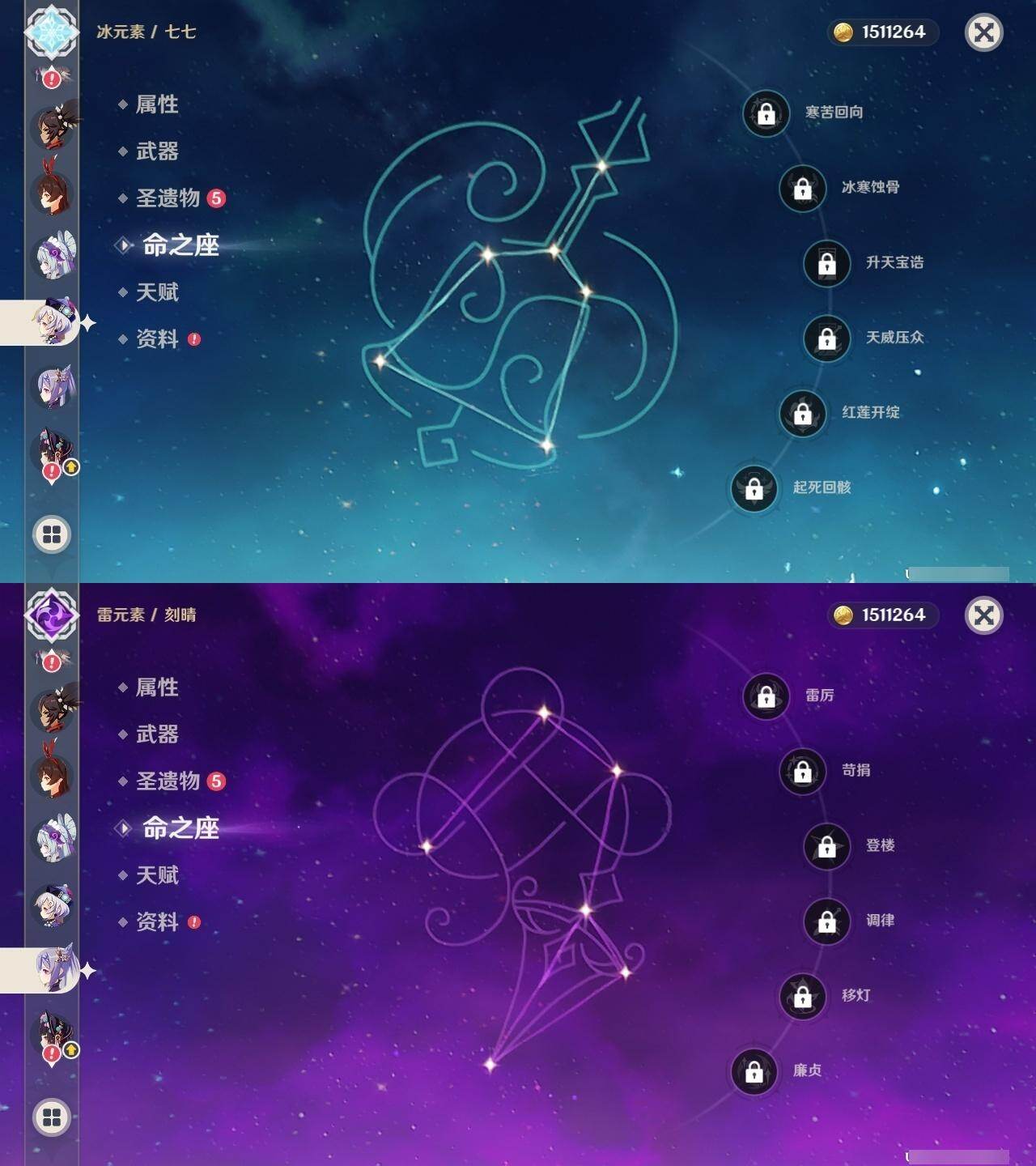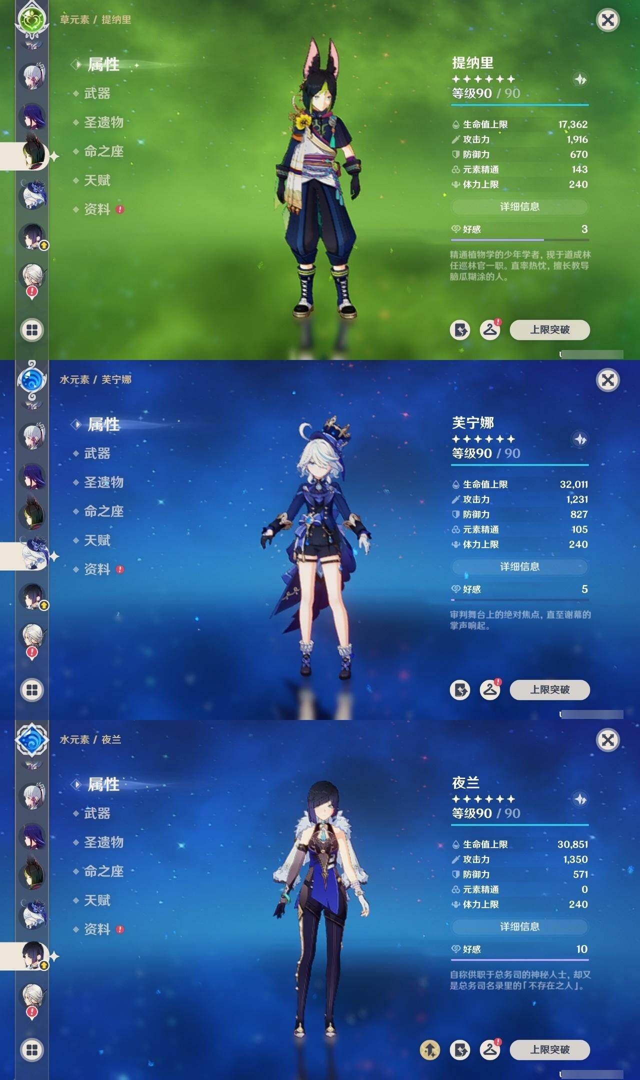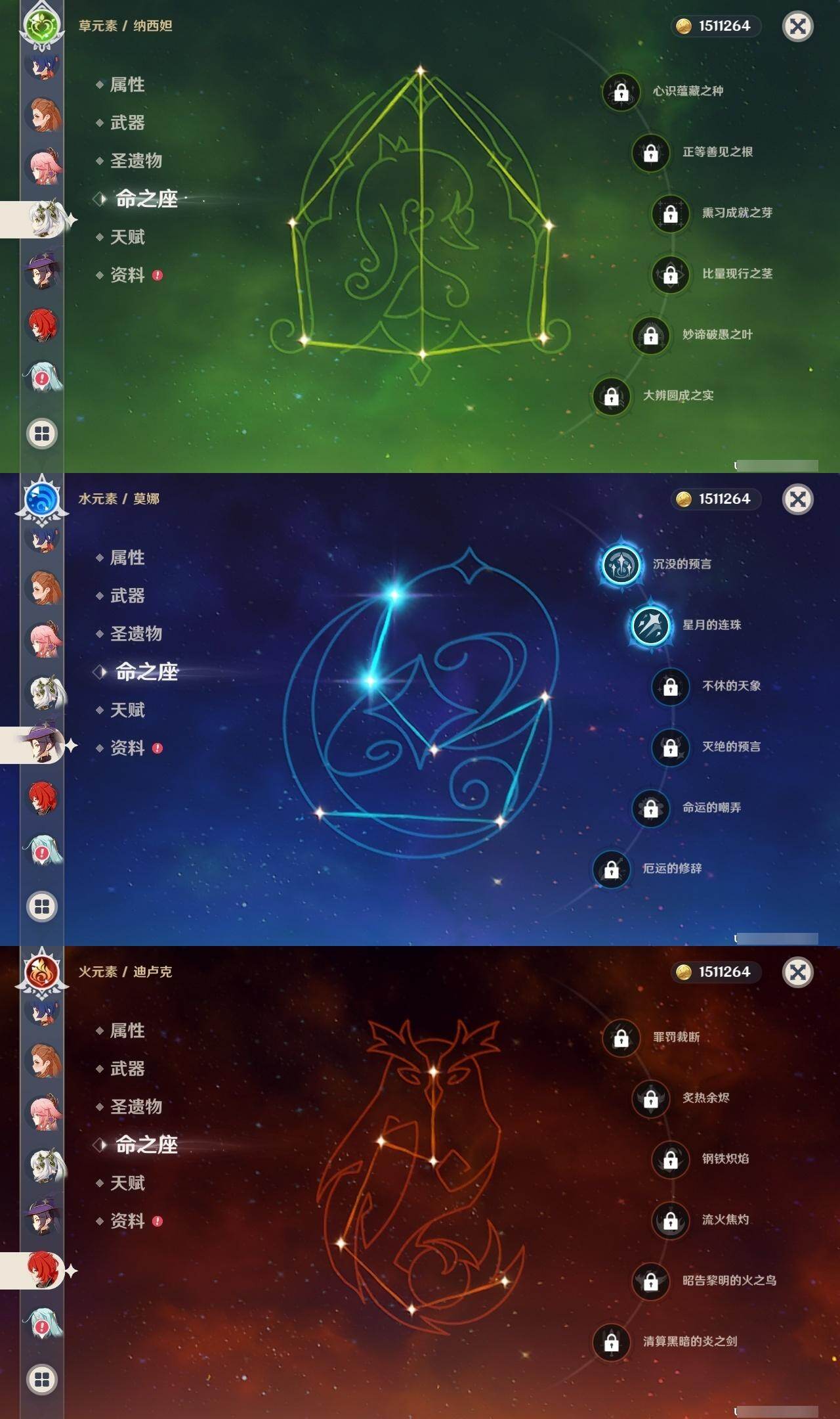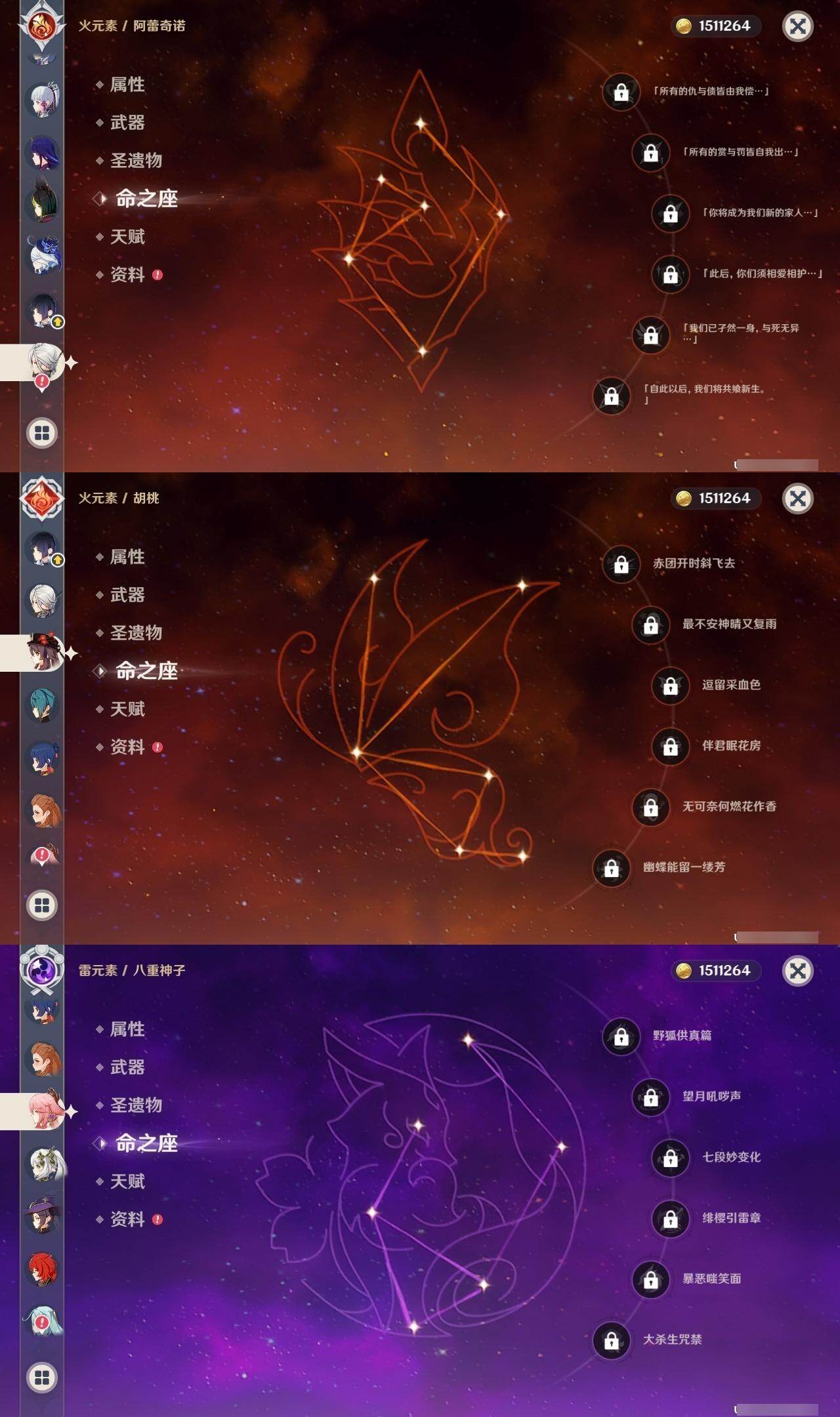0命阿蕾奇诺,0命芙宁娜,1命迪希雅,0命纳西妲,2命提纳里,0命夜兰,0命八重神子,0命申鹤,0命雷电将军,0命枫原万叶,0命神里绫华,0命钟离,0命胡桃,0命甘雨,0命魈,0命温迪,0命刻晴,0命七七,3命琴,2命莫娜,0命迪卢克,0命梦见月瑞希,0命瓦雷莎,精1鹤鸣余音,精1最初的大魔术,精1神乐之真意,精1终末嗟叹之诗,精1雾切之回光,精1护摩之杖,精2和璞鸢,精1贯虹之槊,精1天空之刃,精1风鹰剑,精1狼的末路