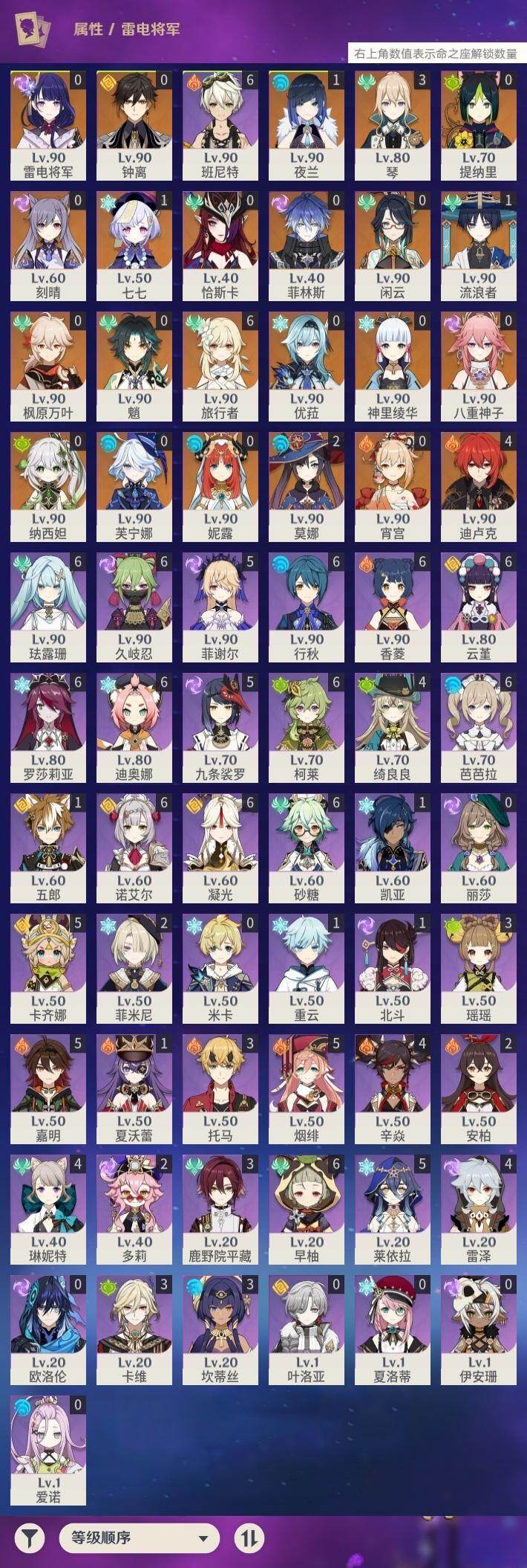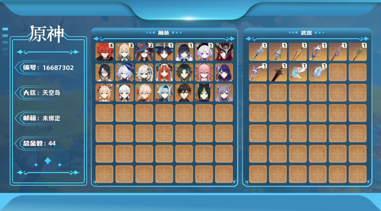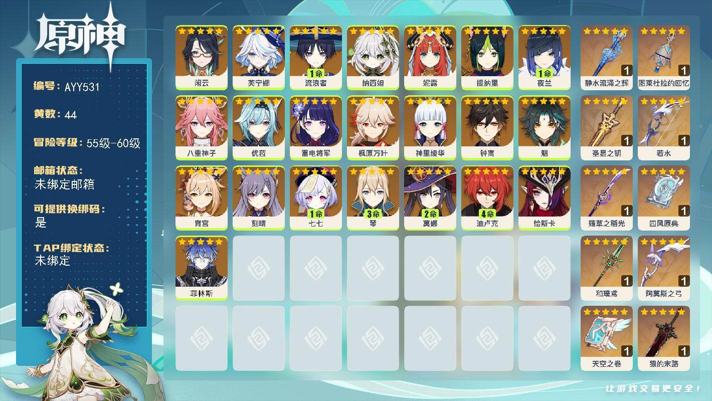 [16687302]60级/44黄/女主/22个五星角色/10个五星武器 0命闲云,0命芙宁娜,1命流浪者,0命纳西妲,0命妮露,0命提纳里,1命夜兰,0命八重神子,0命优菈,0命雷电将军,0命枫原万叶,0命神里绫华,0命钟离,0命魈,0命宵宫,0命刻晴,1命七七,3命琴,2命莫娜,4命迪卢克,0命恰斯卡,0命菲林斯,精1静水流涌之辉,精1图莱杜拉的回忆,精1圣显之钥,精1若水,精1薙草之稻光,精1四风原典,精1和璞鸢,精1阿莫斯之弓,精1天空之卷,精1狼的末路