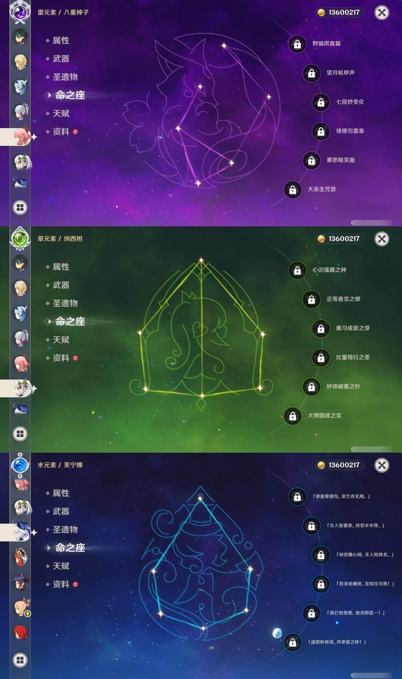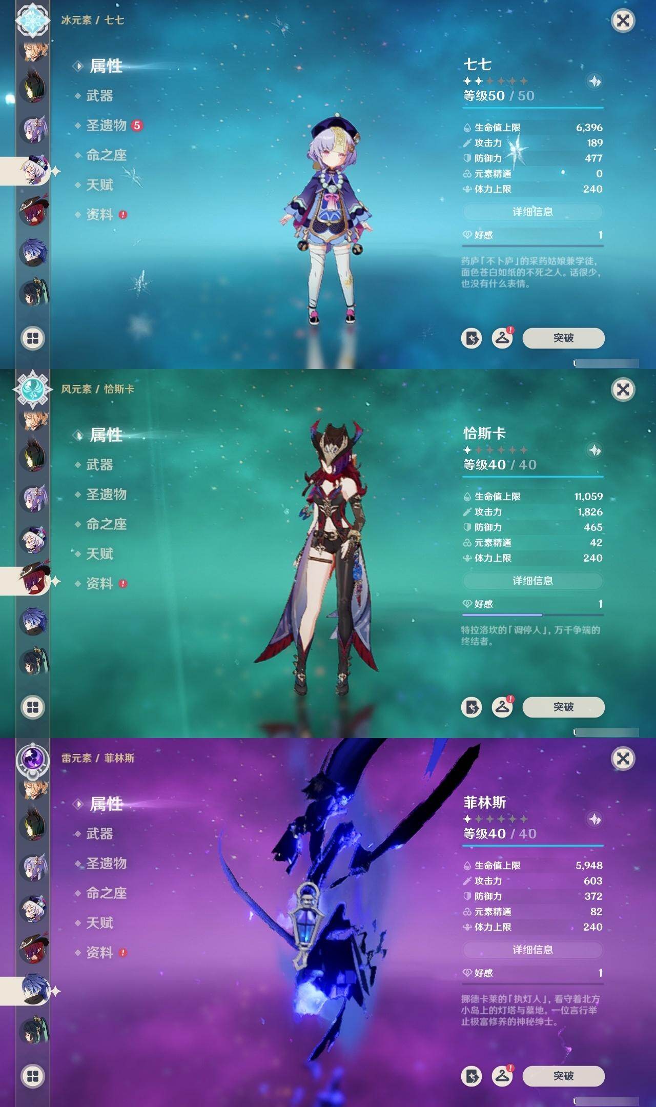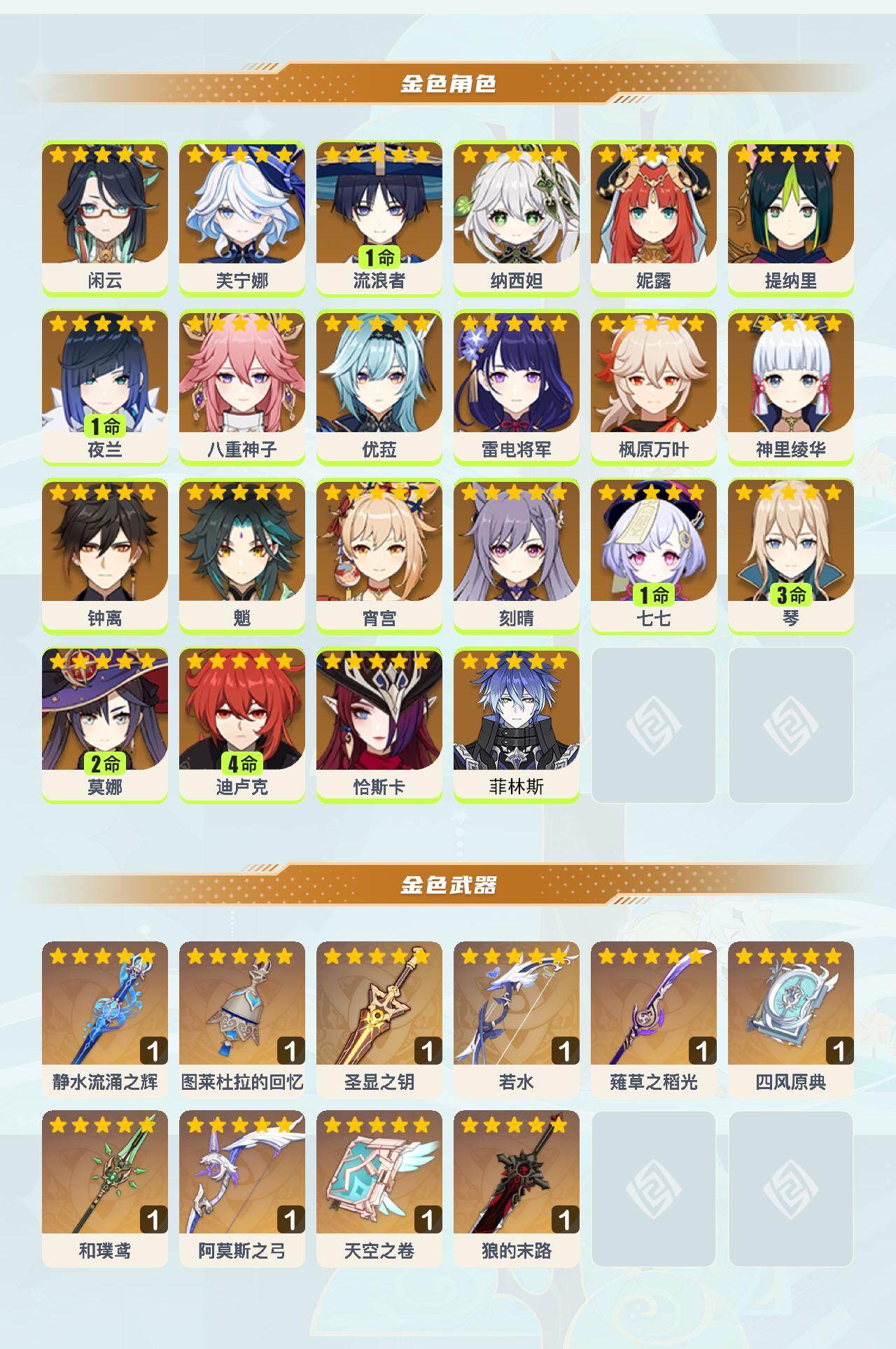0命闲云,0命芙宁娜,1命流浪者,0命纳西妲,0命妮露,0命提纳里,1命夜兰,0命八重神子,0命优菈,0命雷电将军,0命枫原万叶,0命神里绫华,0命钟离,0命魈,0命宵宫,0命刻晴,1命七七,3命琴,2命莫娜,4命迪卢克,0命恰斯卡,0命菲林斯,精1静水流涌之辉,精1图莱杜拉的回忆,精1圣显之钥,精1若水,精1薙草之稻光,精1四风原典,精1和璞鸢,精1阿莫斯之弓,精1天空之卷,精1狼的末路