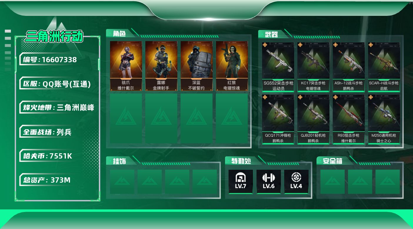 [16607338]【特价出售/店主推荐】 373m总资产-7551k哈伏币-60烽火等级-三角洲巅峰-7战场等级-列兵 【干员外观】:骇爪-维什戴尔,深蓝-不破誓约,红狼-电锯惊魂,露娜-金牌射手 【近战皮肤】:近战-黑鹰 【传说外观】:ASh-12战斗步枪-鹅鸭杀,SG552突击步枪-运动员,SCAR-H战斗步枪-启航,KC17突击步枪-电锯惊魂,QCQ171冲锋枪-鹅鸭杀,M250通用机枪-骑士之心,QJB201轻机枪-鹅鸭杀,R93狙击步枪-维什戴尔 【史诗外观】:K416突击步枪-潜袭者,KC17突击步枪-碎冰行动,PTR-32突击步枪-碎冰行动,ASh-12战斗步枪-无极限,AUG突击步枪-蝮蛇,M7战斗步枪-百步穿杨,SCAR-H战斗步枪-囚徒,G3战斗步枪-流沙送葬,AS Val突击步枪-百步穿杨,腾龙突击步枪-猎鳄行动,K437突击步枪-守护者,MP5冲锋枪-深海恐惧,MP5冲锋枪-战术竞备,MP5冲锋枪-竞技风,Vector冲锋枪-猎鳄行动,Vector冲锋枪-百步穿杨,勇士冲锋枪-工业狂潮,MP7冲锋枪-守护者,S12K霰弹枪-曙光,Mini-14射手步枪-守护者,M14射手步枪-工业狂潮,M700狙击步枪-竞技风,M700狙击步枪-蝮蛇,M700狙击步枪-百步穿杨,M700狙击步枪-哈夫克警备,AWM狙击步枪-无极限,AWM狙击步枪-流沙送葬,复合弓-守护者 【稀有外观】:SR-3M紧凑突击步枪-花岗岩,M4A1突击步枪-繁盛,AKM突击步枪-战术演练,AKM突击步枪-肃杀,QBZ95-1突击步枪-公平竞技,ASh-12战斗步枪-繁盛,M7战斗步枪-前沿科技,M7战斗步枪-捣蛋鬼,SCAR-H战斗步枪-荣耀列队,SCAR-H战斗步枪-黄昏,G3战斗步枪-战术演练,G3战斗步枪-主宰,腾龙突击步枪-冰天雪地,MP5冲锋枪-前沿科技,MP5冲锋枪-弄臣,MP5冲锋枪-哈夫克卫队,P90冲锋枪-黄昏,Vector冲锋枪-先锋,UZI冲锋枪-亚特兰蒂斯,野牛冲锋枪-前沿科技,SMG-45-行动开启,SMG-45冲锋枪-幻影结构,勇士冲锋枪-主宰,勇士冲锋枪-冰天雪地,QCQ171冲锋枪-前沿科技,S12K霰弹枪-战术演练,QJB201轻机枪-黄昏,QJB201轻机枪-哈夫克卫队,Mini-14射手步枪-荣耀列队,SR-25射手步枪-开拓,PSG-1射手步枪-主宰,SV