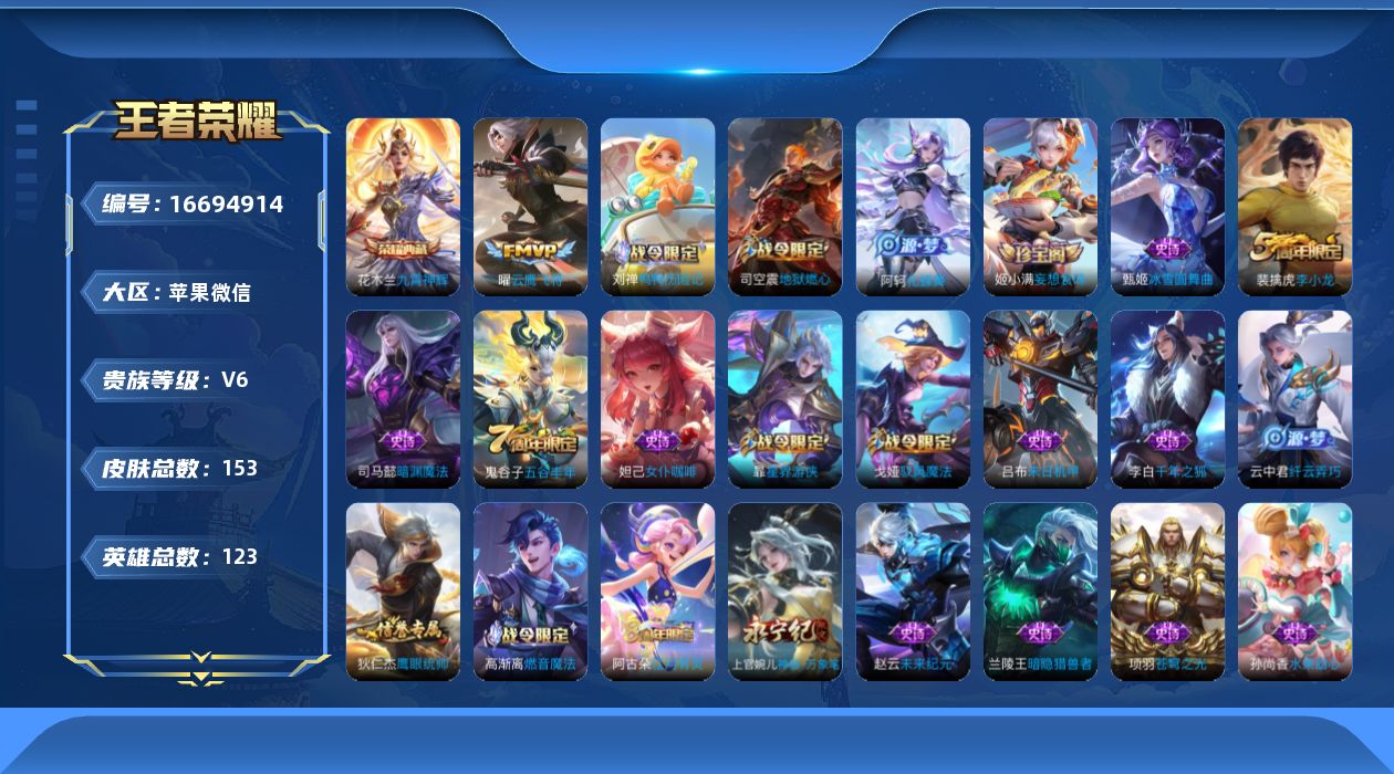 [16694914]【店主推荐捡漏号!可直接换绑】苹果WX-V6-最强王者段位-123英雄-153皮肤-1典藏皮肤-1传说-40史诗