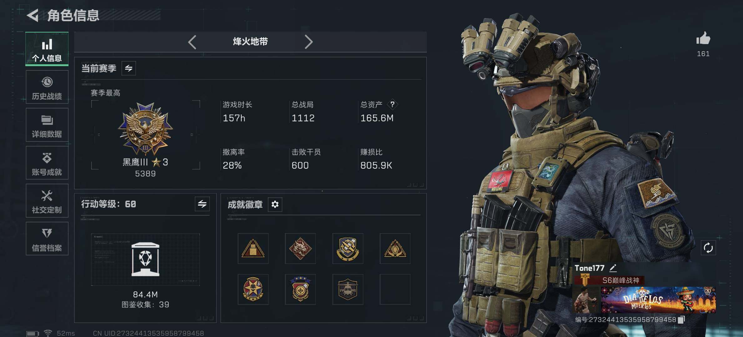 [16695376]【店主推荐捡漏号】165m总资产-180k哈伏币-60烽火等级-黑鹰-23战场等级-上等兵