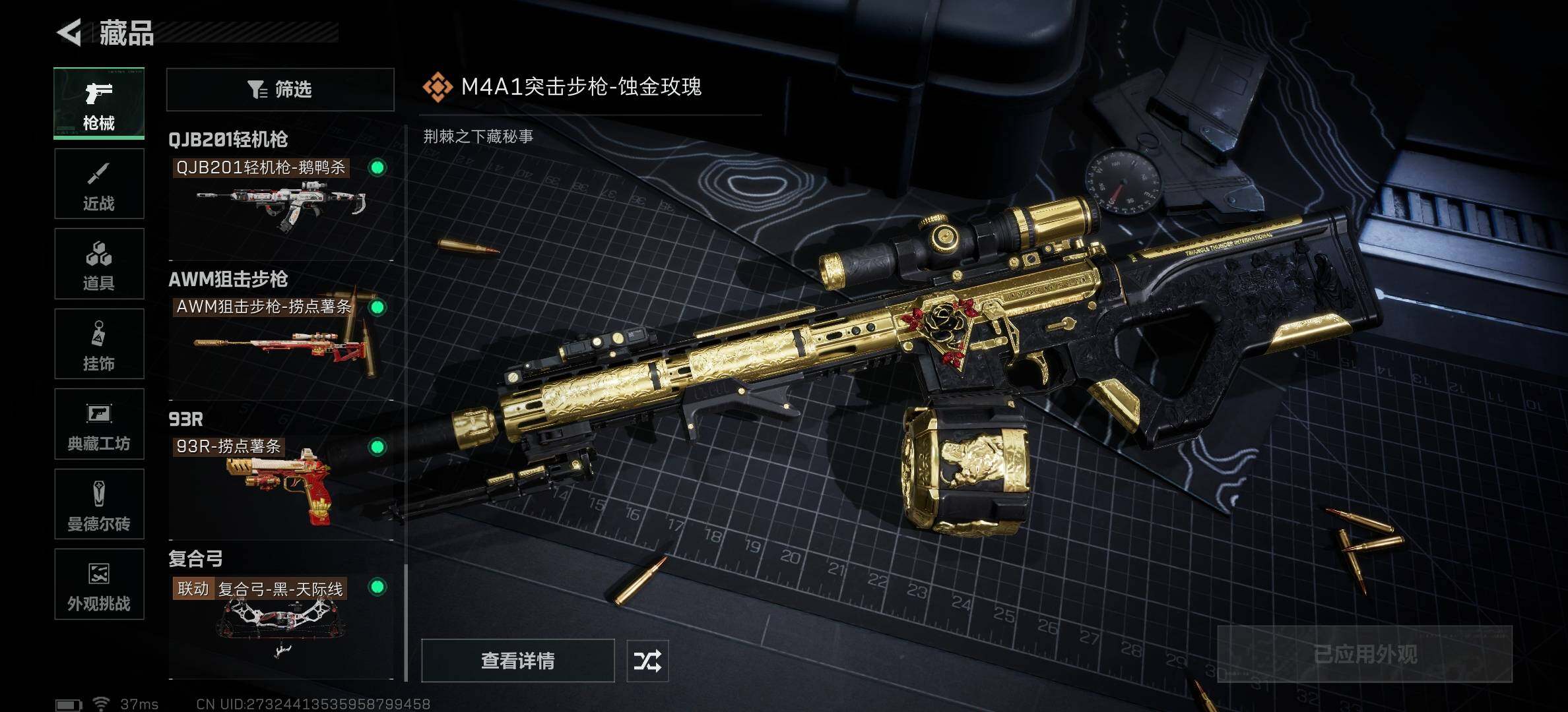 【传说外观】:M4A1突击步枪-蚀金玫瑰,M4A1突击步枪-阿米娅,ASh-12战斗步枪-鹅鸭杀,SG552突击步枪-运动员,AK-12突击步枪-特斯拉线圈,SCAR-H战斗步枪-启航,G3战斗步枪-骑士,CAR-15突击步枪-阿米娅,腾龙突击步枪-捞点薯条,K437突击步枪-北极星,KC17突击步枪-电锯惊魂,UZI冲锋枪-特斯拉线圈,SR-3M紧凑突击步枪-特斯拉线圈,勇士冲锋枪-能天使-午夜邮差,QCQ171冲锋枪-北极星,QCQ171冲锋枪-鹅鸭杀,725双管霰弹枪-送葬人-无题密令,M250通用机枪-骑士之心,QJB201轻机枪-鹅鸭杀,AWM狙击步枪-捞点薯条,93R-捞点薯条,复合弓-黑·天际线