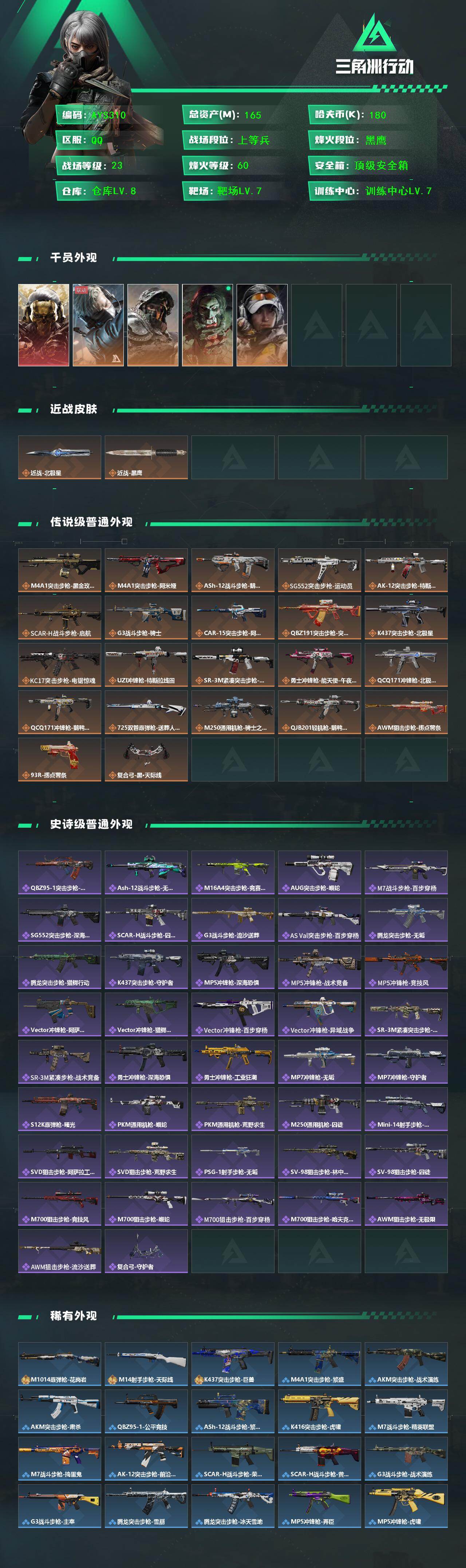 [16695376]【店主推荐捡漏号】165m总资产-180k哈伏币-60烽火等级-黑鹰-23战场等级-上等兵 【干员外观】:红狼-蚀金玫瑰,蜂医-送葬人·无题密令,深蓝-不破誓约,红狼-电锯惊魂,露娜-金牌射手 【近战皮肤】:近战-北极星,近战-黑鹰 【传说外观】:M4A1突击步枪-蚀金玫瑰,M4A1突击步枪-阿米娅,ASh-12战斗步枪-鹅鸭杀,SG552突击步枪-运动员,AK-12突击步枪-特斯拉线圈,SCAR-H战斗步枪-启航,G3战斗步枪-骑士,CAR-15突击步枪-阿米娅,腾龙突击步枪-捞点薯条,K437突击步枪-北极星,KC17突击步枪-电锯惊魂,UZI冲锋枪-特斯拉线圈,SR-3M紧凑突击步枪-特斯拉线圈,勇士冲锋枪-能天使-午夜邮差,QCQ171冲锋枪-北极星,QCQ171冲锋枪-鹅鸭杀,725双管霰弹枪-送葬人-无题密令,M250通用机枪-骑士之心,QJB201轻机枪-鹅鸭杀,AWM狙击步枪-捞点薯条,93R-捞点薯条,复合弓-黑·天际线 【史诗外观】:QBZ95-1突击步枪-曙光,ASh-12战斗步枪-无极限,M16A4突击步枪-竞赛选手,AUG突击步枪-蝮蛇,M7战斗步枪-百步穿杨,SG552突击步枪-深海恐惧,SCAR-H战斗步枪-囚徒,G3战斗步枪-流沙送葬,AS Val突击步枪-百步穿杨,腾龙突击步枪-无垢,腾龙突击步枪-猎鳄行动,K437突击步枪-守护者,MP5冲锋枪-深海恐惧,MP5冲锋枪-战术竞备,MP5冲锋枪-竞技风,Vector冲锋枪-阿萨拉文明,Vector冲锋枪-猎鳄行动,Vector冲锋枪-百步穿杨,Vector冲锋枪-异域战争,SR-3M紧凑突击步枪-荒野求生,SR-3M紧凑突击步枪-战术竞备,勇士冲锋枪-深海恐惧,勇士冲锋枪-工业狂潮,MP7冲锋枪-无垢,MP7冲锋枪-守护者,S12K霰弹枪-曙光,PKM通用机枪-蝮蛇,PKM通用机枪-荒野求生,M250通用机枪-囚徒,Mini-14射手步枪-守护者,SVD狙击步枪-阿萨拉工艺,SVD狙击步枪-荒野求生,PSG-1射手步枪-无垢,SV-98狙击步枪-林中猎手,SV-98狙击步枪-囚徒,M700狙击步枪-竞技风,M700狙击步枪-蝮蛇,M700狙击步枪-百步穿杨,M700狙击步枪-哈夫克警备,AWM狙击步枪-无极限,AWM狙击步枪-流沙送葬,复合弓-守护者 【稀有外观】:M1014霰弹枪